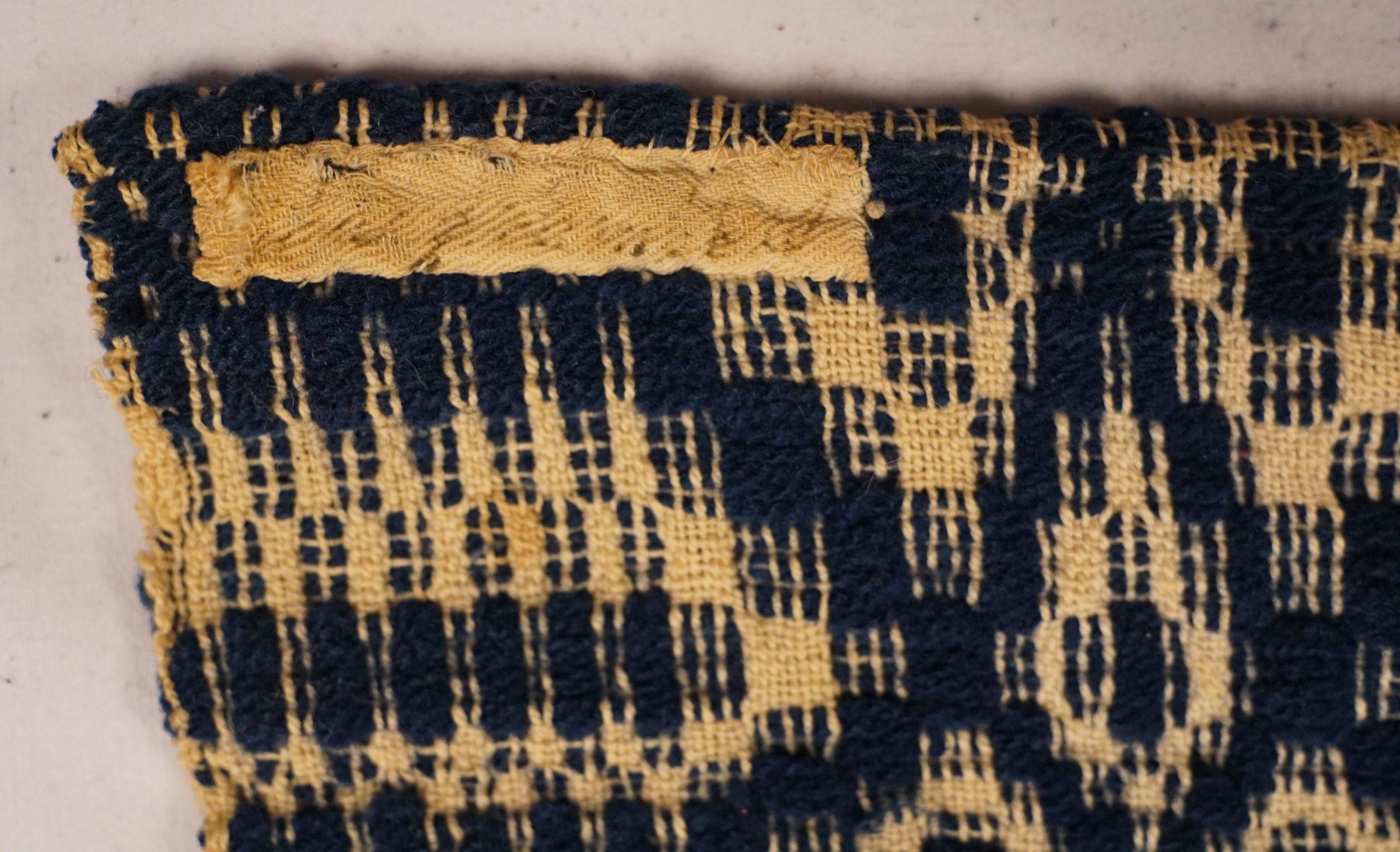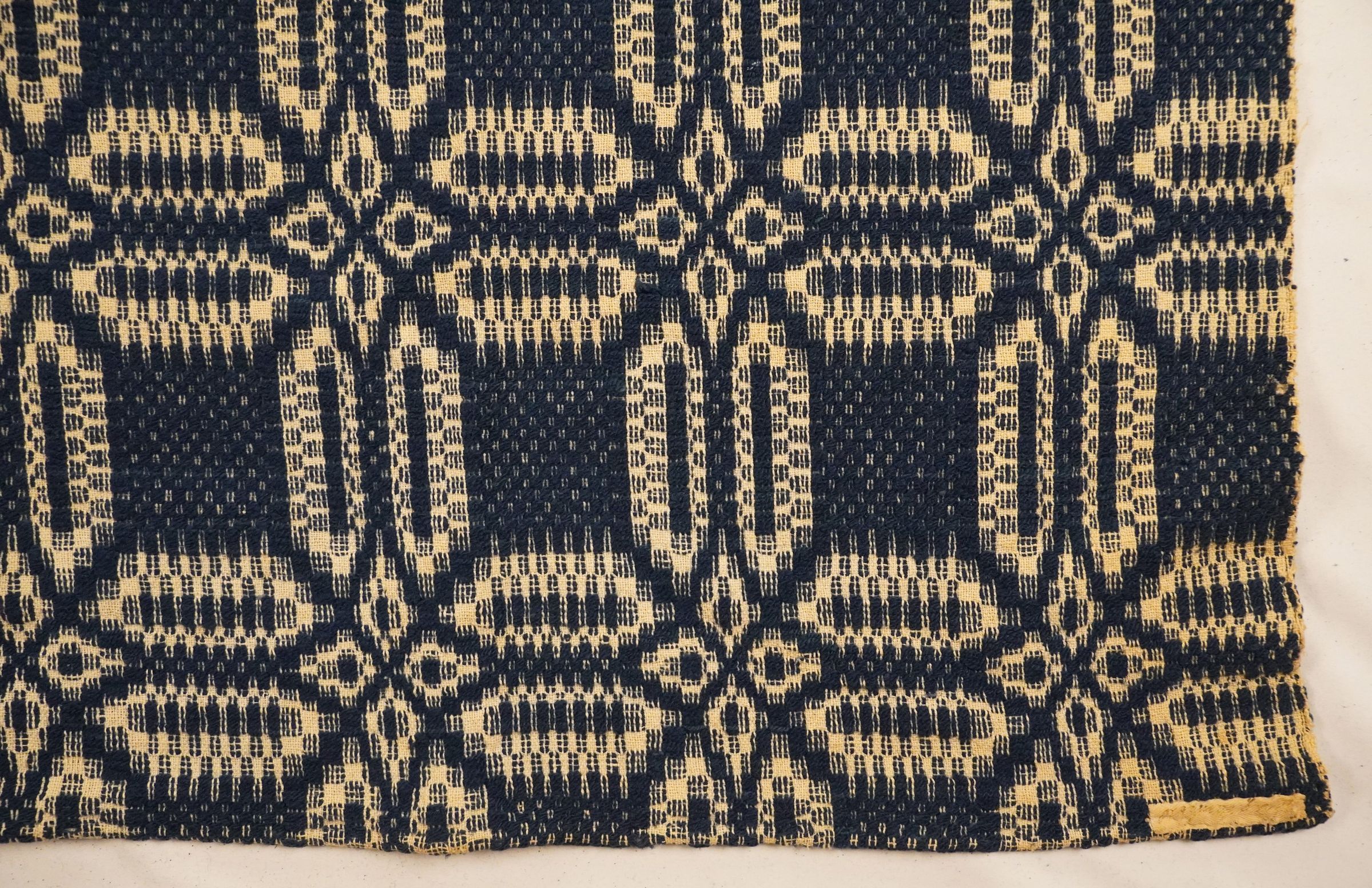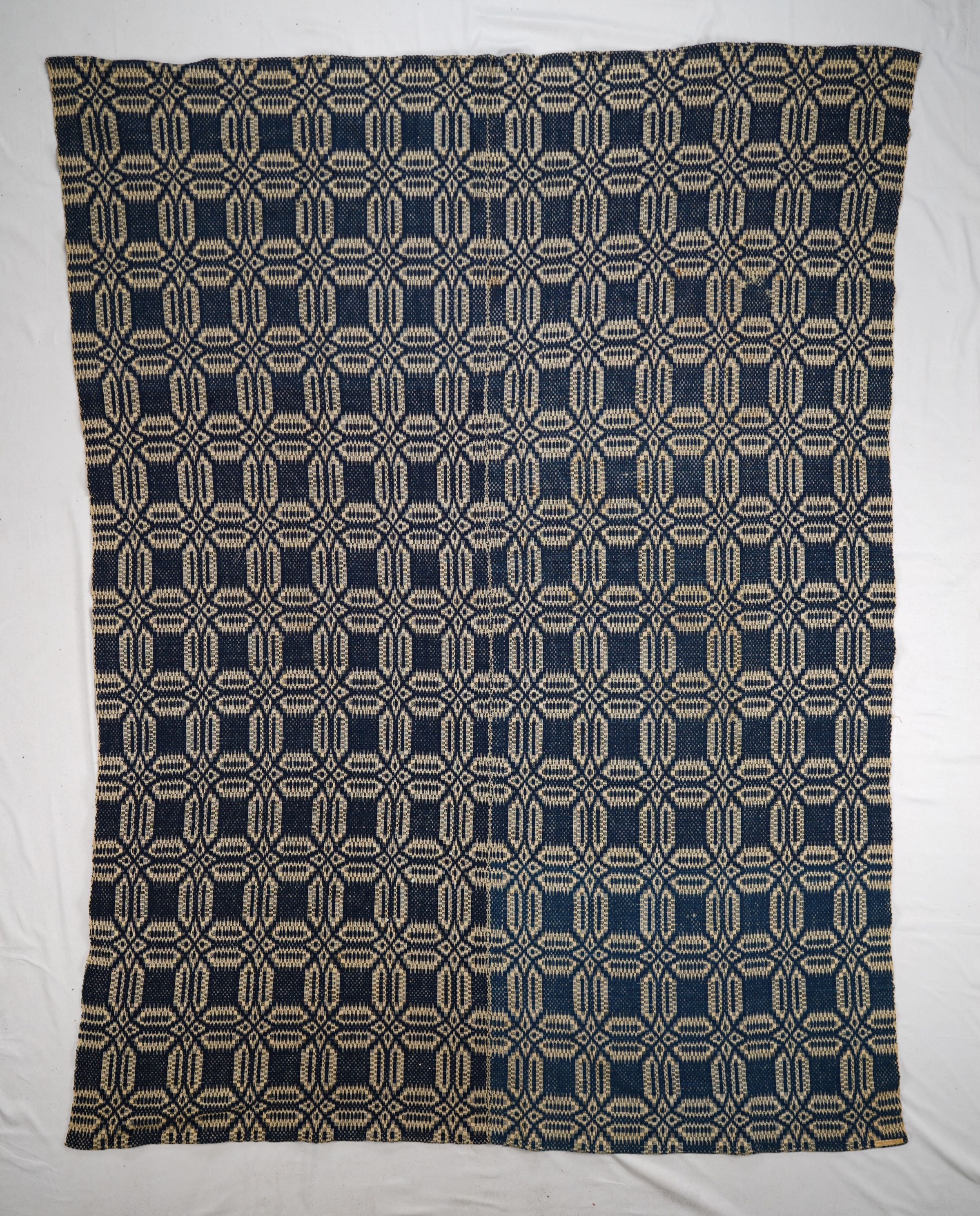 Natural and navy geometric overshot coverlet; two panels joined by a center seam. No fringe or border.