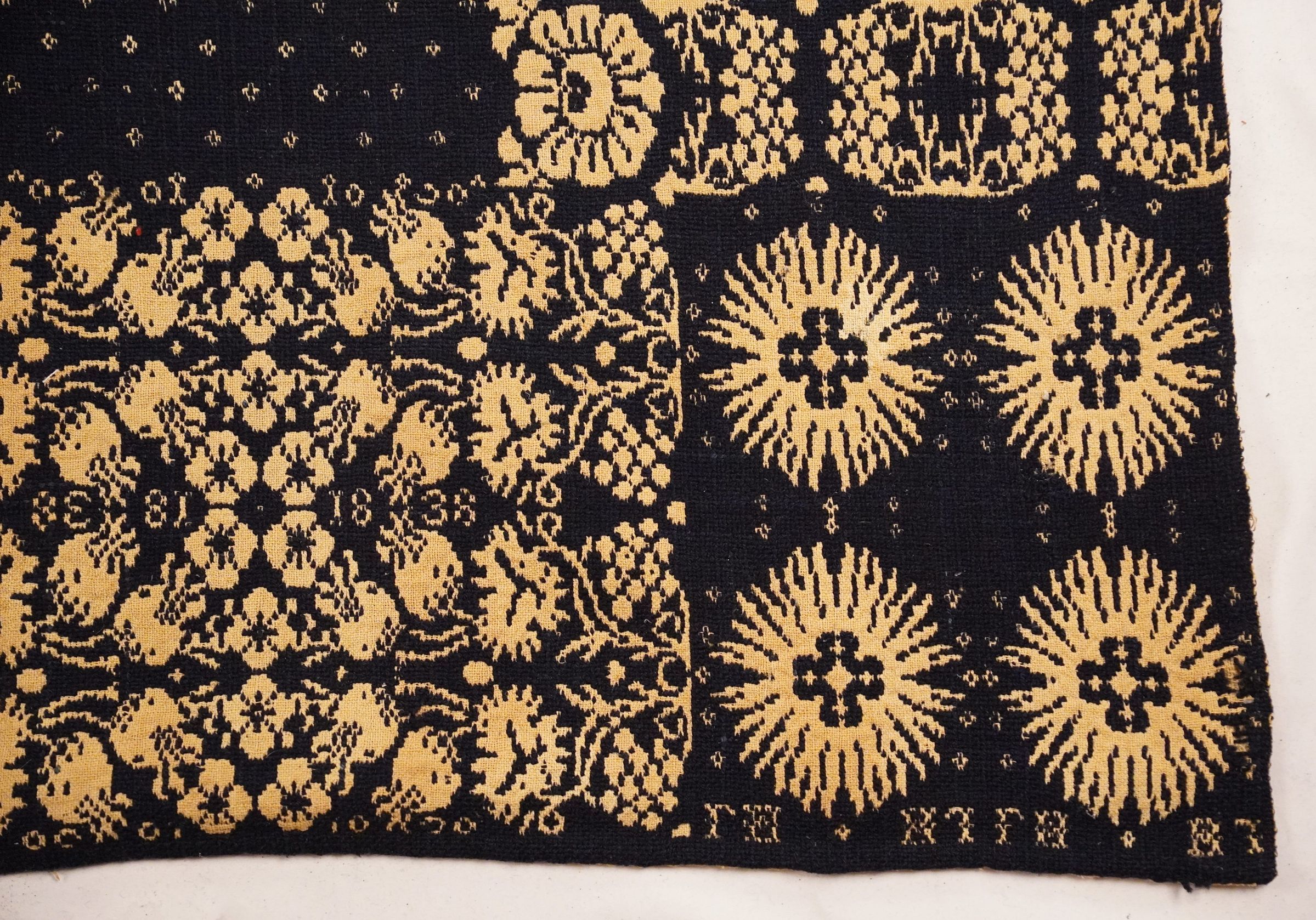 Natural and navy figured double weave coverlet; two panels joined by a center seam. Border on four sides; no fringe.Collection
