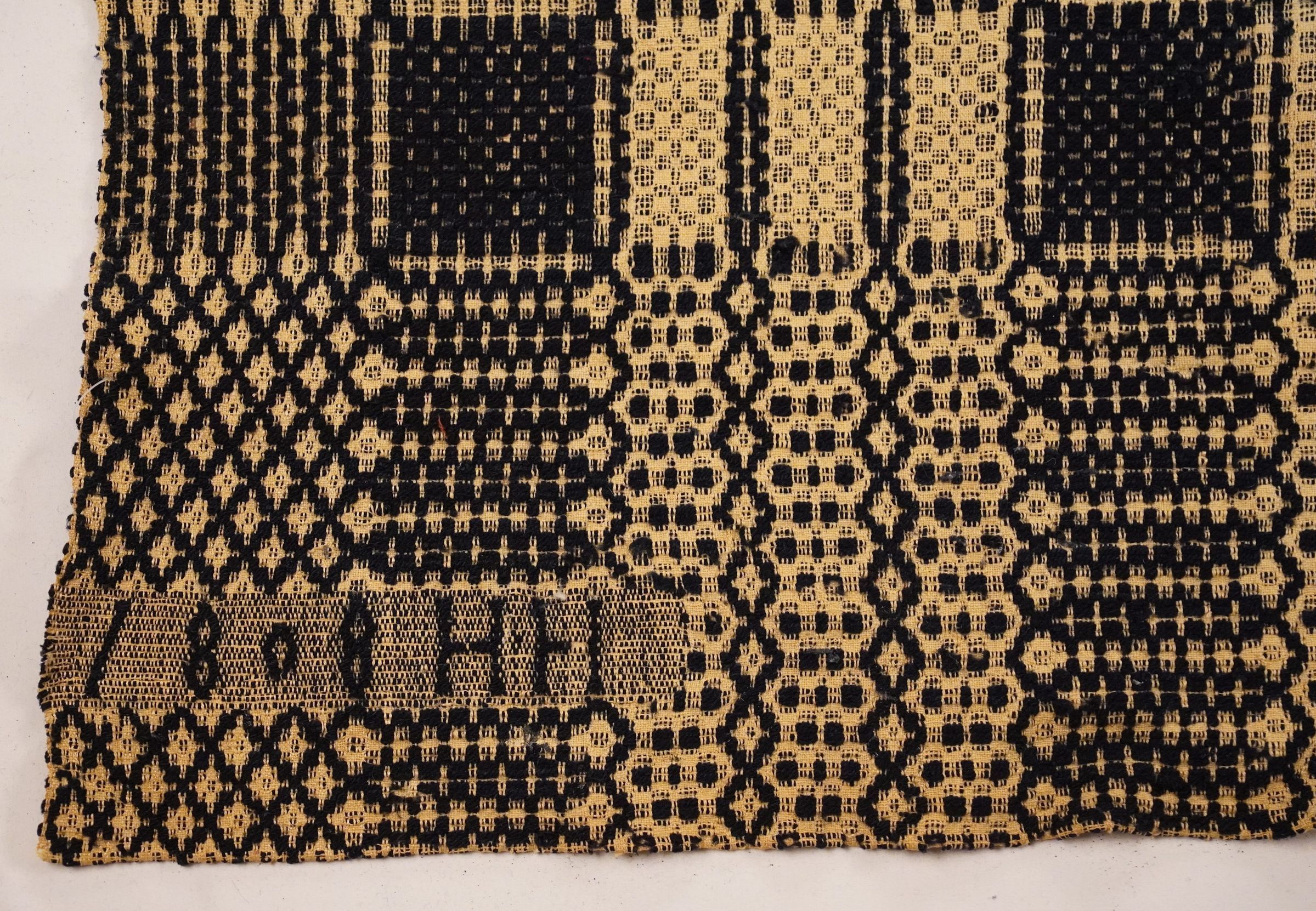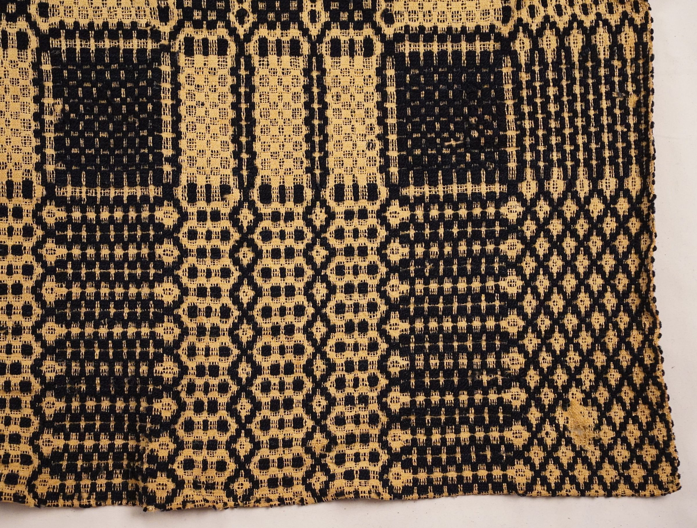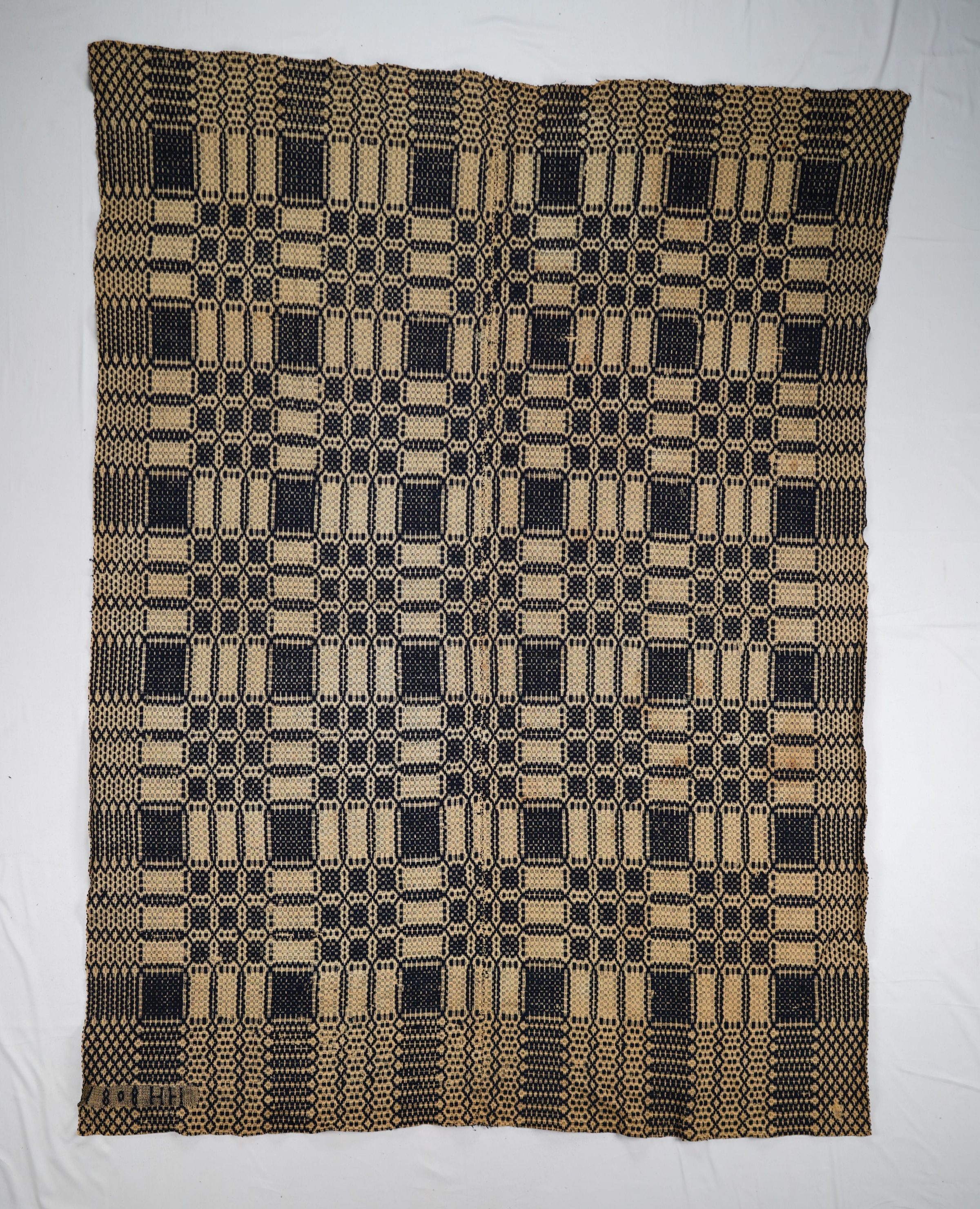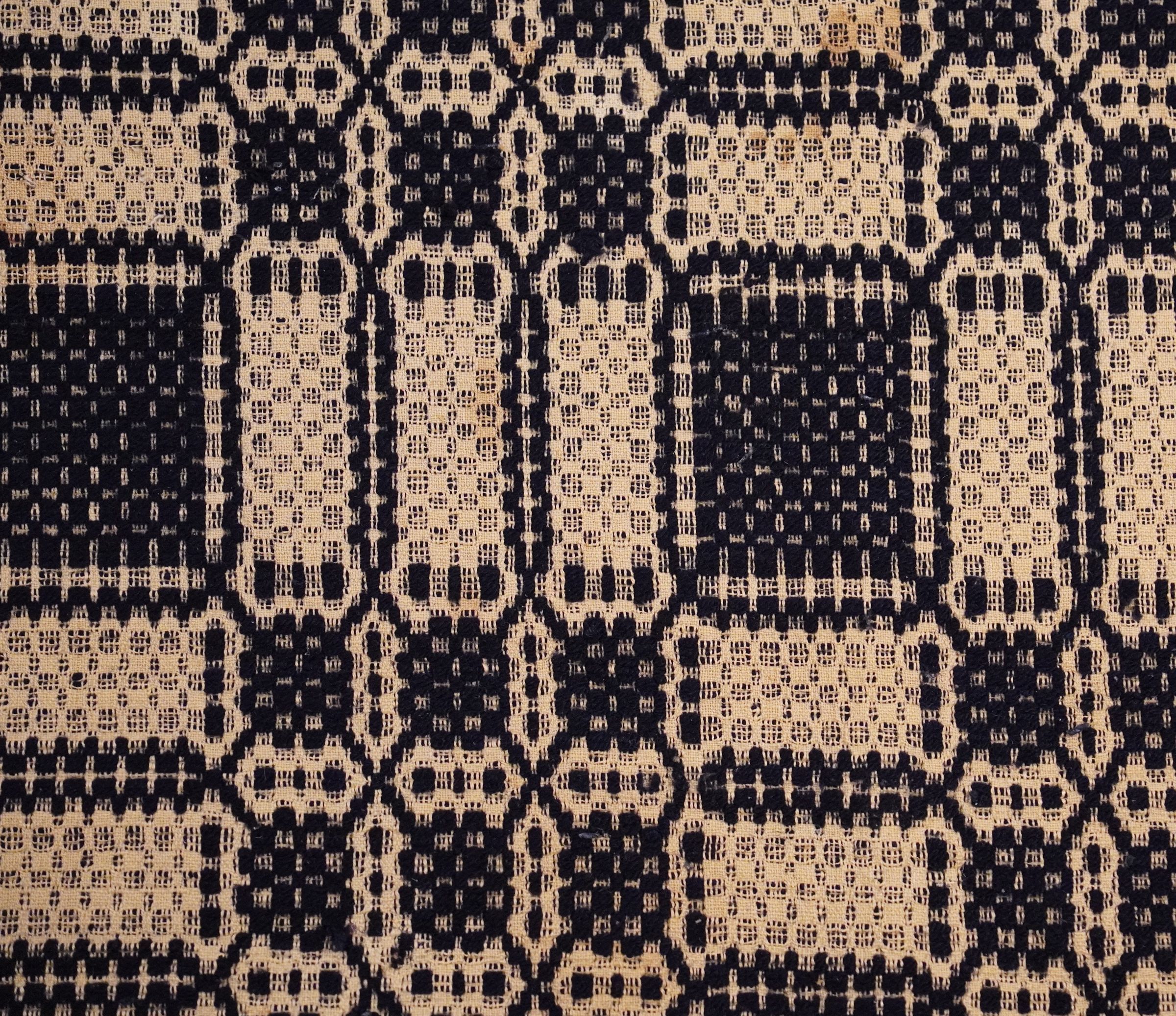Natural and navy geometric overshot coverlet; two panels joined by a center seam. Border on four sides; no fringe.Collection