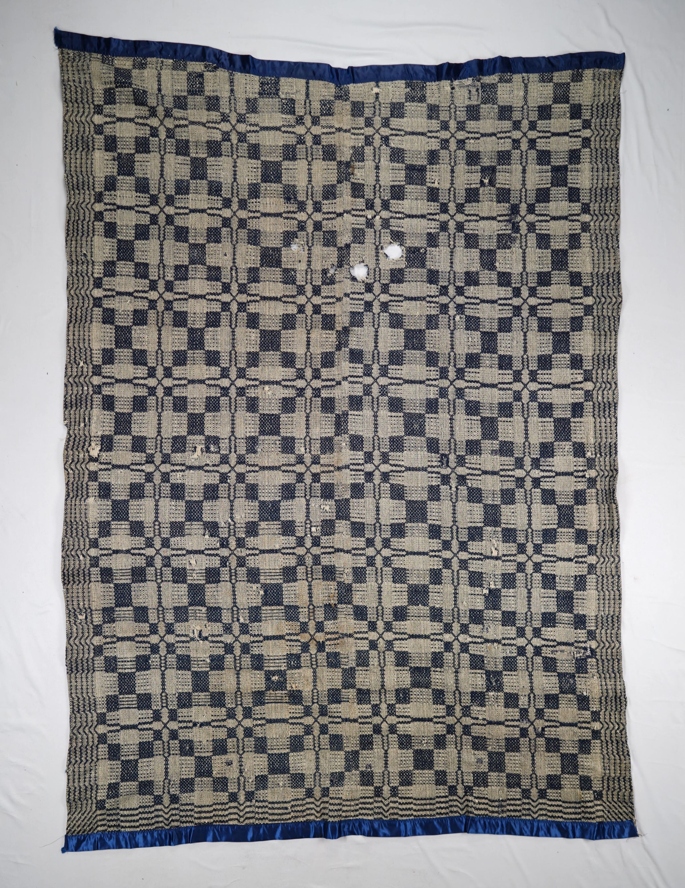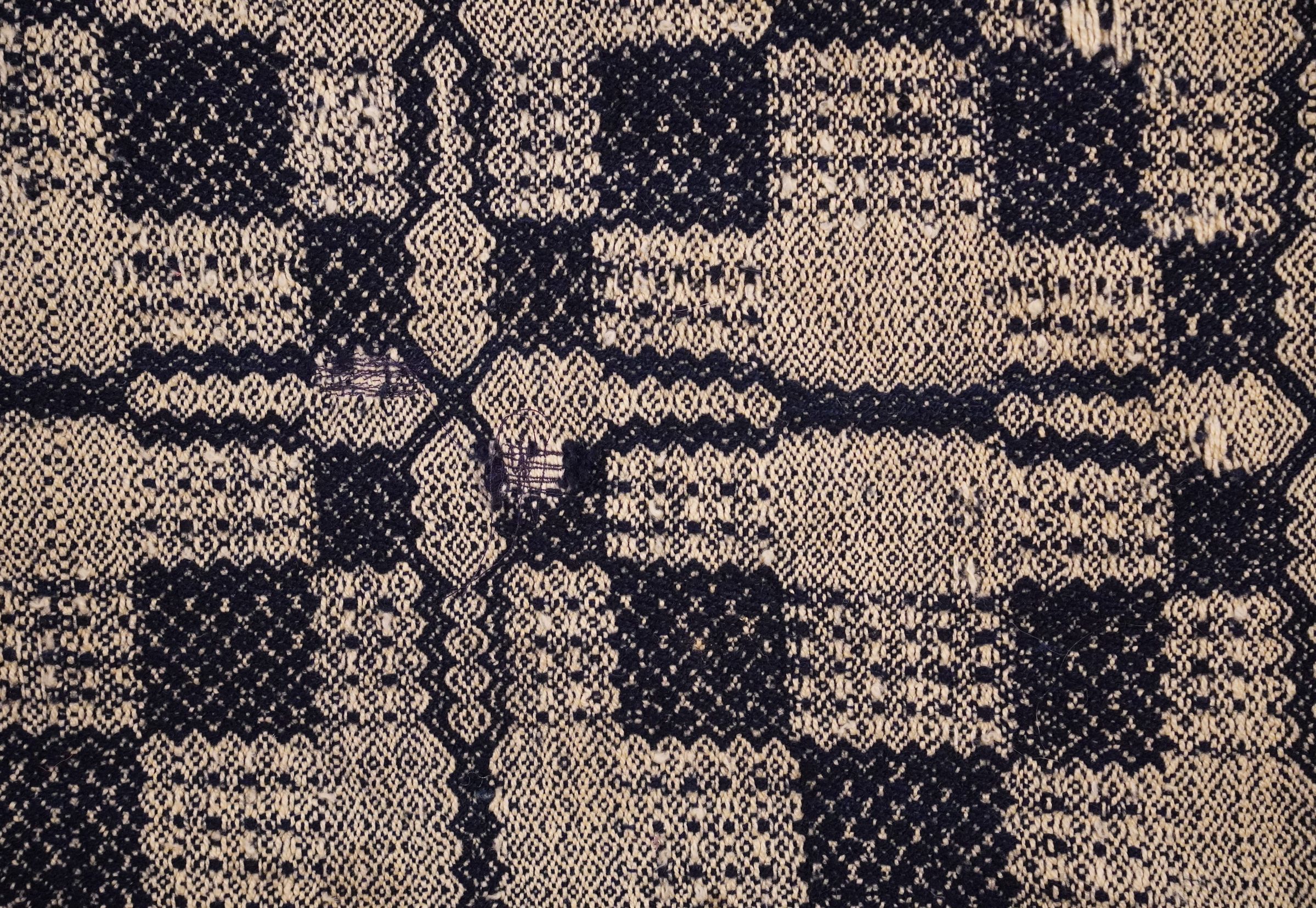 Natural and navy geometric gebrochene coverlet; two panels joined by a center seam; border on three sides; no fringe.