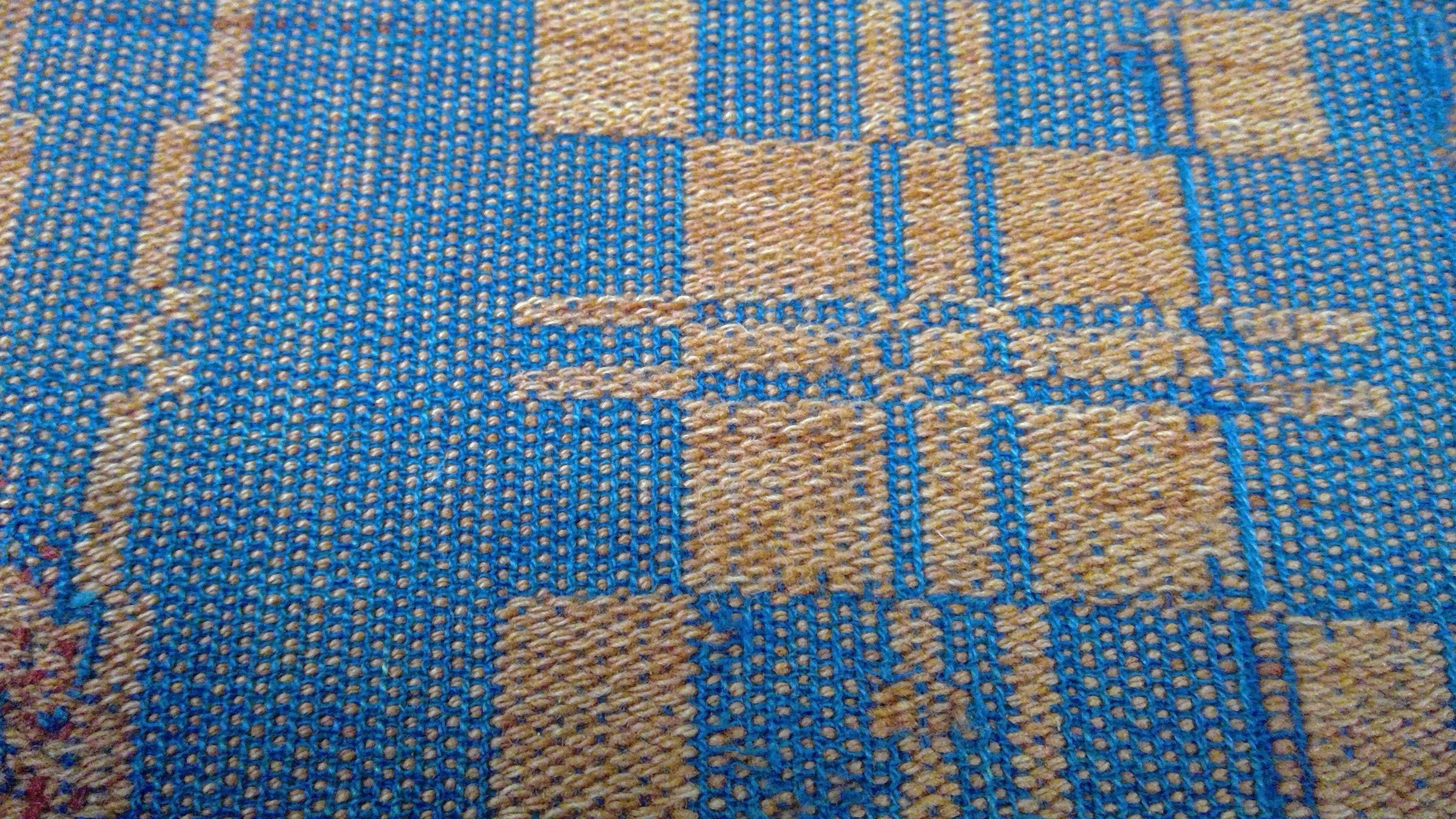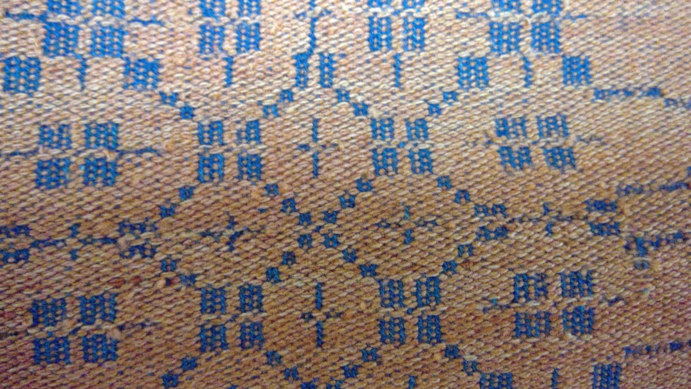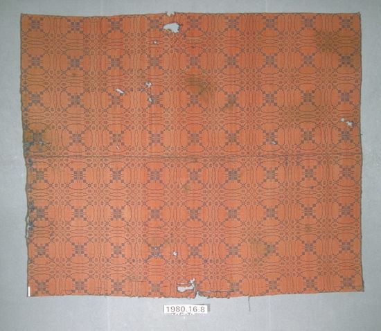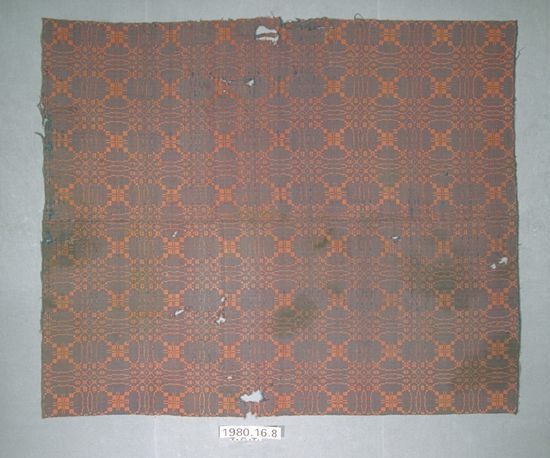 Summer and winter coverlet; blue and orange wool. Center seam joins two panels. Selvedges on either side; top and bottom hemmed. Central motif contains a table surrounded by a ring. Outisde of the ring, at each corner, there is a diamond motif. Lines within coverlet form overall diamond pattern.Collection