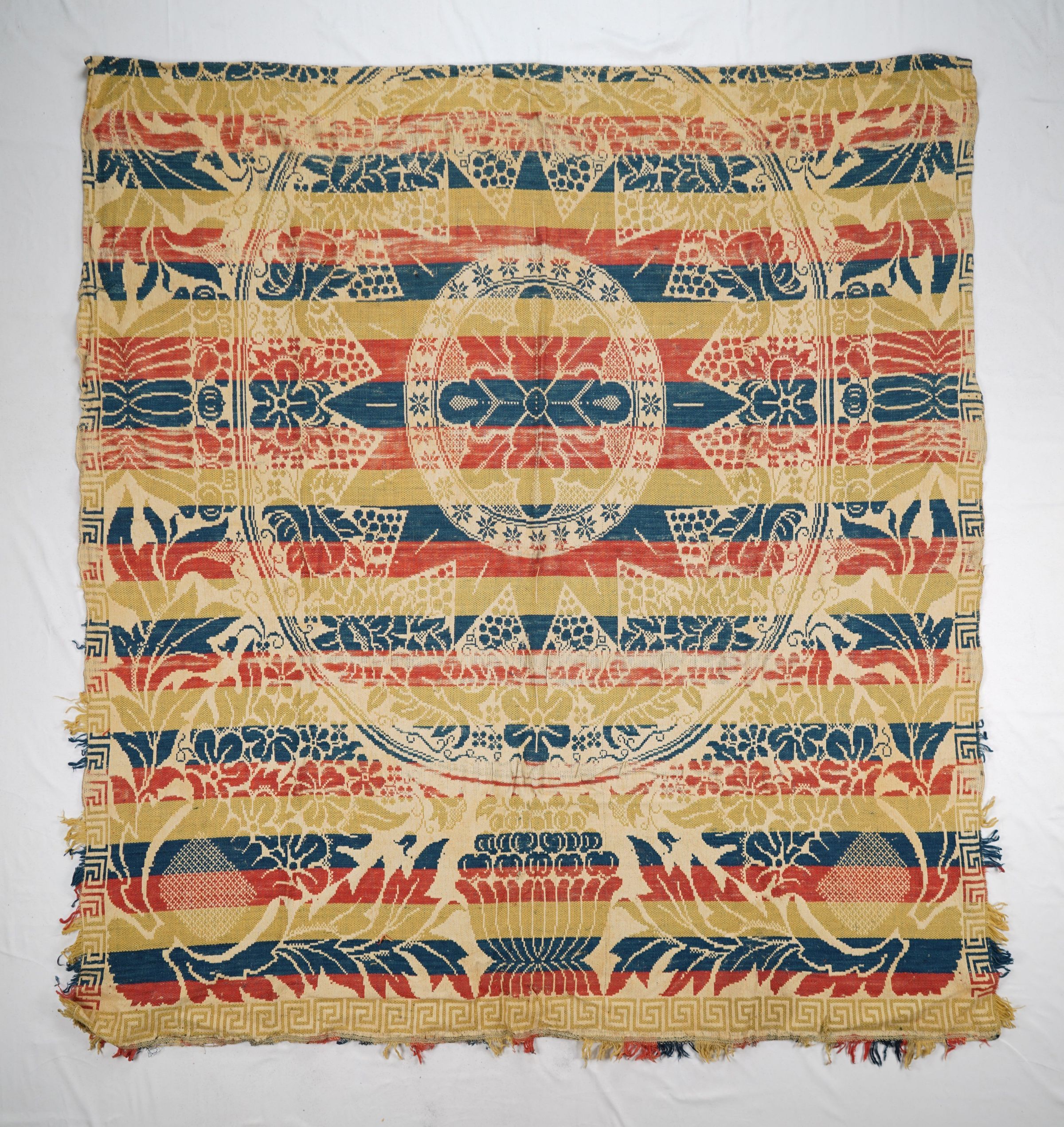 Natural, yellow, red, and blue figured true beiderwand coverlet; seamless. Border on three sides; poor fringe on three sides.Collection