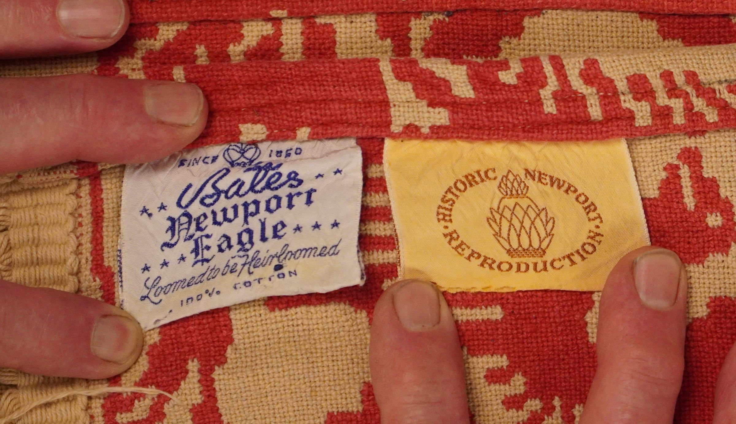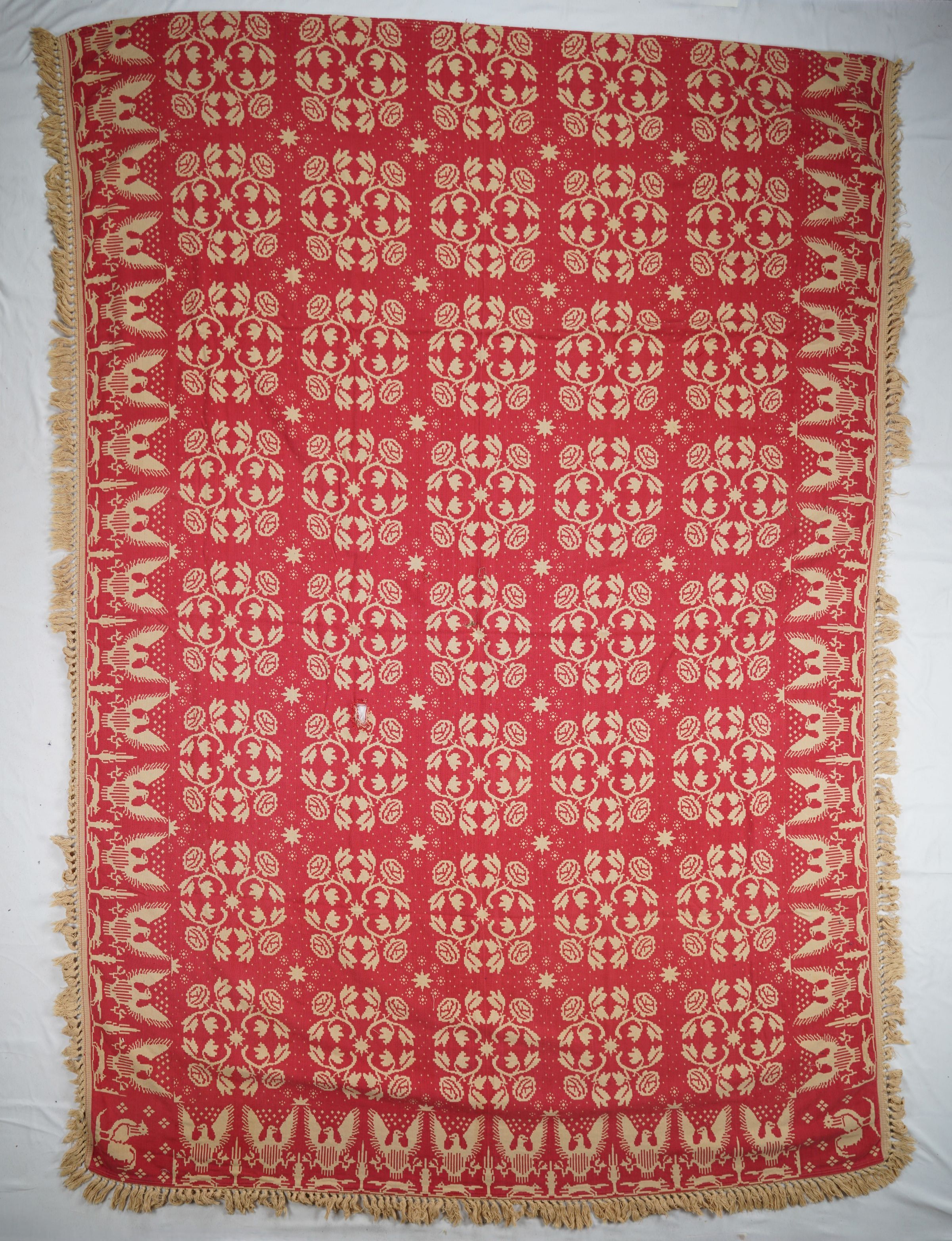 Natural and red figured double weave coverlet; seamless. Border and fringe on three sides. Historical reproduction coverlet by Bates. Newport Eagle line.Collection