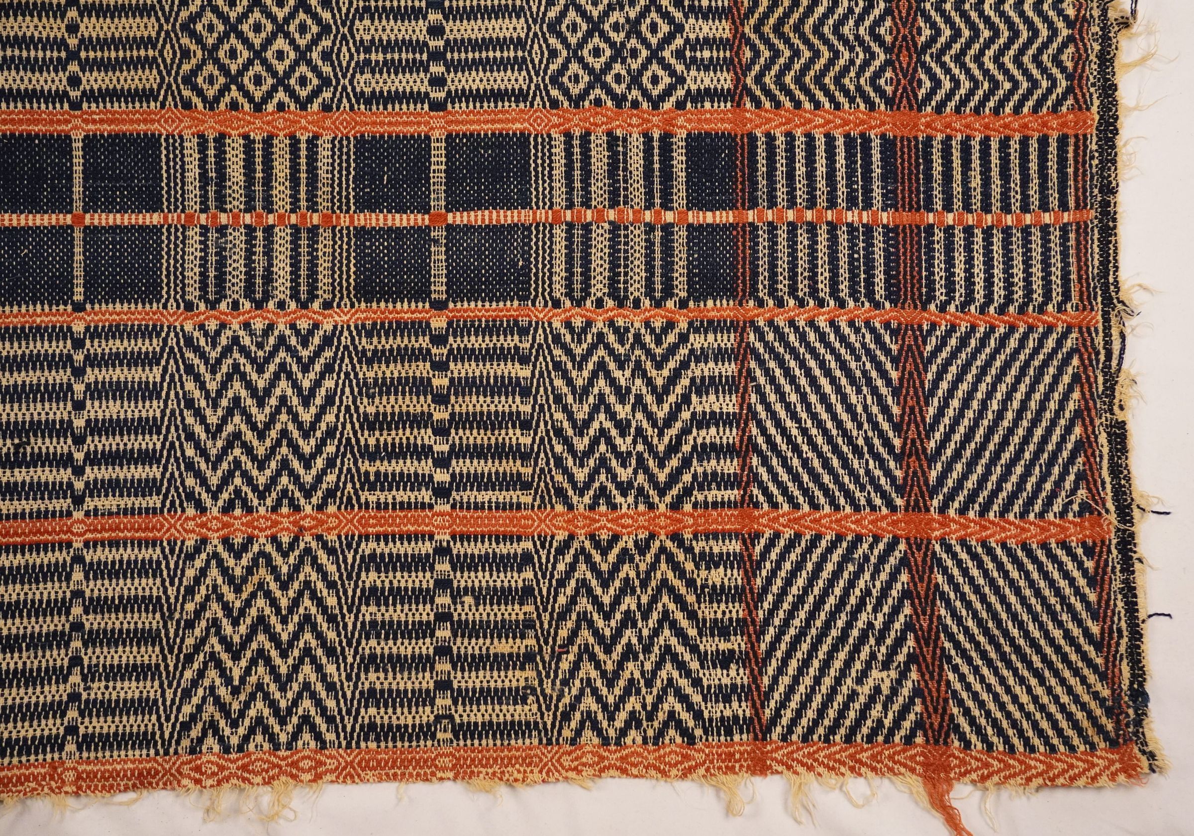 Natural, navy, and red geometric overshot coverlet; two panels joined by a center seam. Border on three sides; no fringe.