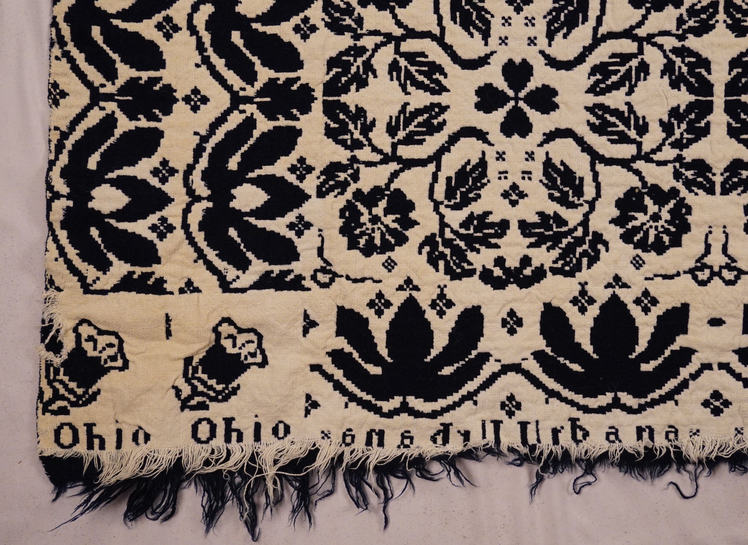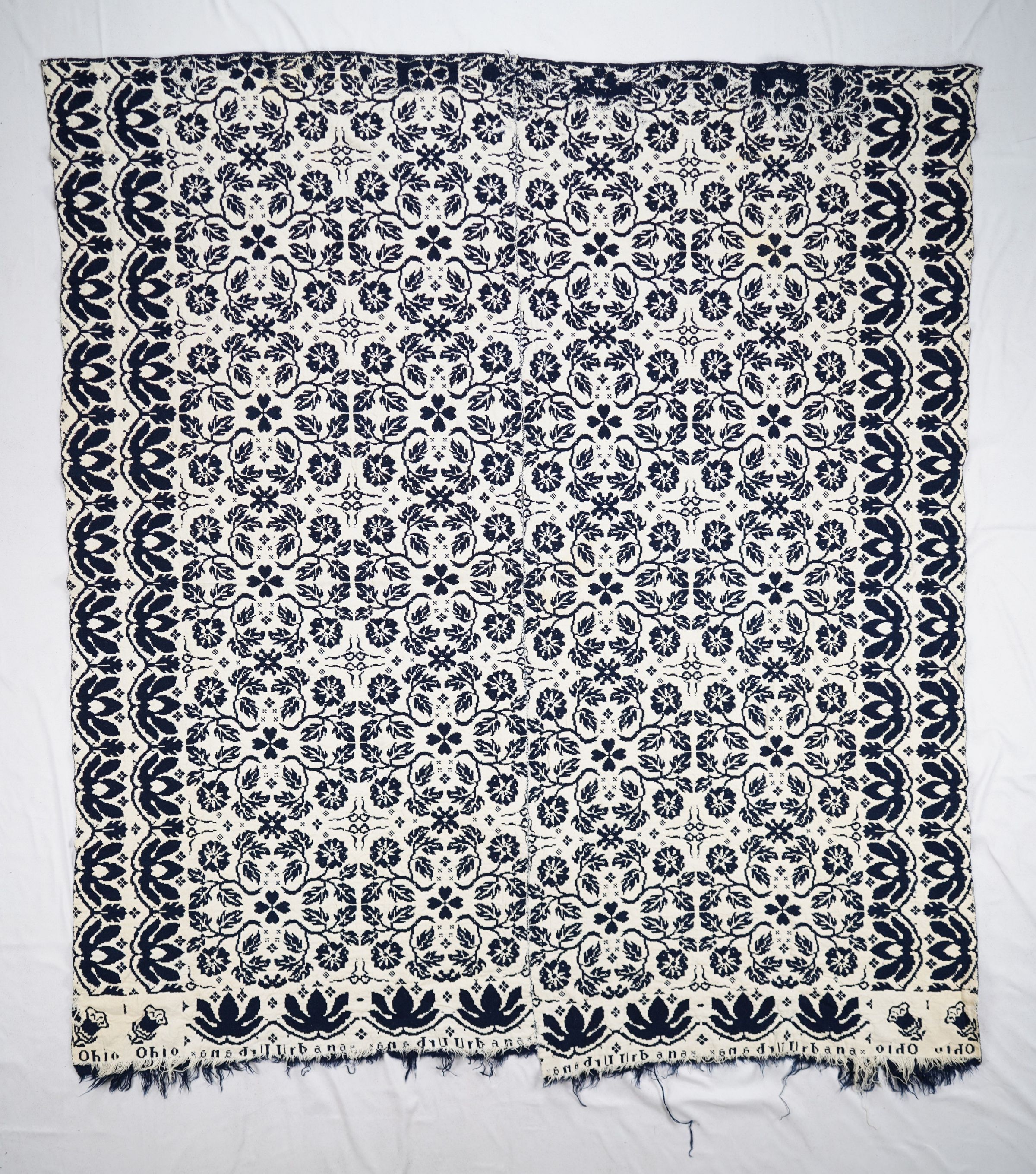 Navy and white figured double weave coverlet; two panels joined by a center seam. Border on three sides; fringe on bottom.Collection