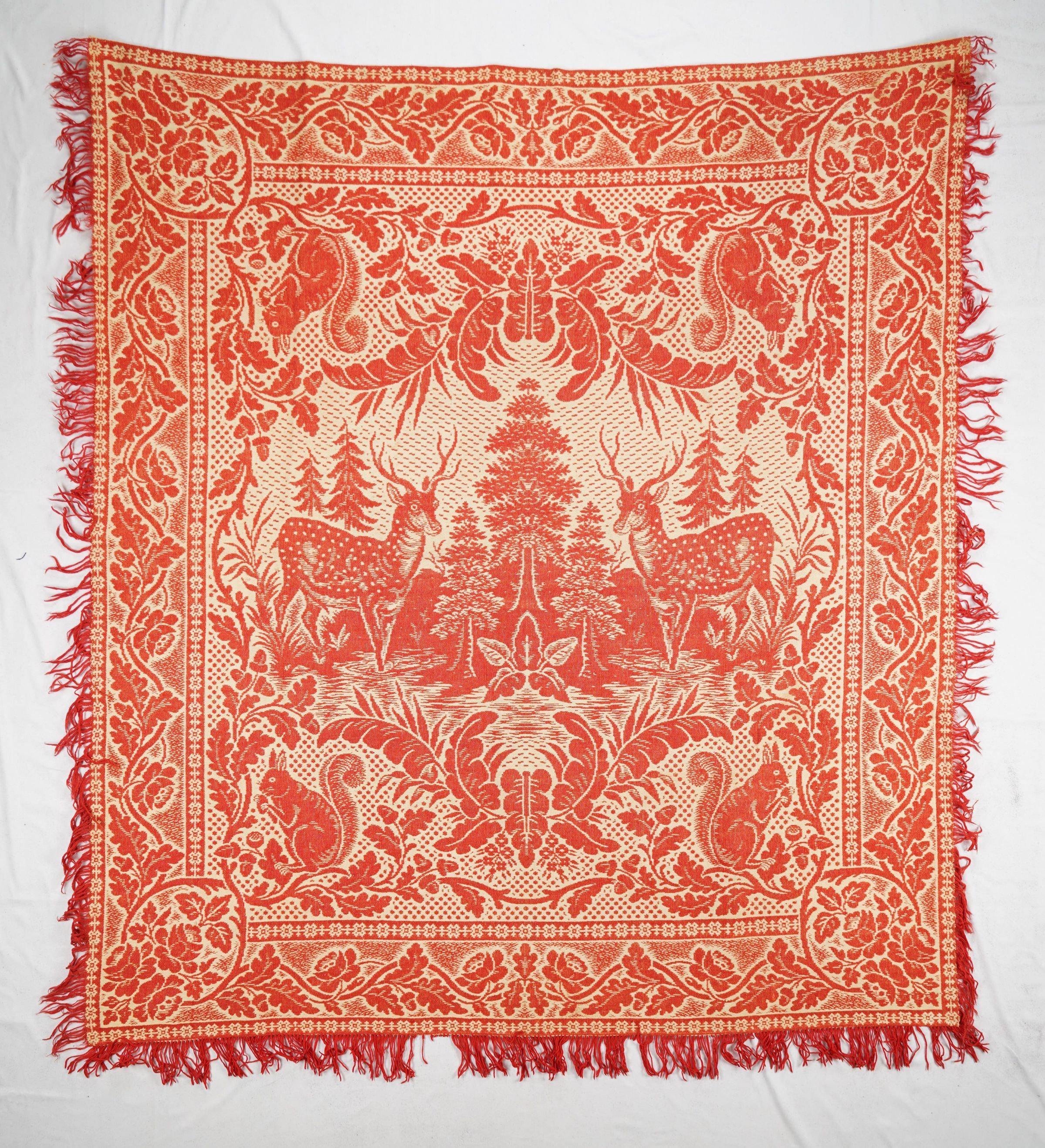 Natural and red figured double weave coverlet; seamless. Border on four sides; no fringe