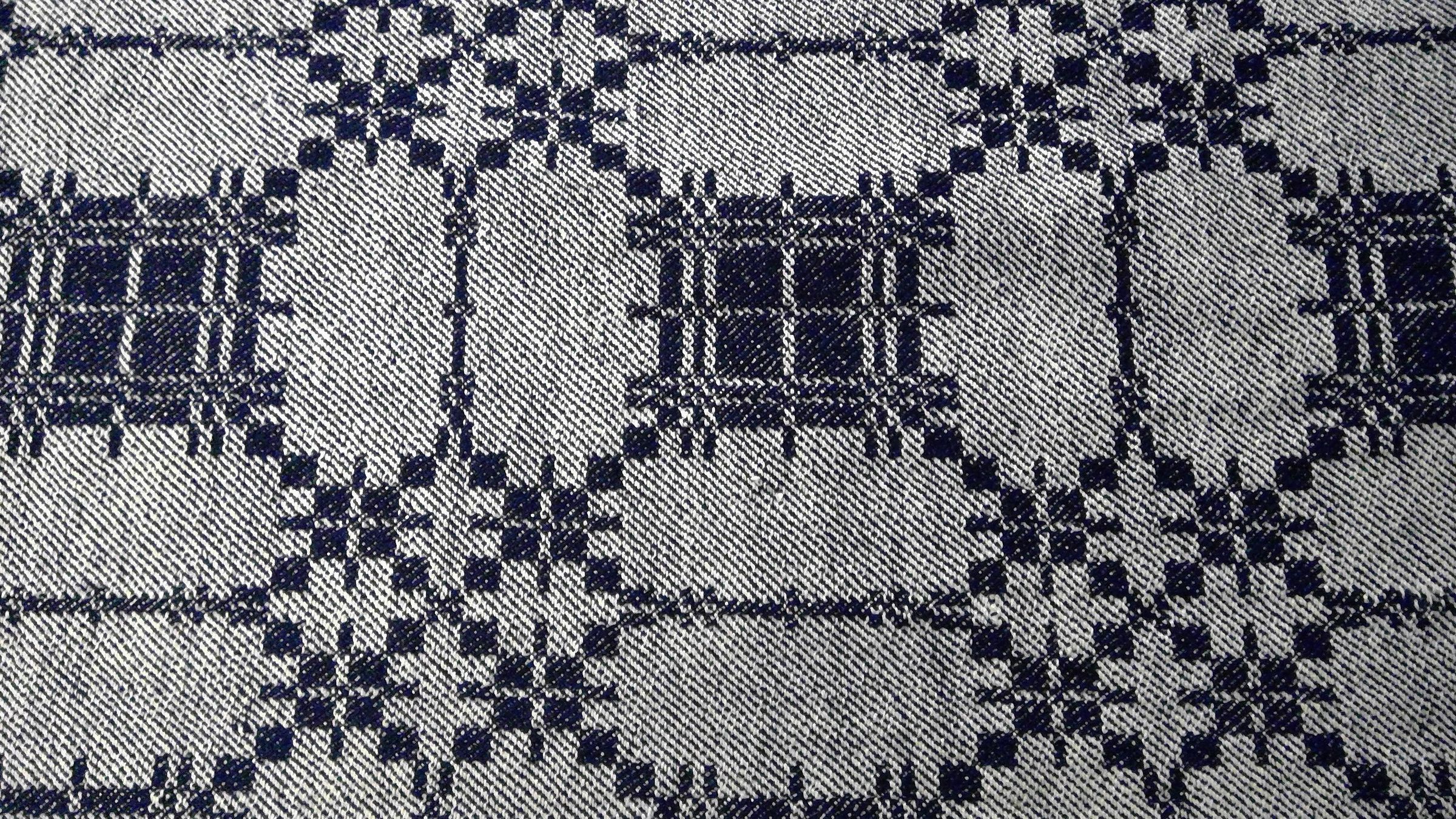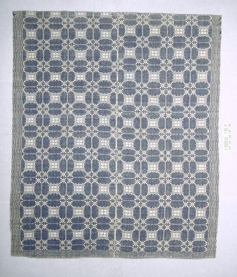 Coverlet; undyed cotton with blue wool, twill. Center seam joins two panels; seam does not match in areas because of a mistake in the pattern sequence. Selvedges on either side; hemmed top and bottom. Central motif is a block with a white and blue table at its center, bordered on the side by blue rectangles and at each corner there are smaller blue and white tables. Border on three sides sides is of arcing lines.