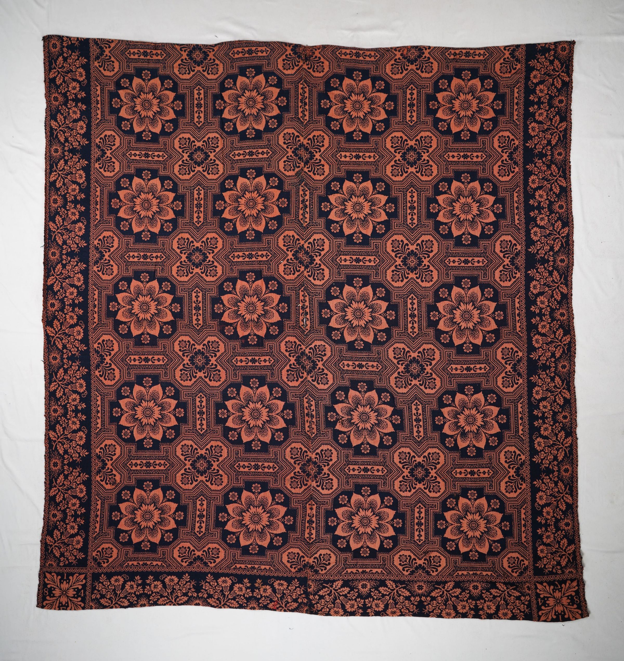Red and navy figured double weave coverlet; two panels joined by a center seam. Border on three sides; no fringe.Collection