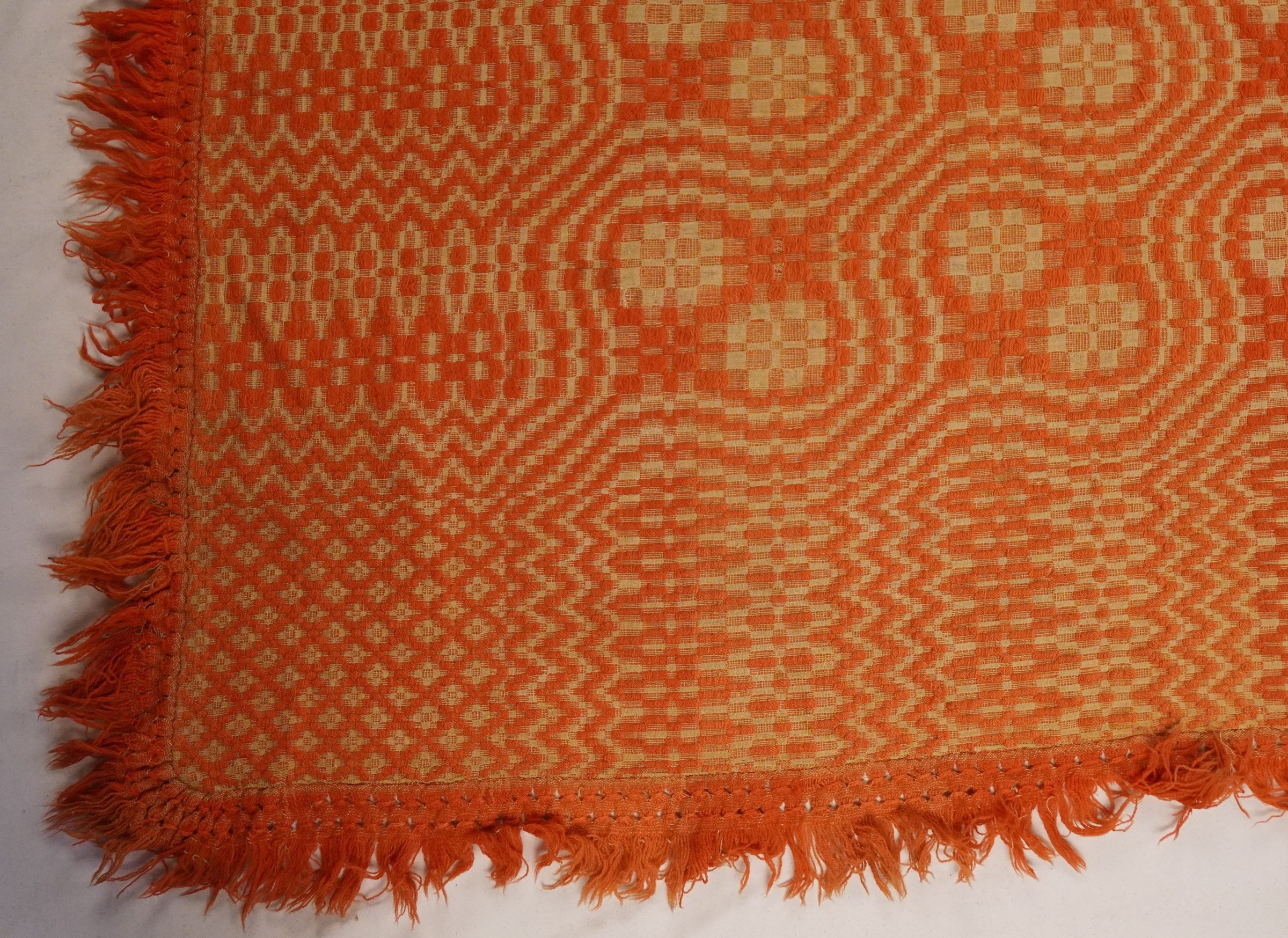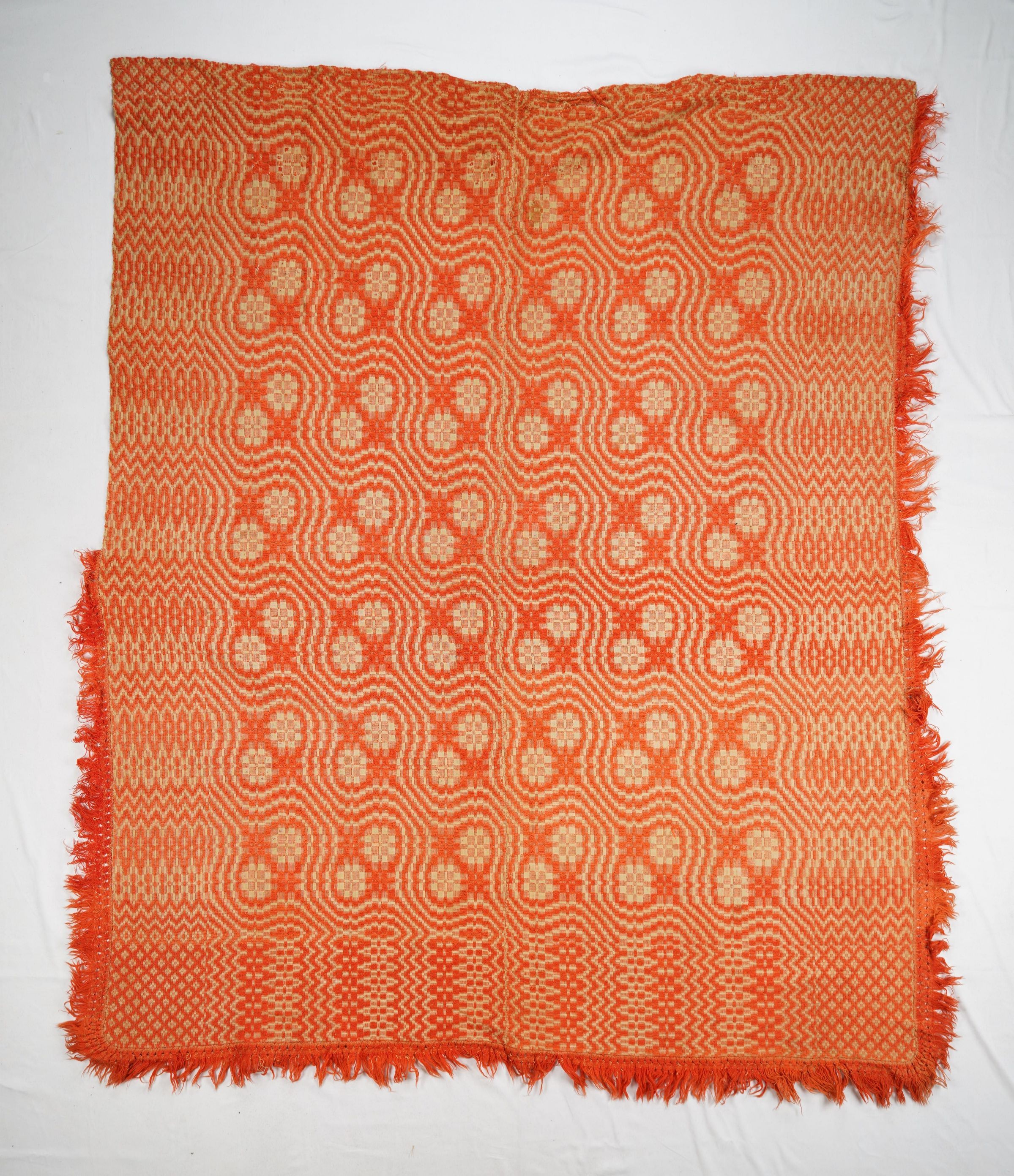 Natural and red geometric overshot coverlet; two panels joined by a center seam. Border on four sides; full fringe on two sides, runs out halfway up left side.Collection