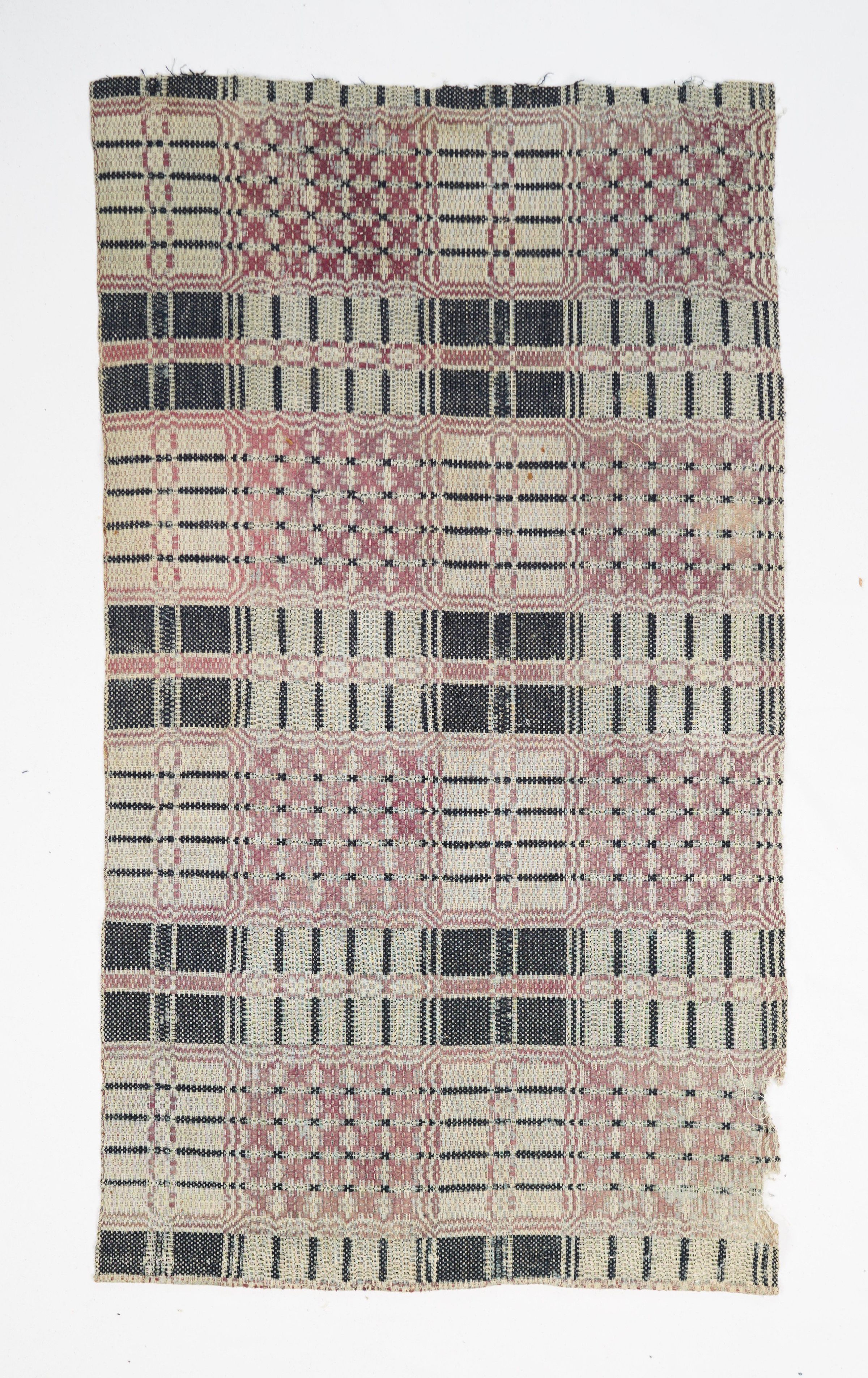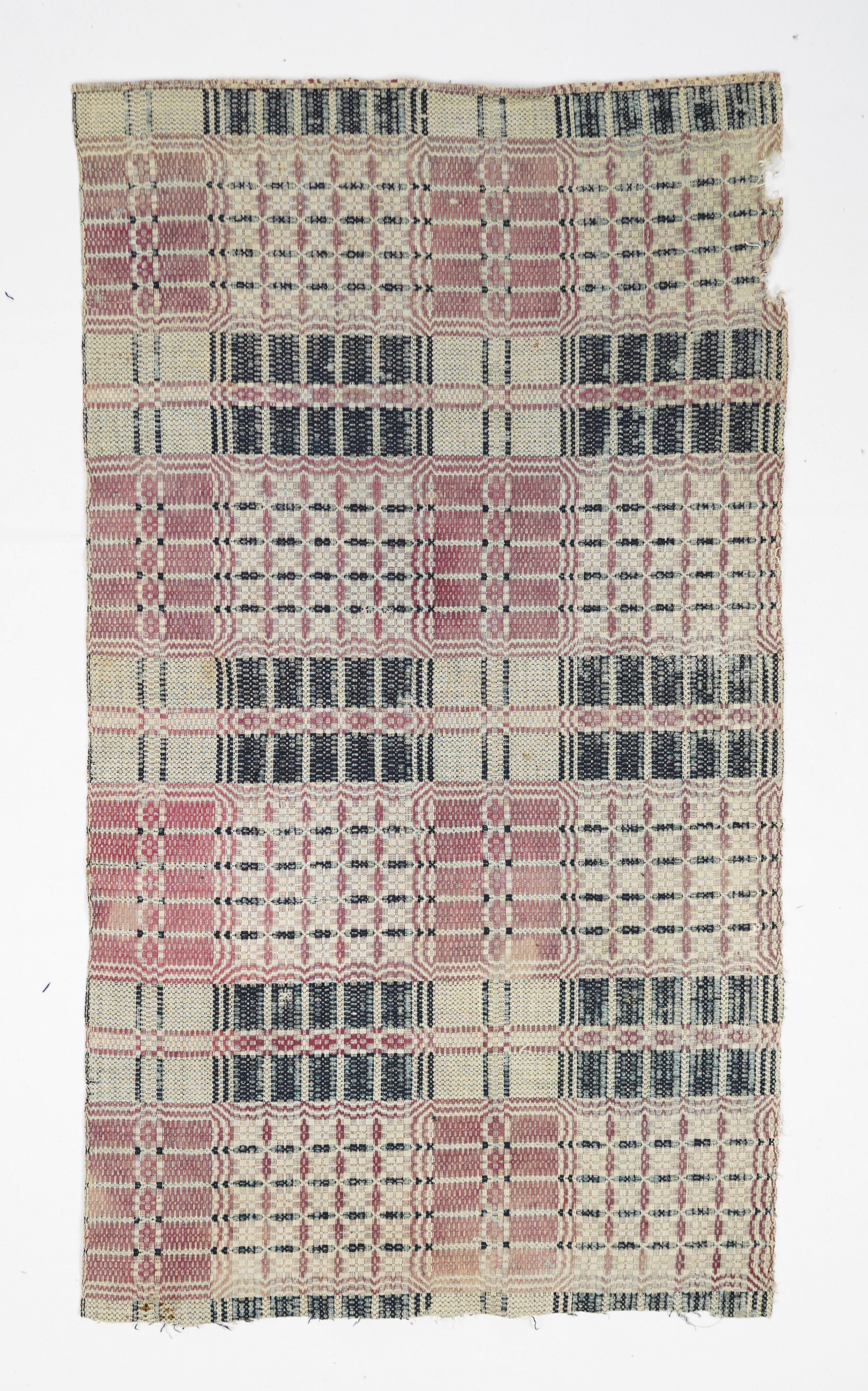 Natural, navy, and pink geometric coverlet; fragment. No border or fringe.