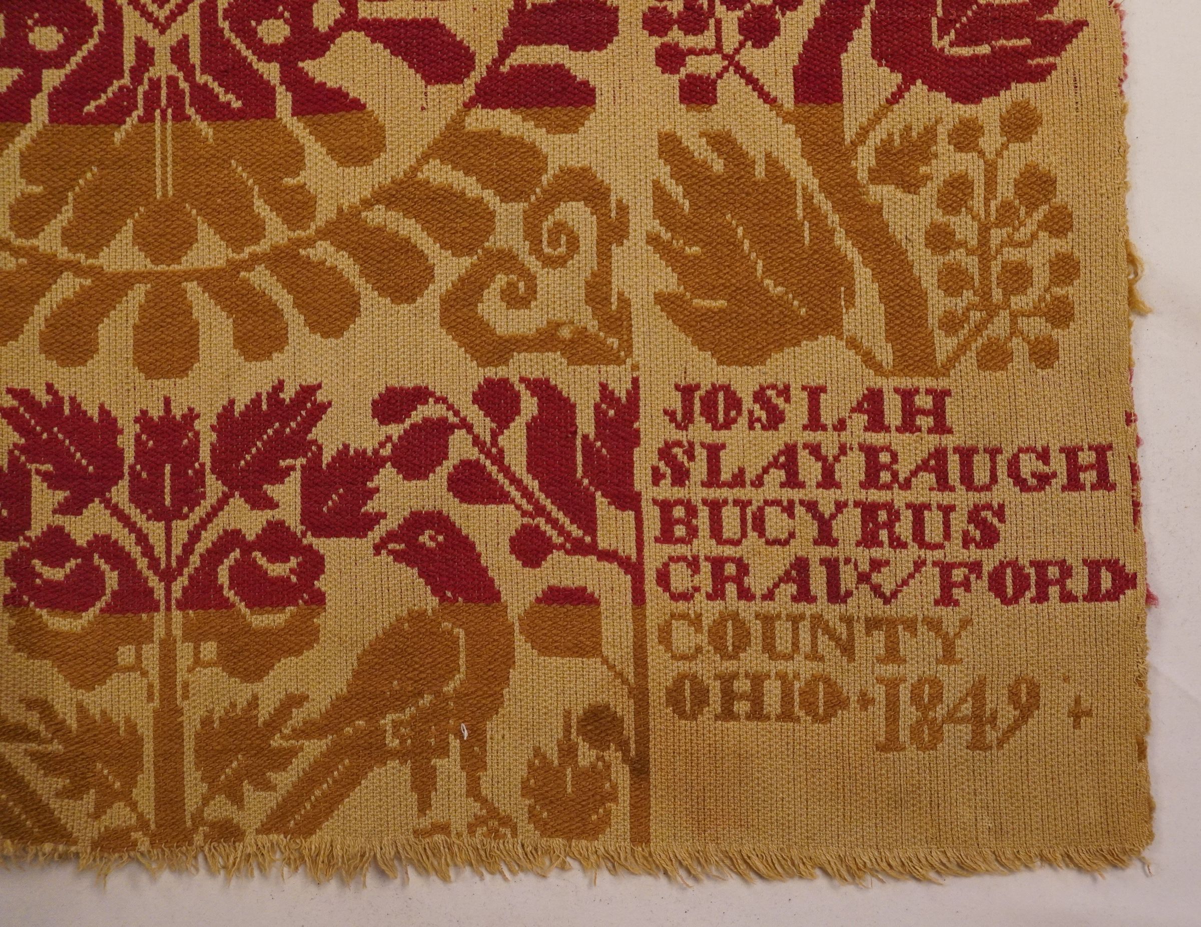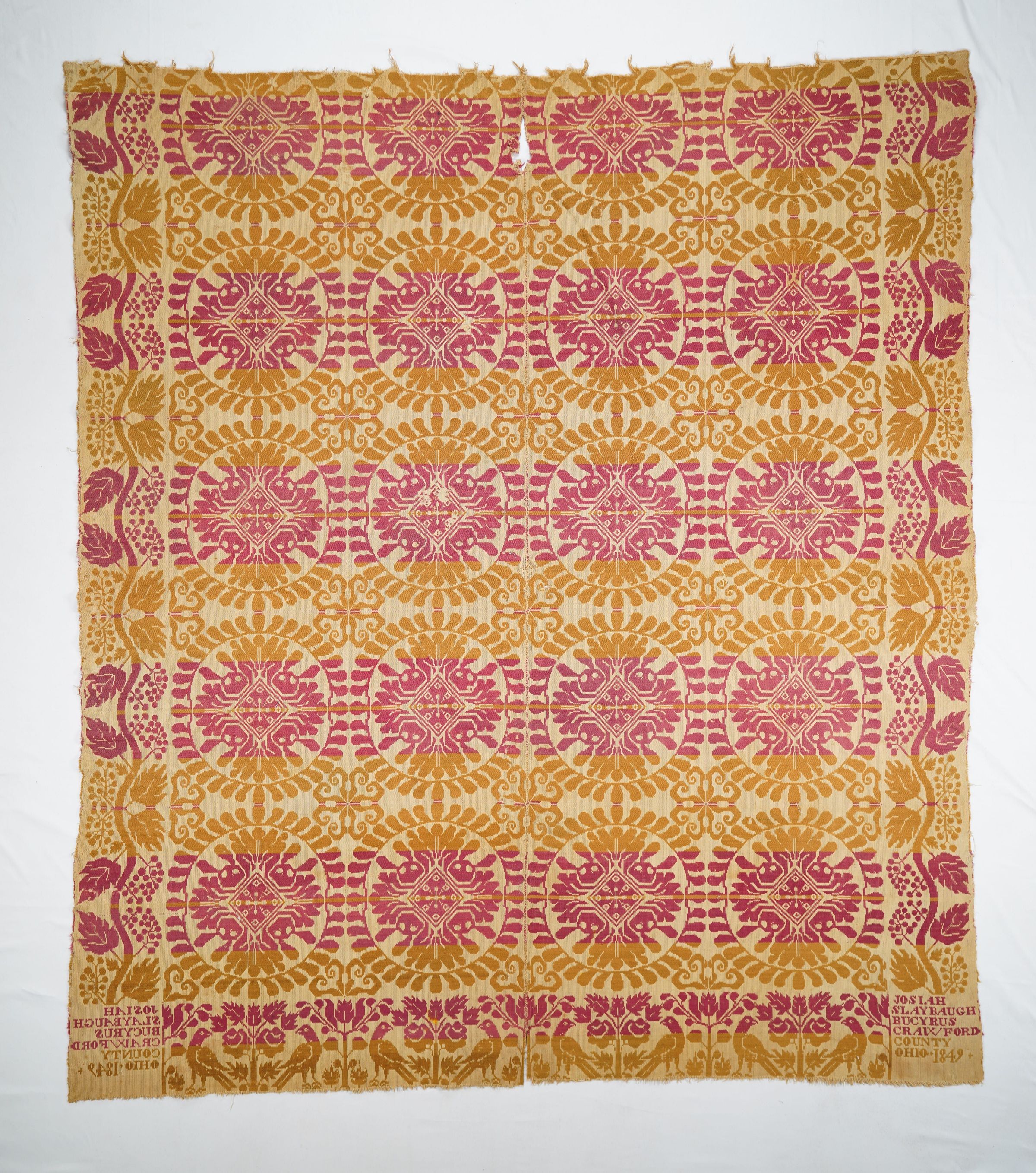 Natural, yellow, and red figured tied beiderwand 2:1 coverlet; two panels joined by a center seam. Border on three sides; no fringe.Collection
