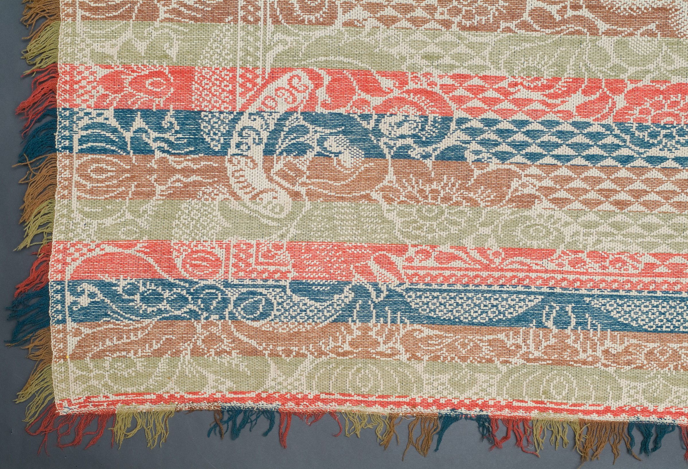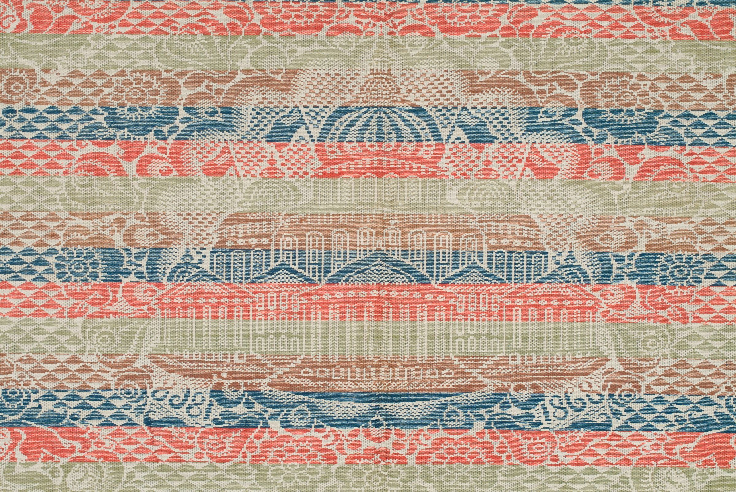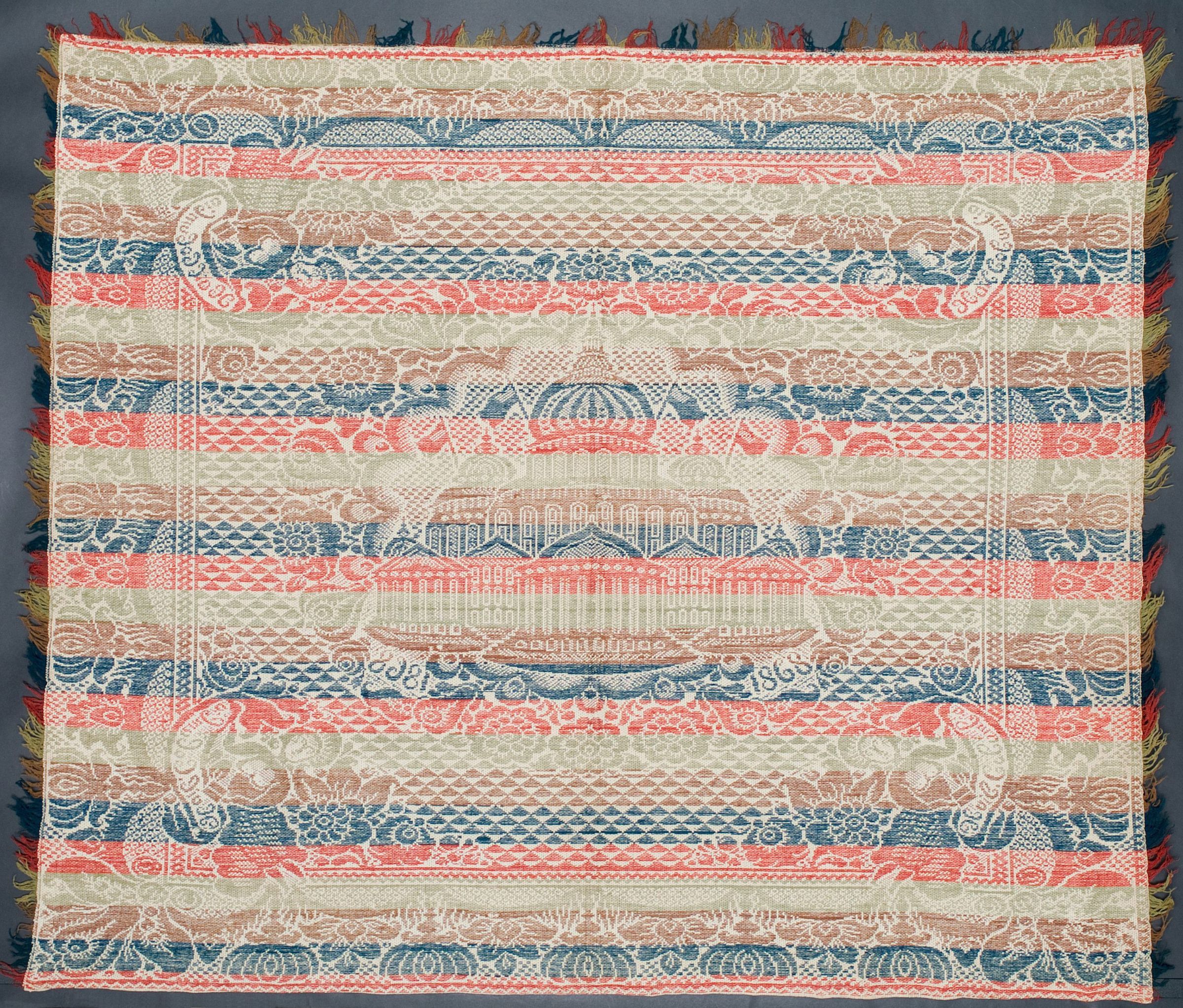 red, blue, brown, green, natural; floral outer border; woman by text in inner border; seamless; large building in center; fringe on 3 sidesCollection