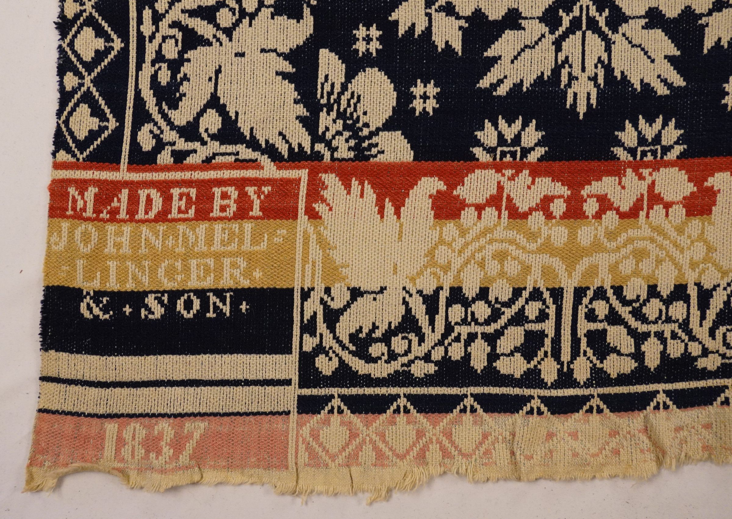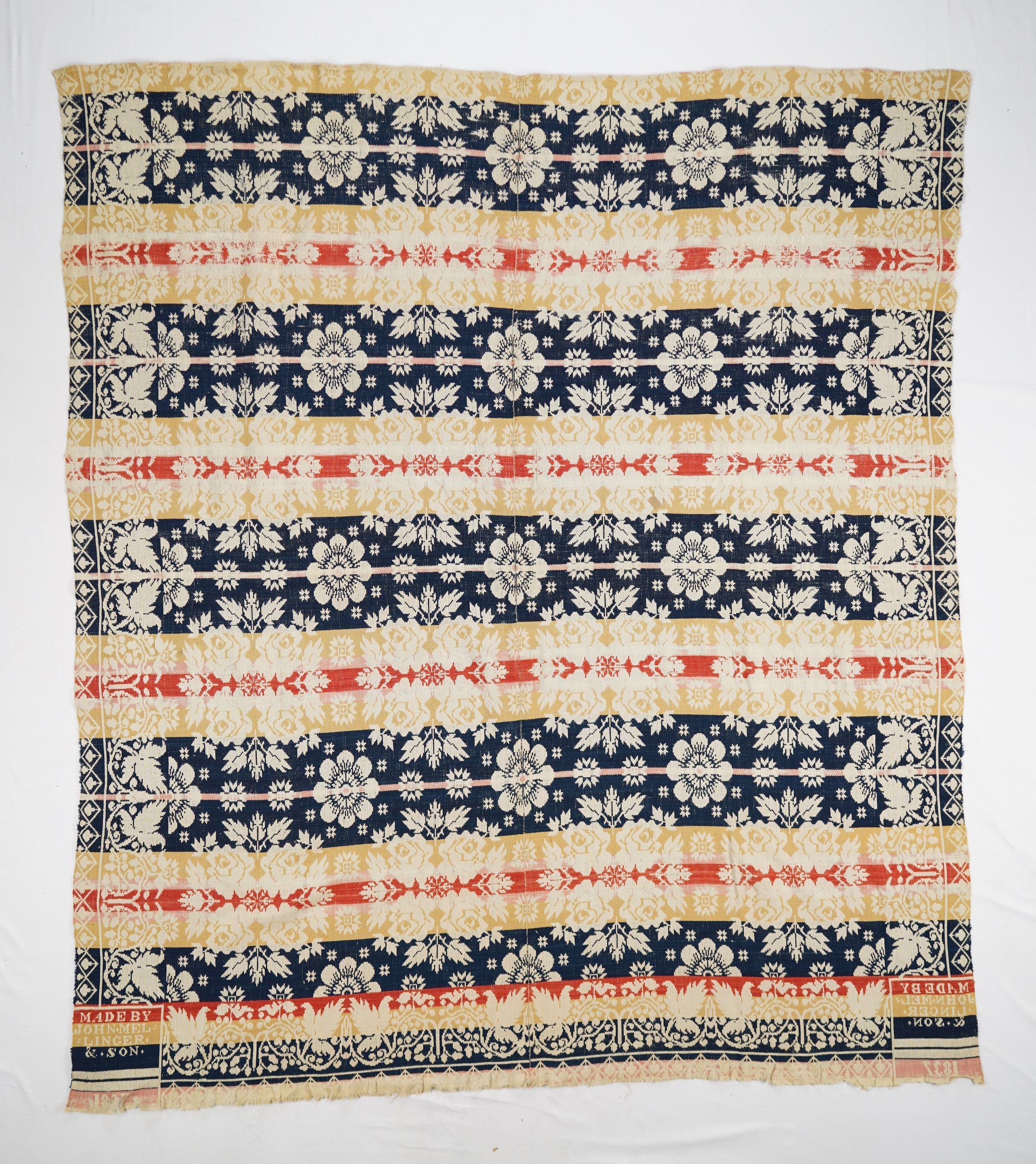 Natural, navy, pink, red, and yellow figured tied beiderwand 2:1 coverlet; two panels joined by a center seam. Border on three sides; fringe on bottom.Collection