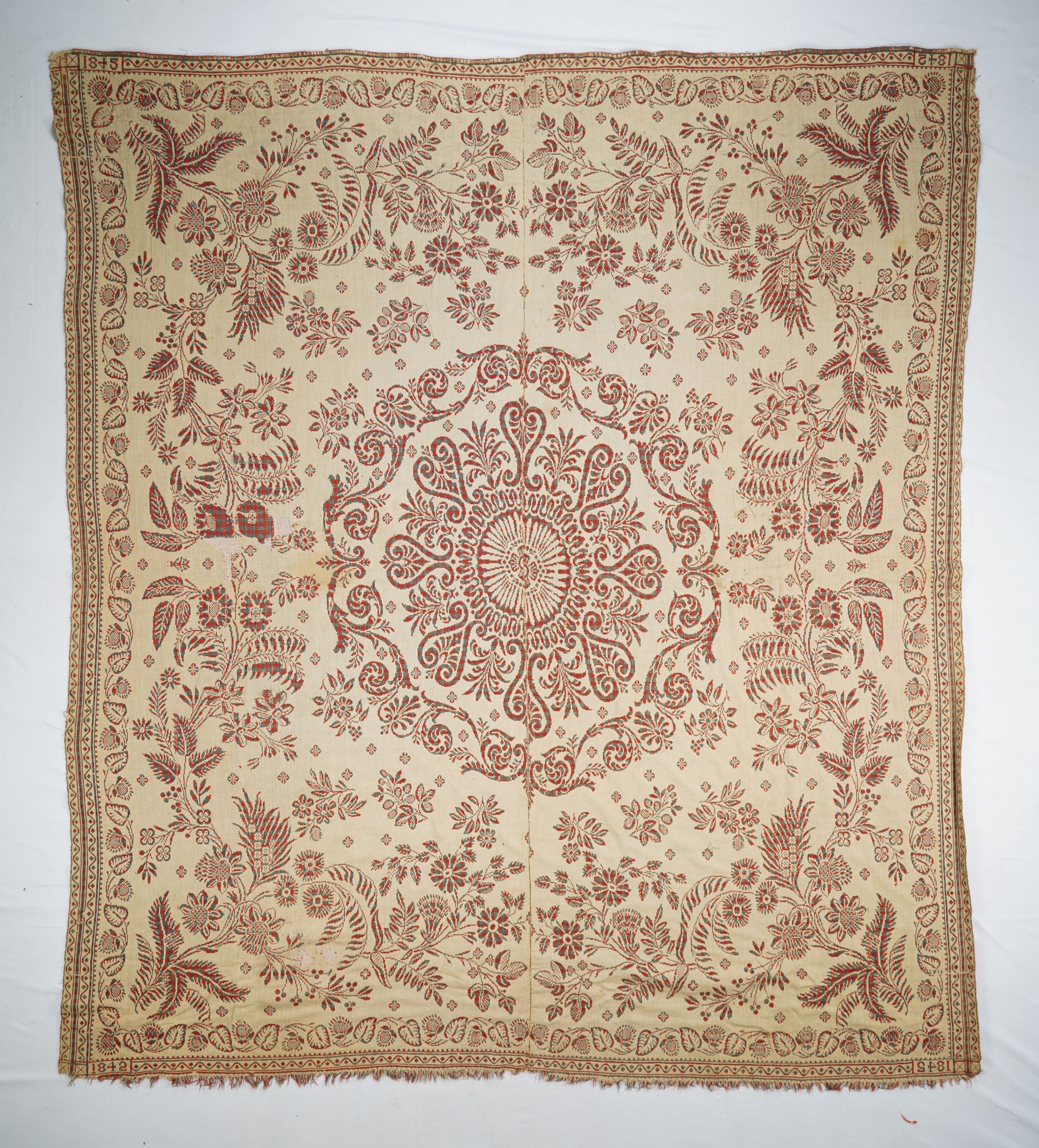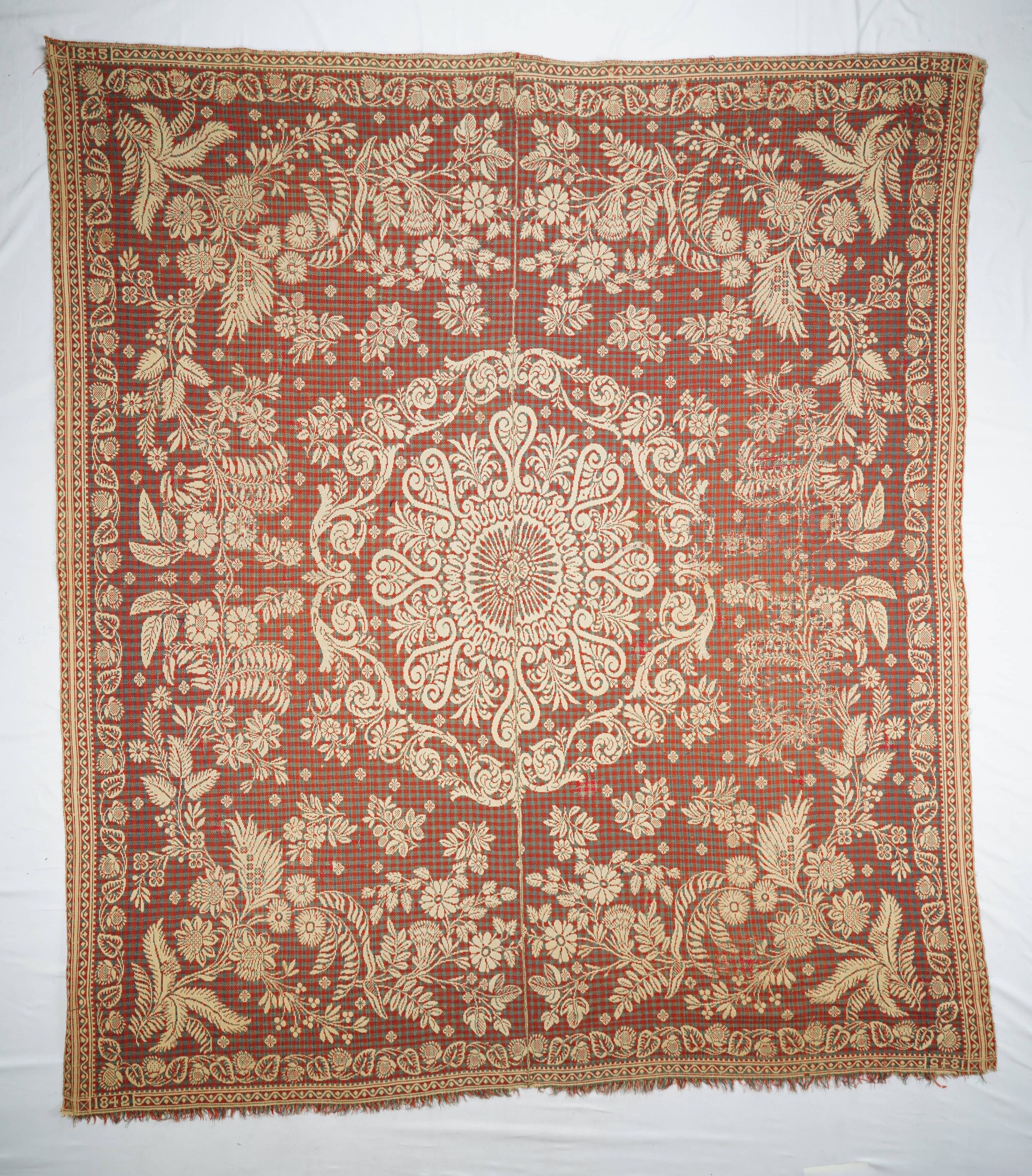 Natural, red, blue, and navy figured double weave coverlet; two panels joined by a center seam. Border on four sides; fringe along bottom.Collection