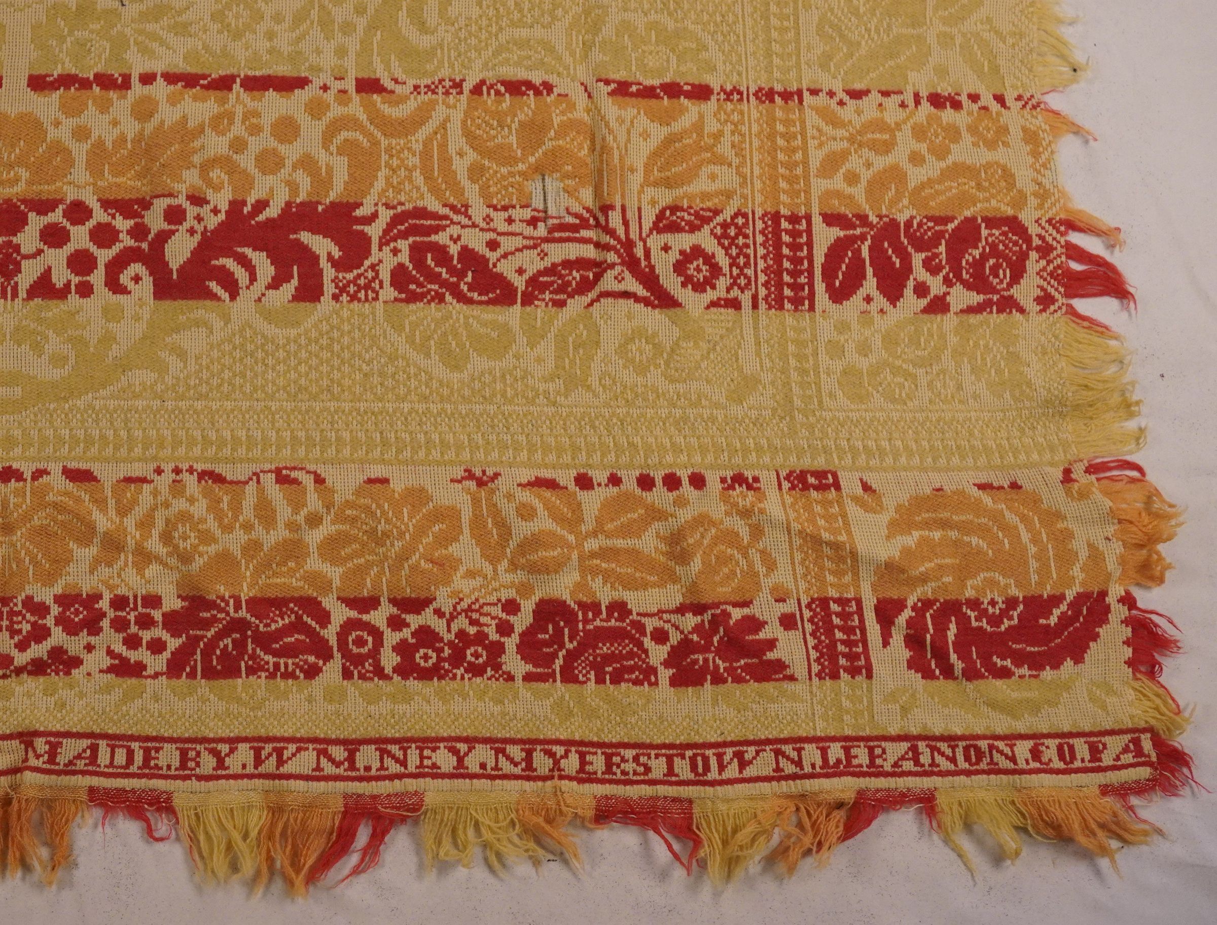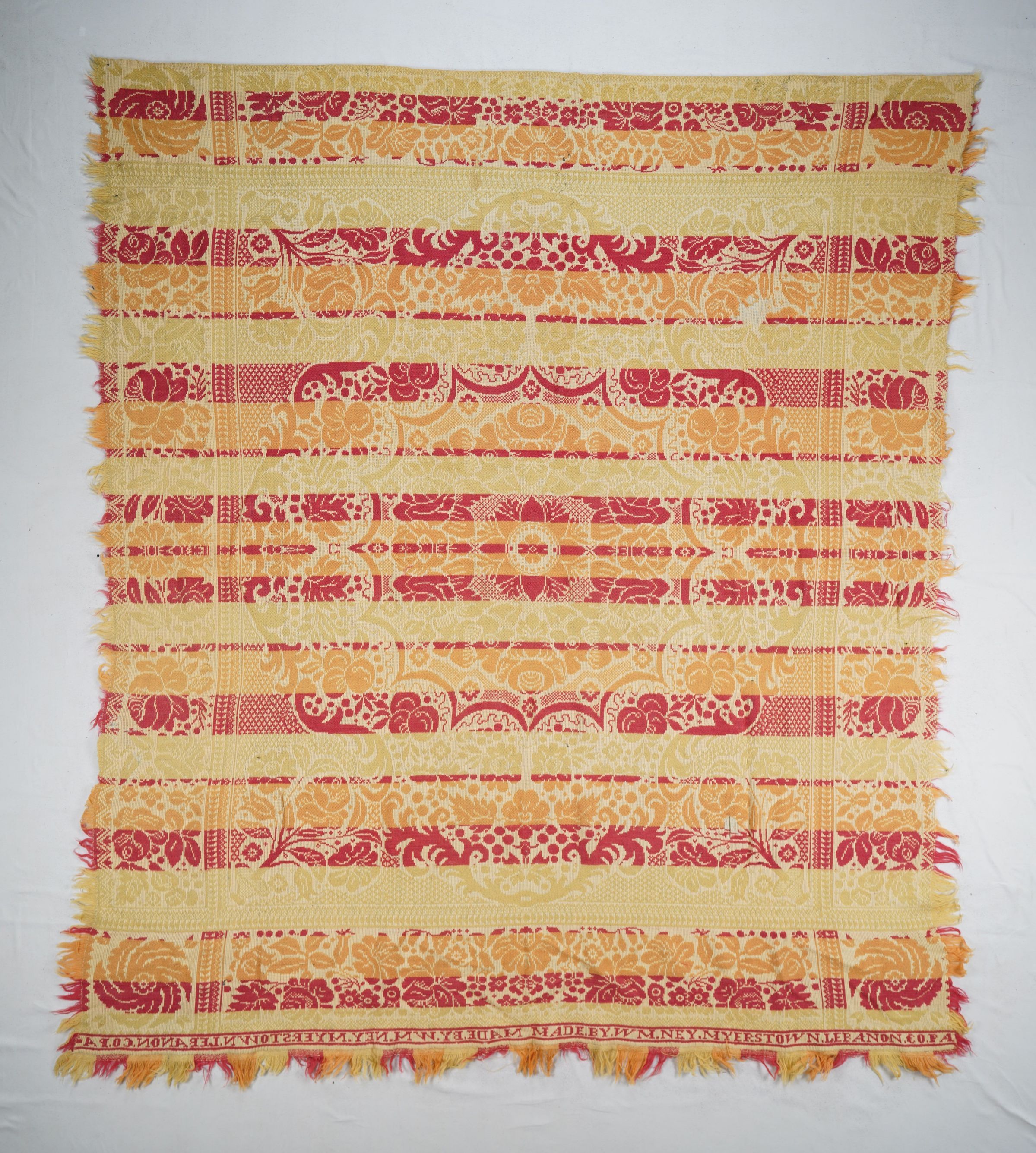 Natural, red, orange, and yellow figured tied beiderwand 3:1 coverlet; seamless. Border on four sides; fringe on three sides.Collection