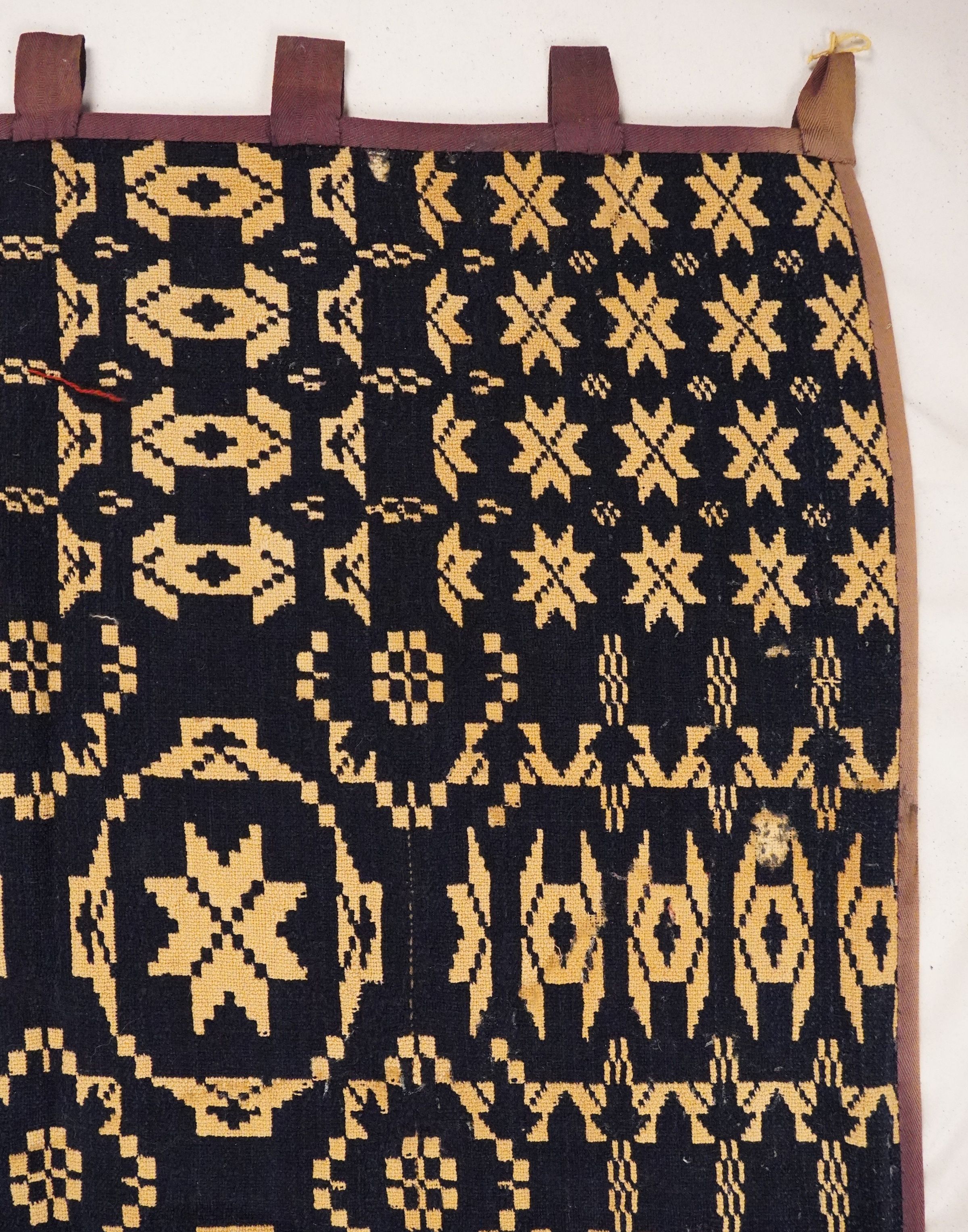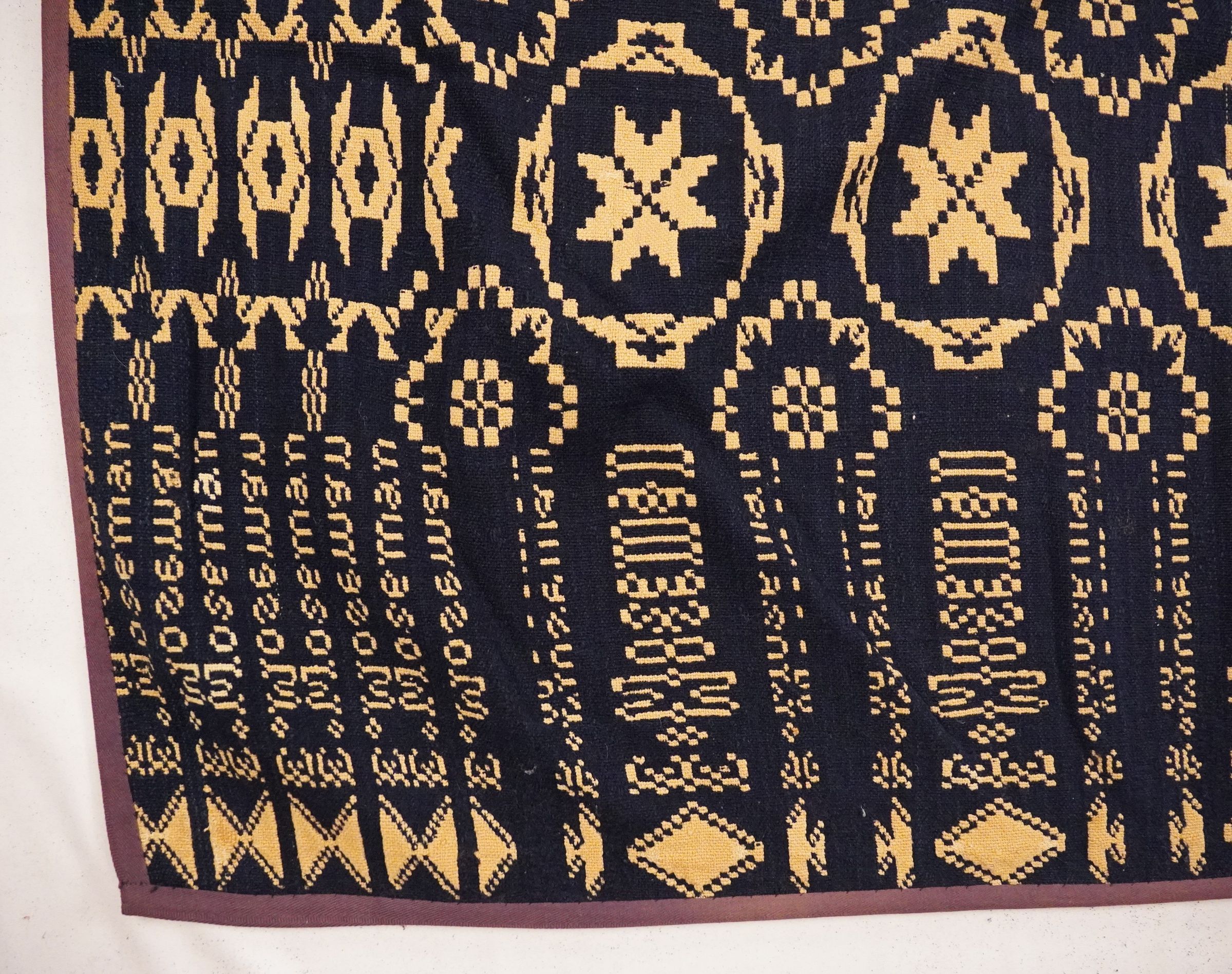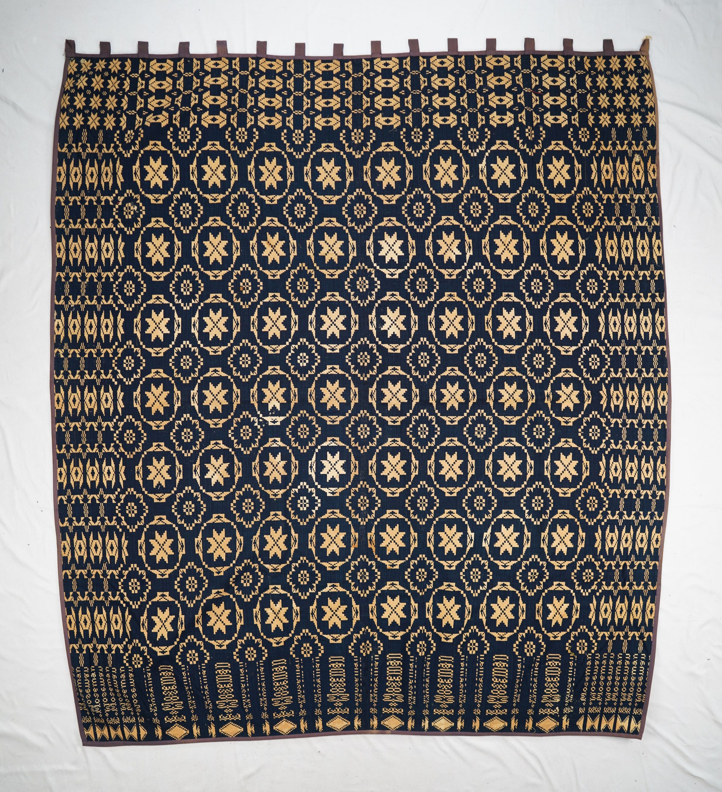 Natural and navy fancy geometric double weave coverlet; two panels joined by a center seam. Border on four sides; no fringe.Collection