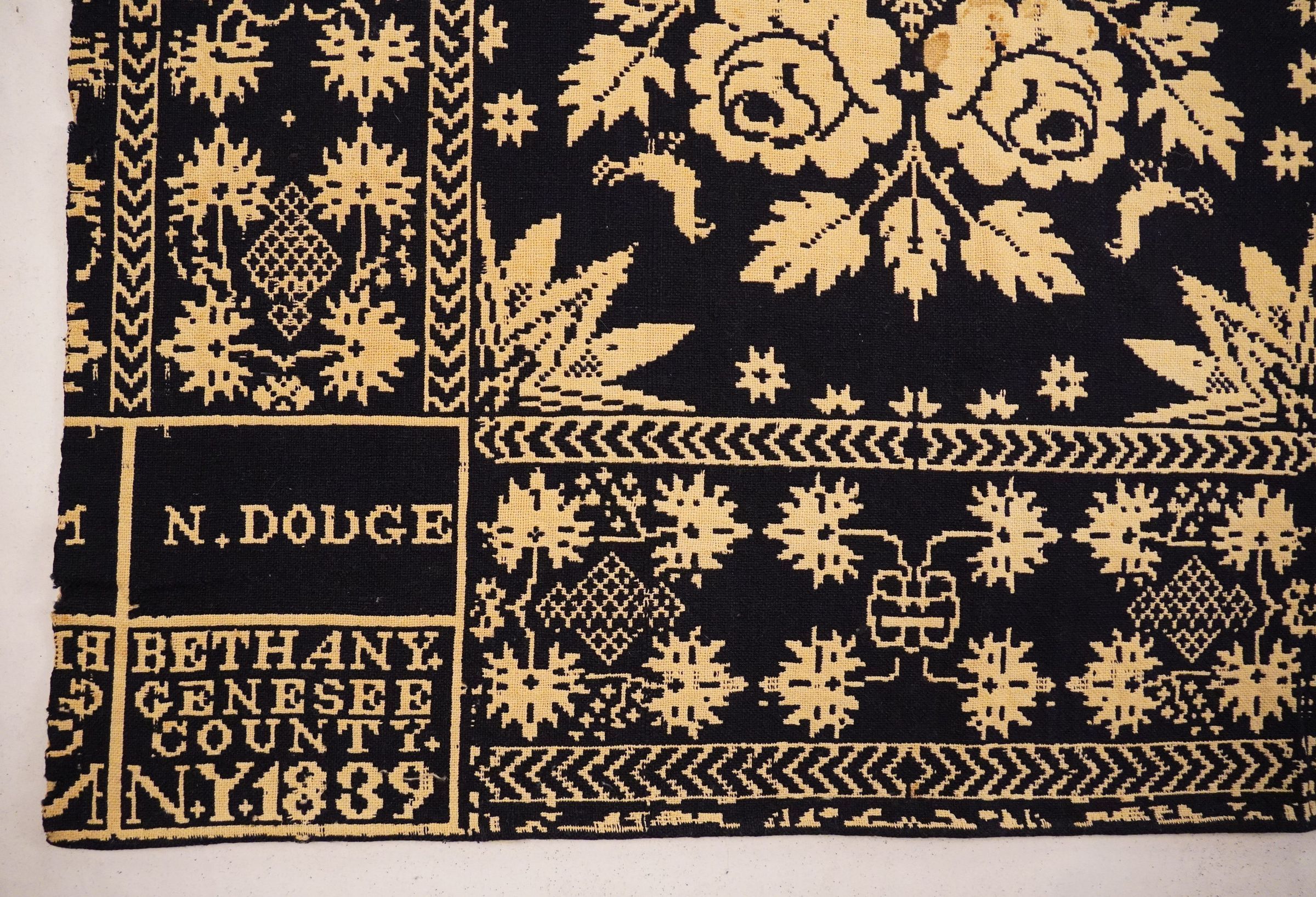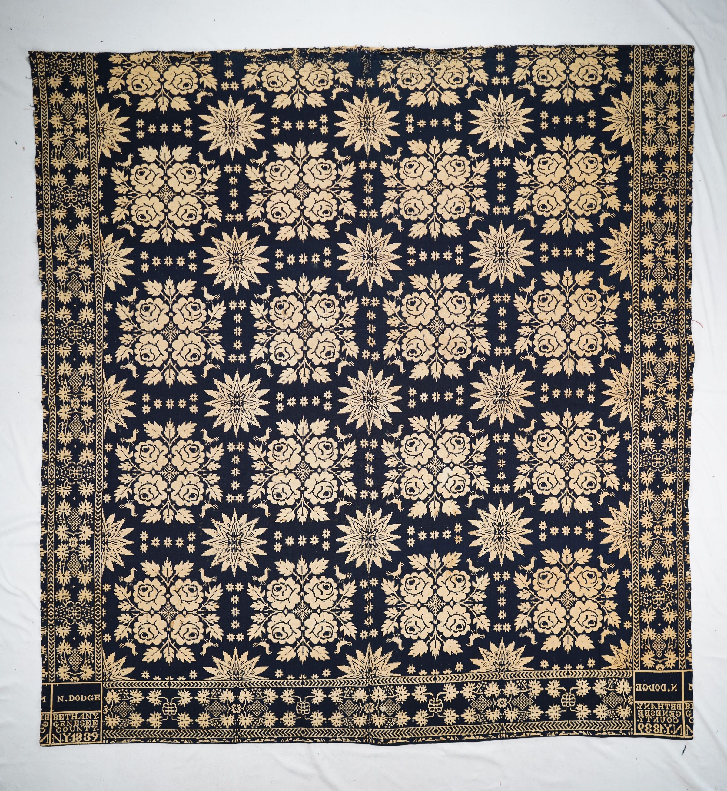 Natural and navy figured double weave coverlet; two panels joined by a center seam. Border on three sides; no fringe.Collection