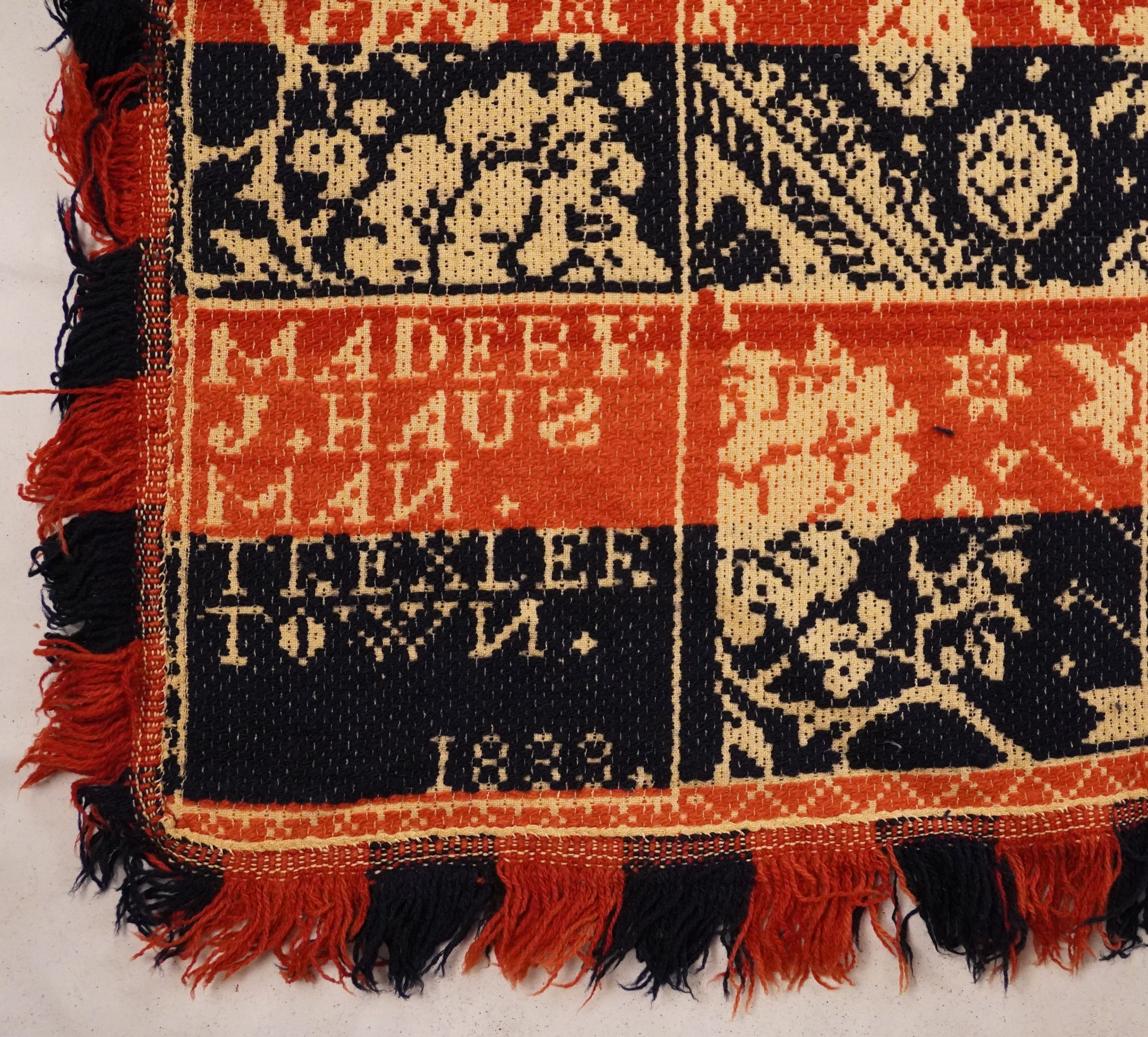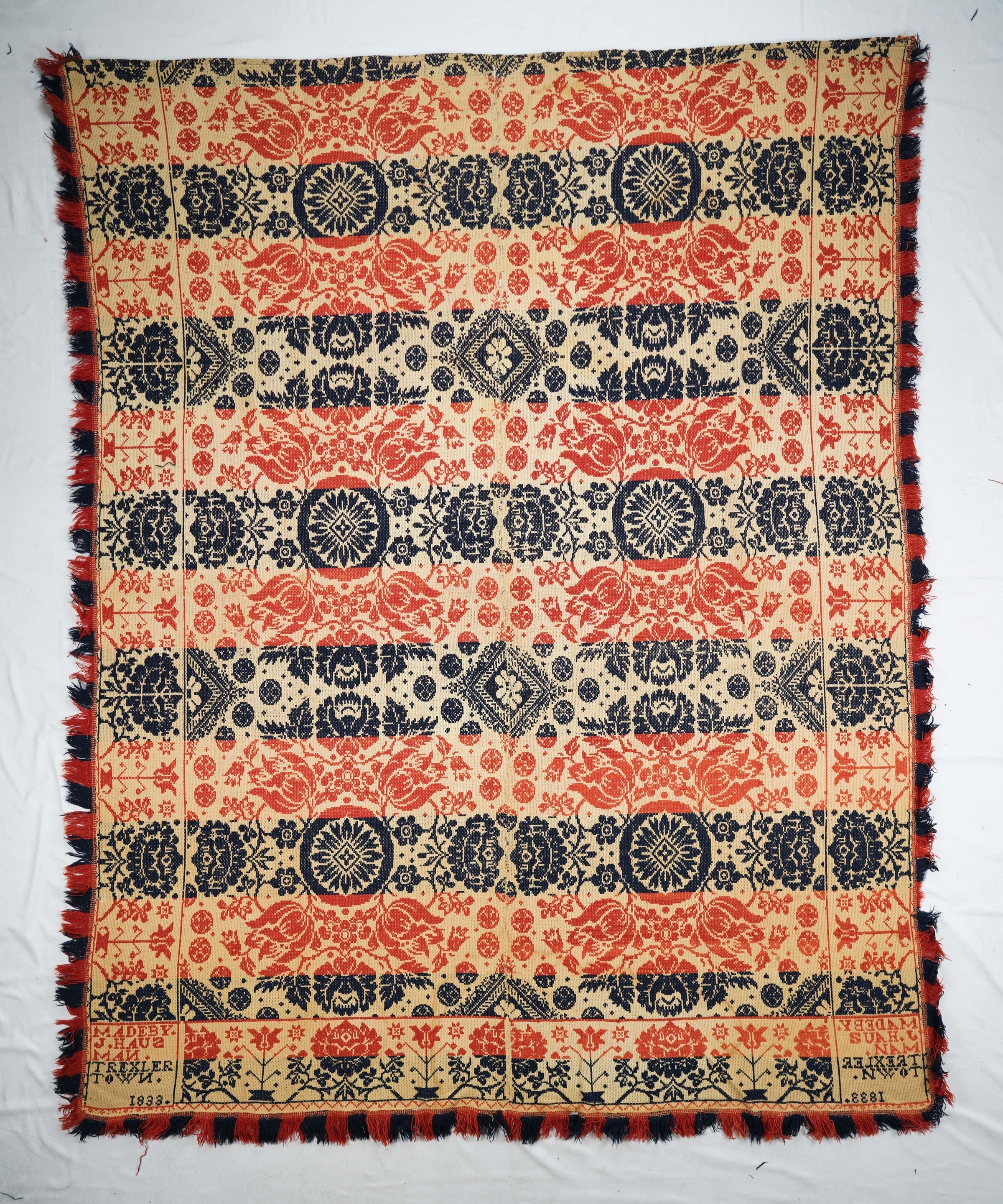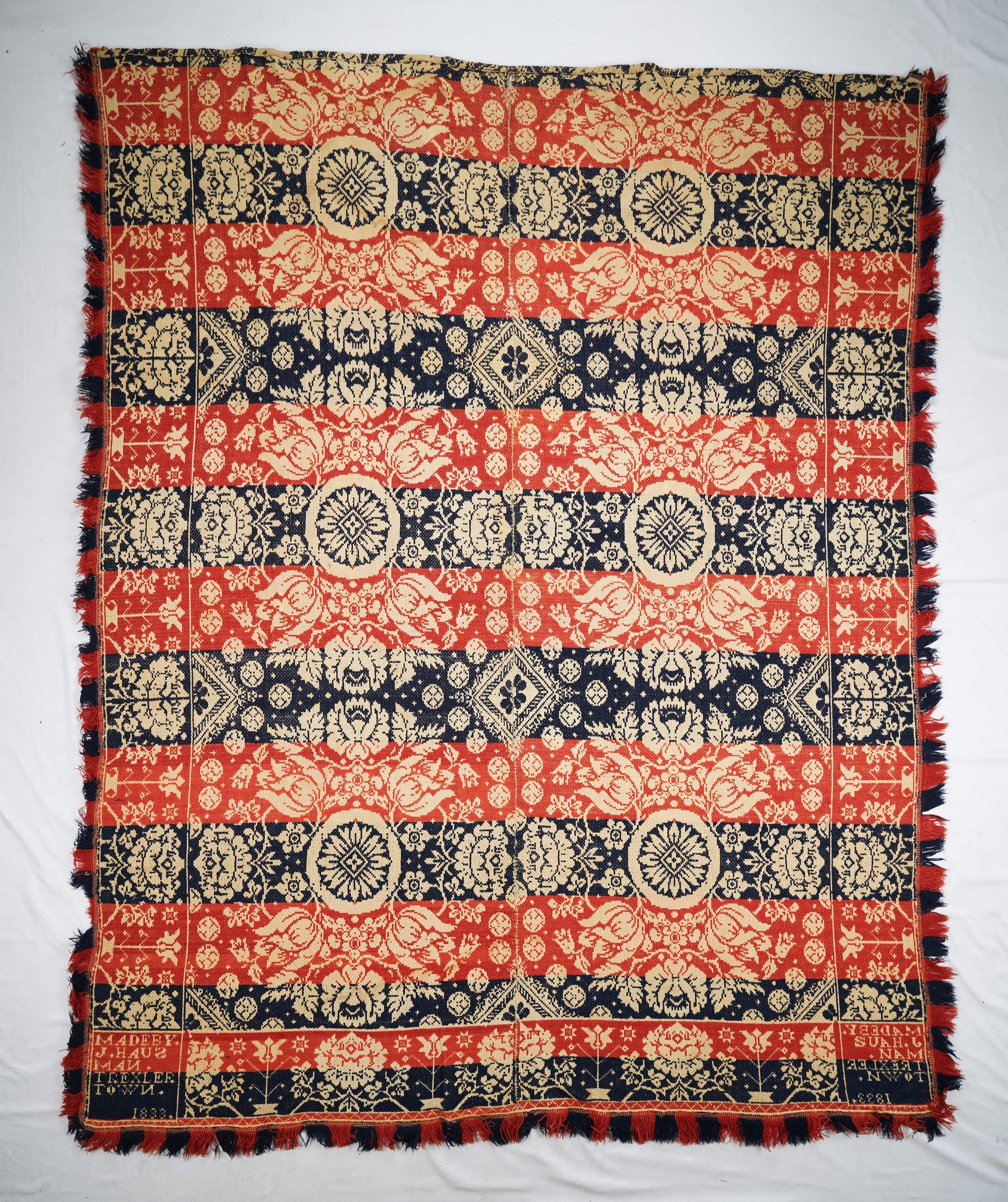 Natural, navy, and red figured starwork coverlet; two panels joined by a center seam. Border and fringe on three sides.Collection