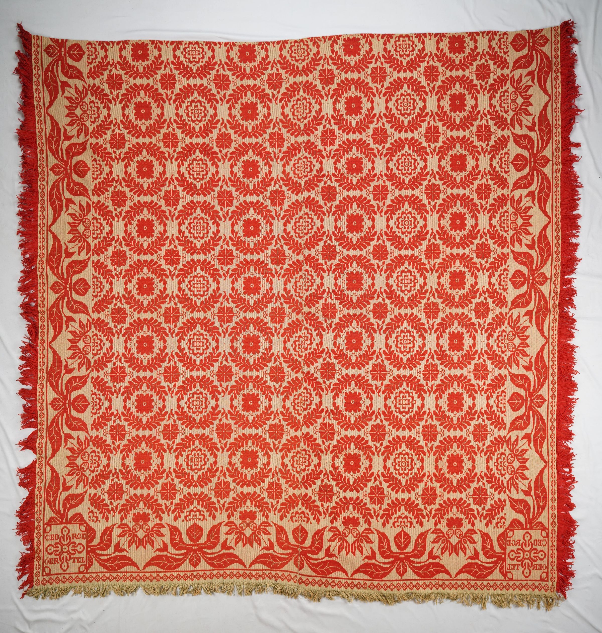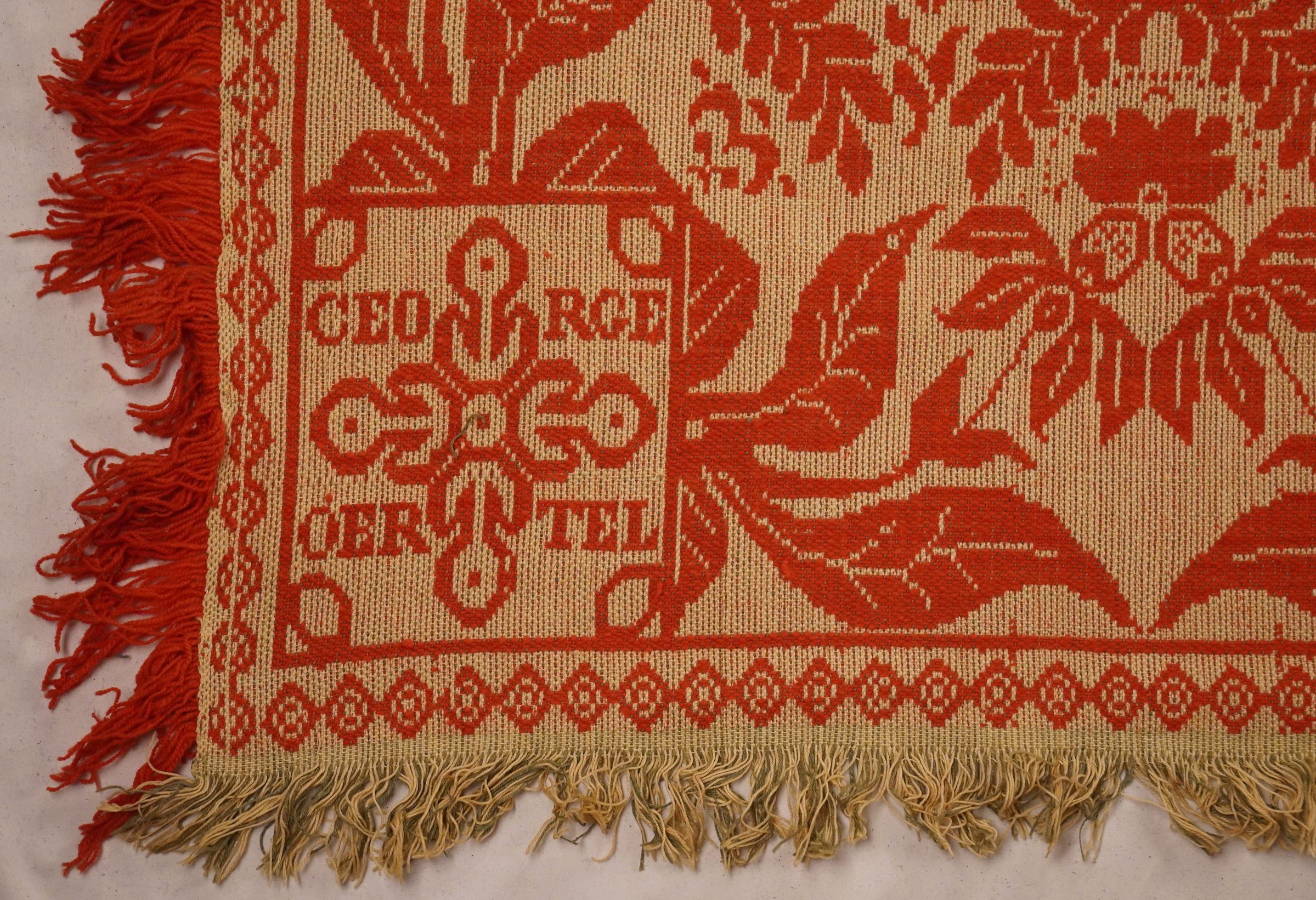 Natural and red figured tied beiderwand 2:1 coverlet; two panels joined by a center seam. Border and fringe on three sides.Collection