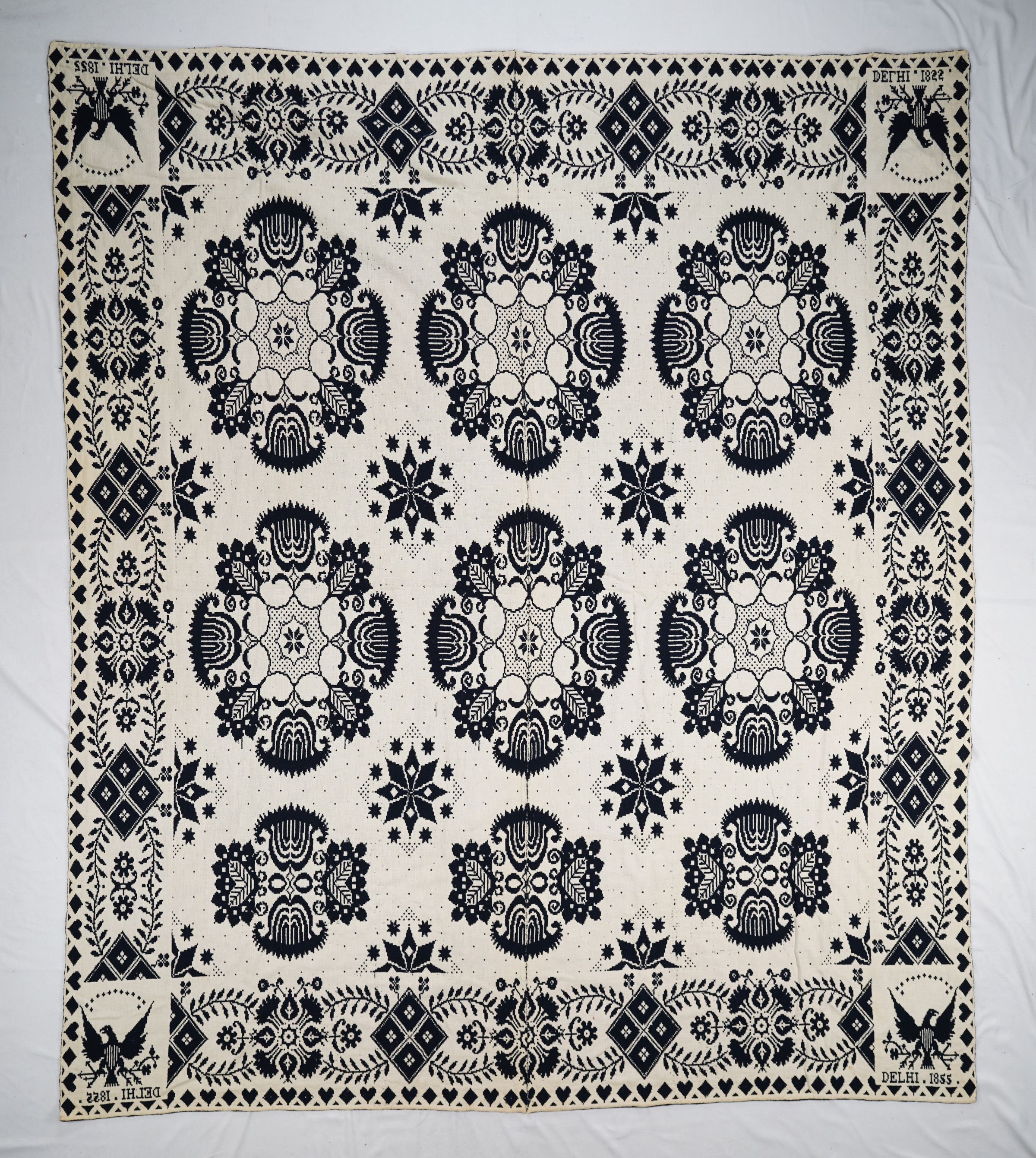 Natural and navy figured double weave coverlet; two panels joined by a center seam. Border on four sides; no fringe.Collection