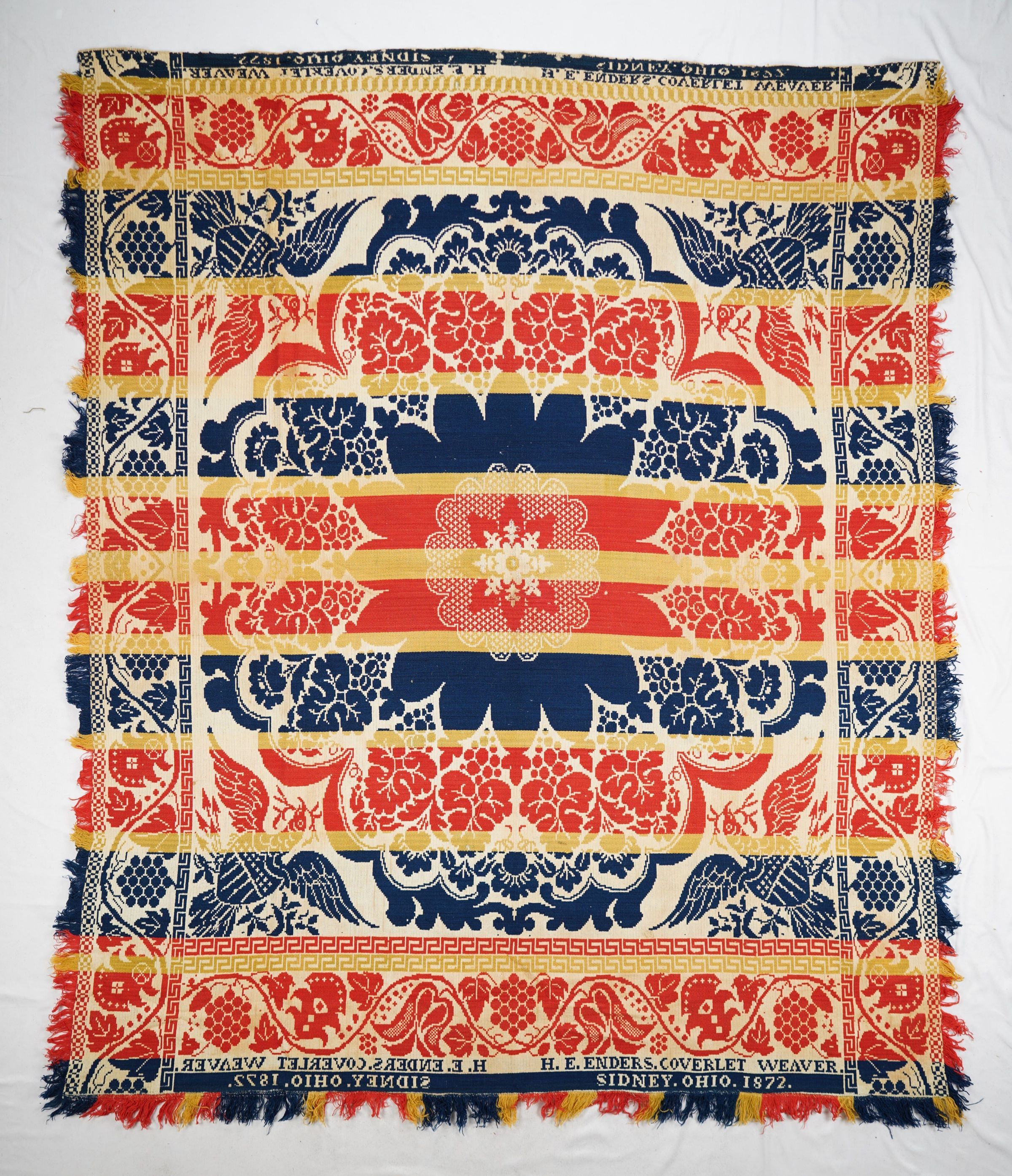 Natural, navy, yellow, and red figured true beiderwand 4:1 coverlet; seamless. Fringe on three sides; border on four sides.Collection