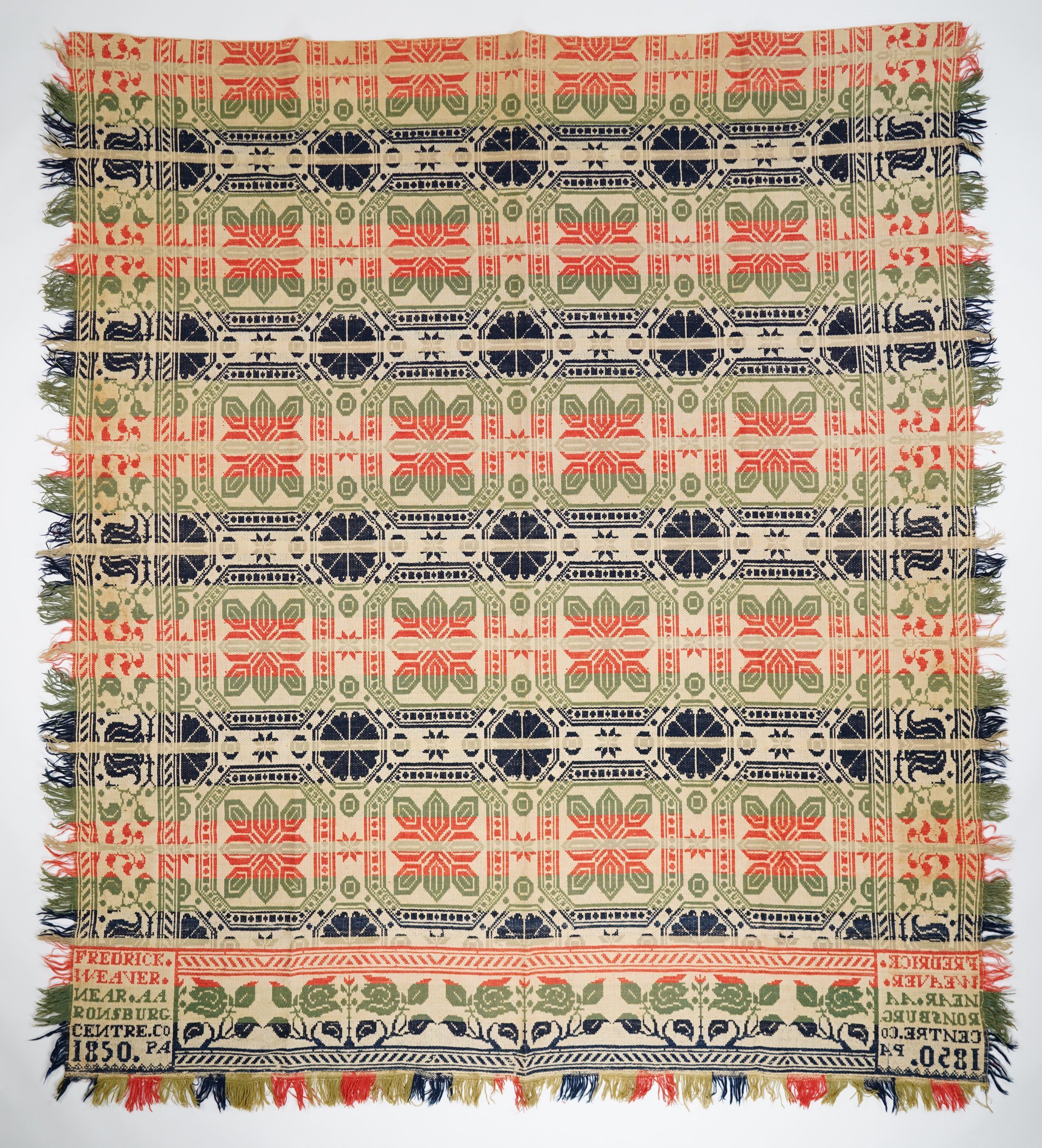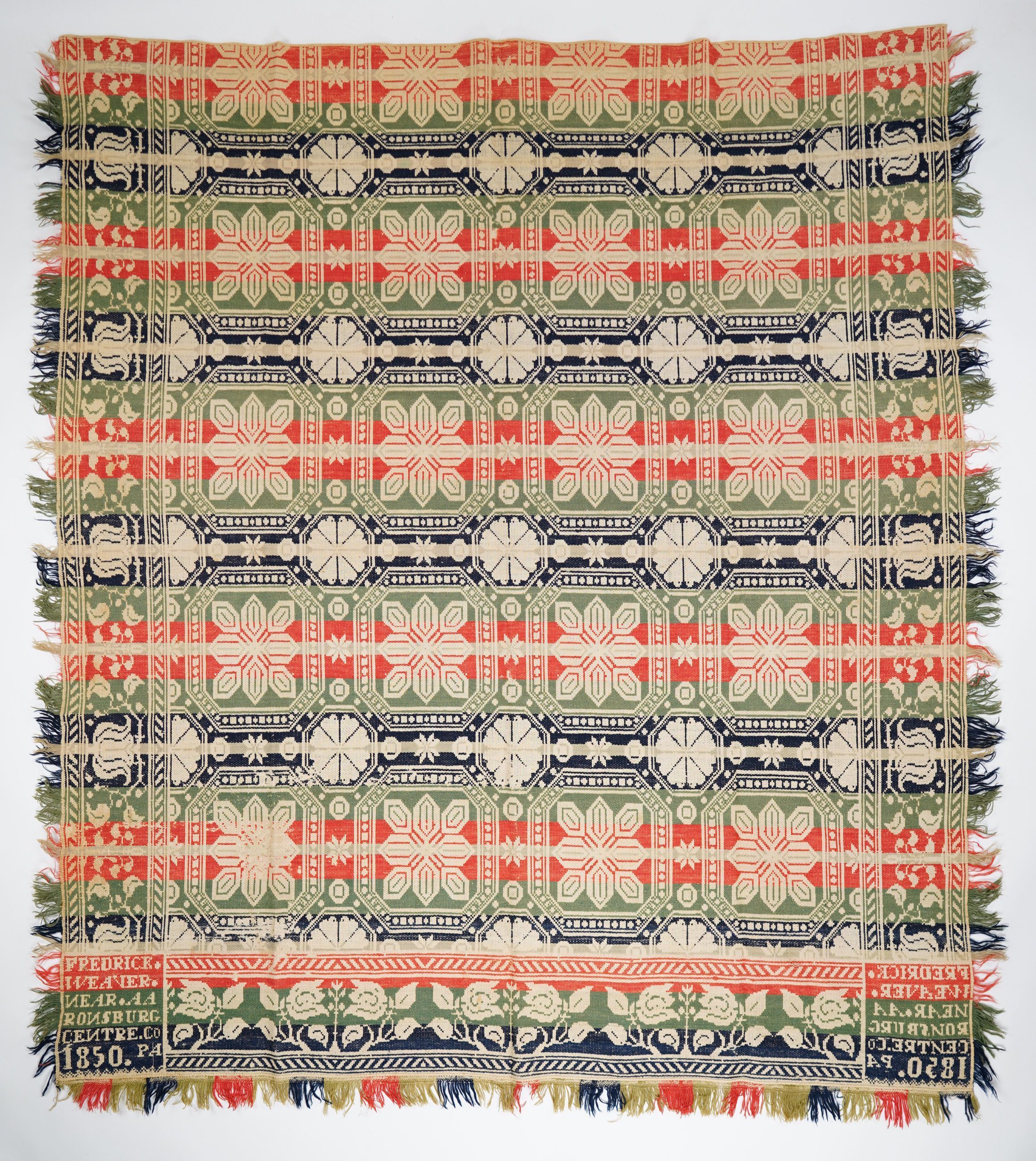 Red, navy, green, figured tied Beiderwand coverlet; seamless; self-fringe on sides; applied fringe on bottom; floral border on three sides; abstract medallion centerfield pattern.Collection