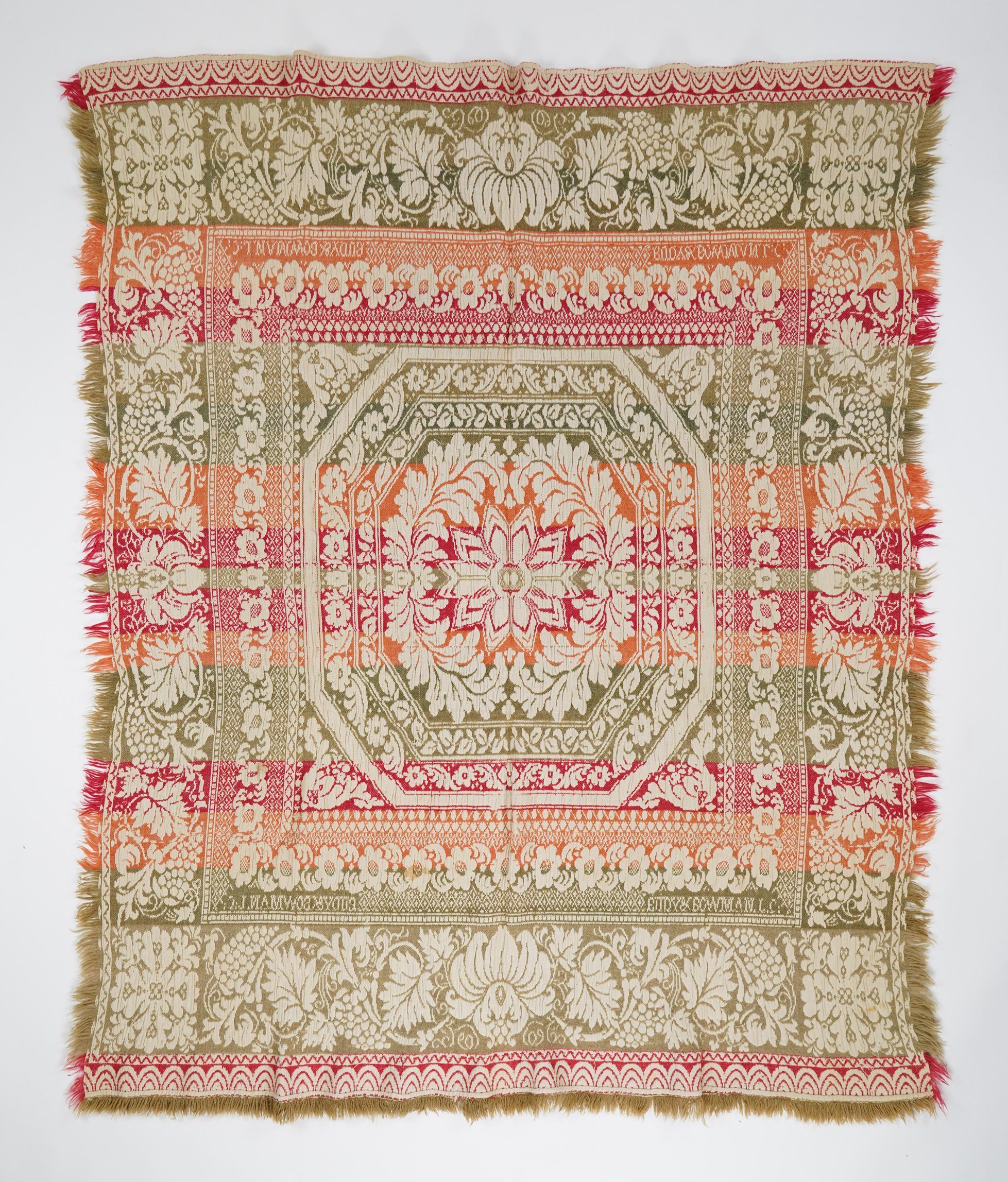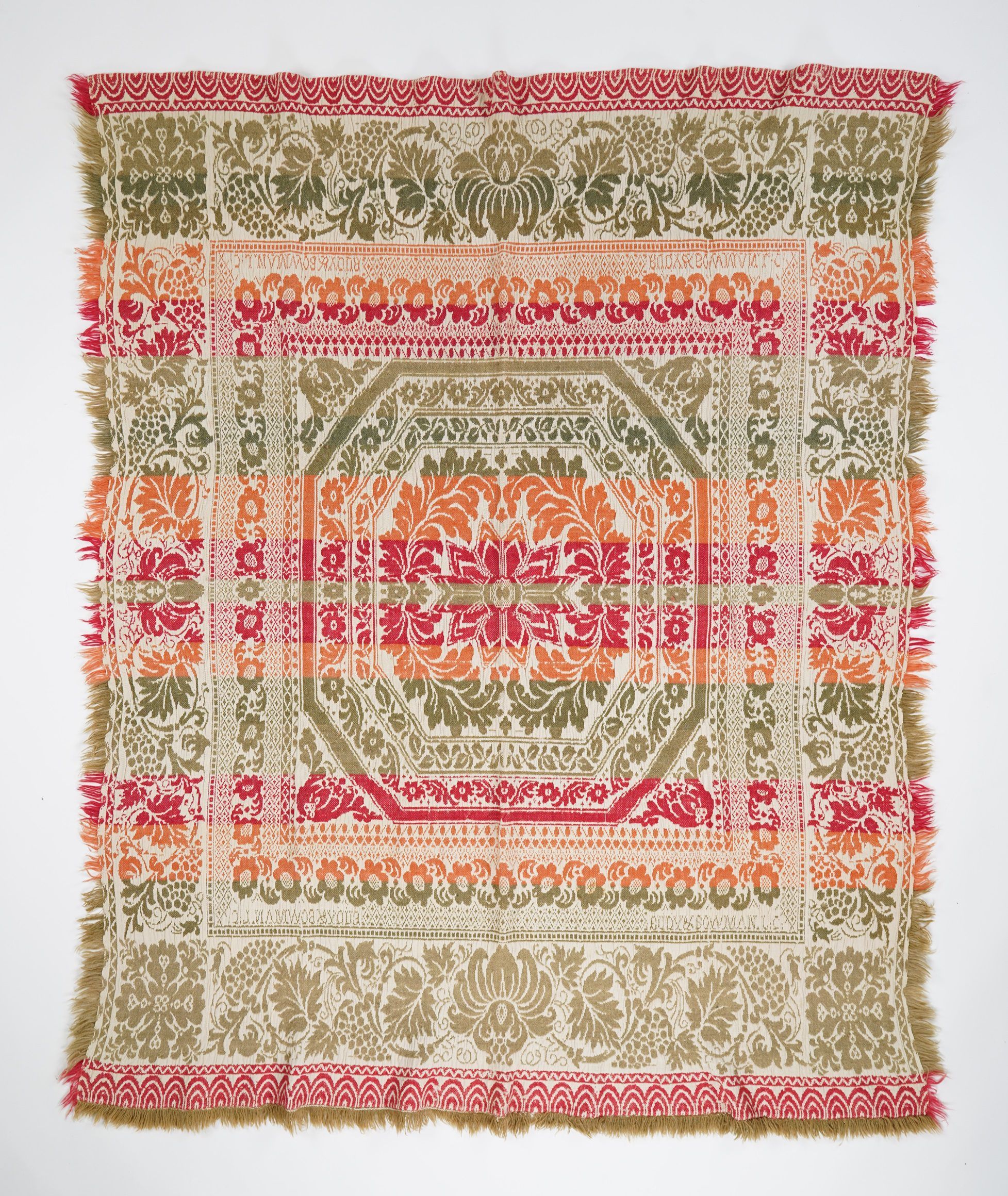 Red, two-tone green, orange figured Beiderwand coverlet; seamless; self-fringe on sides; applied fringe on bottom; grapevine border on all four sides; center medallion.Collection