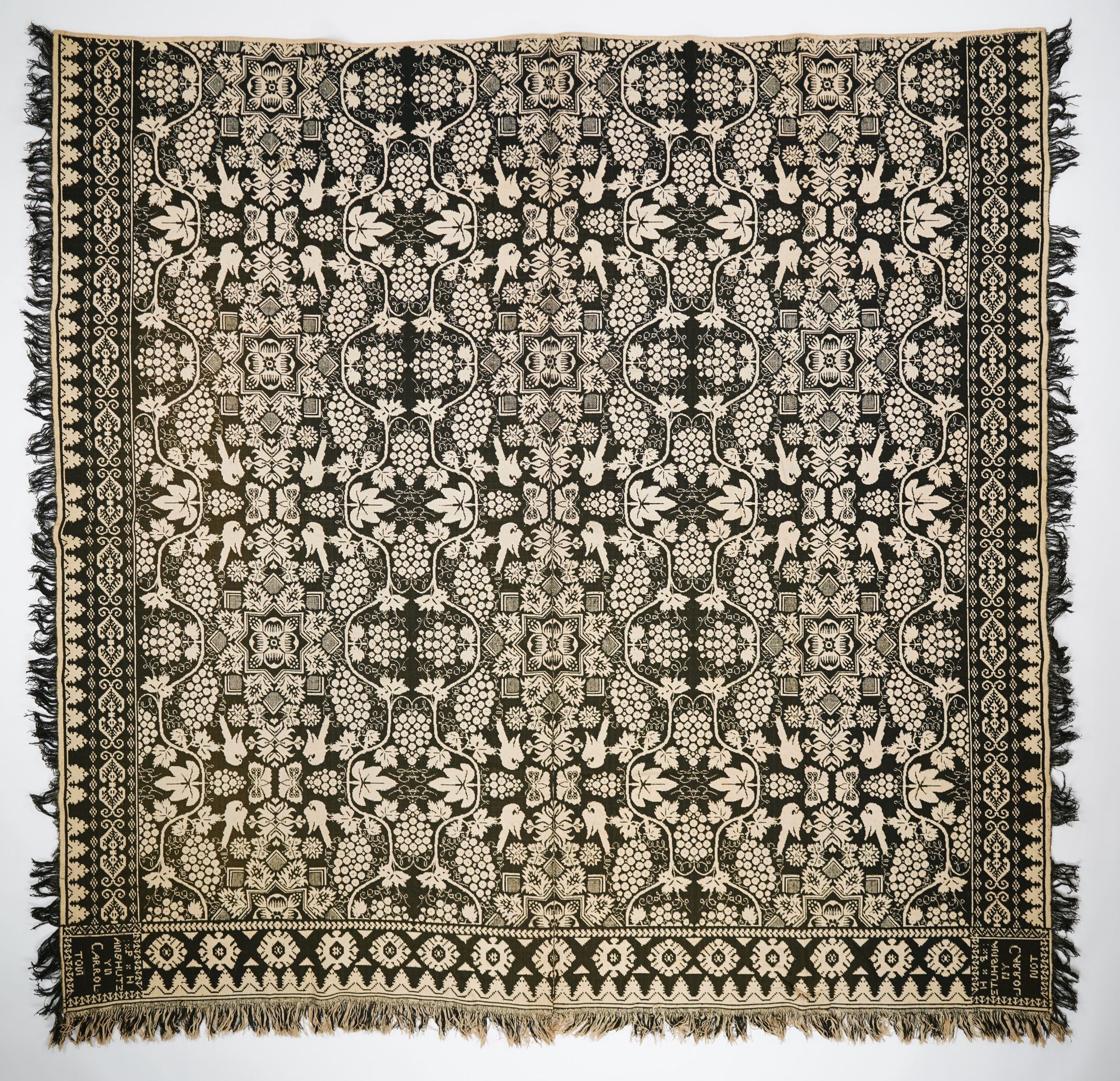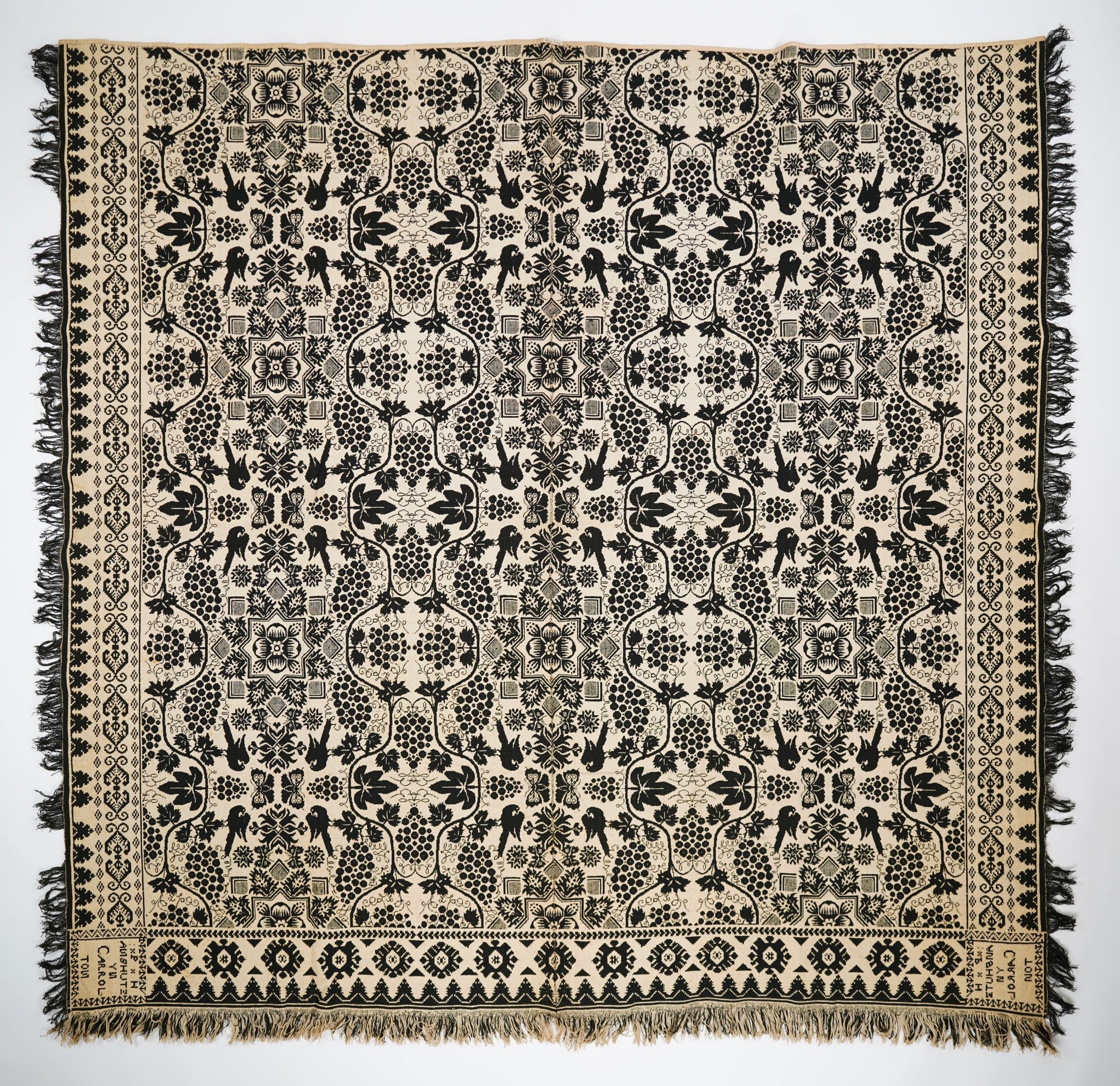 Philip Henry Anshutz (born c. 1802) emigrated from Germany around 1833 and settled in Baltimore, where he was naturalized in 1840. Anshutz moved to Carrollton, Ohio and wove coverlets there from around 1842 to 1845, none of which are dated. His corner blocks regularly feature a backward letter N and the word “in” spelled “yn.”Collection