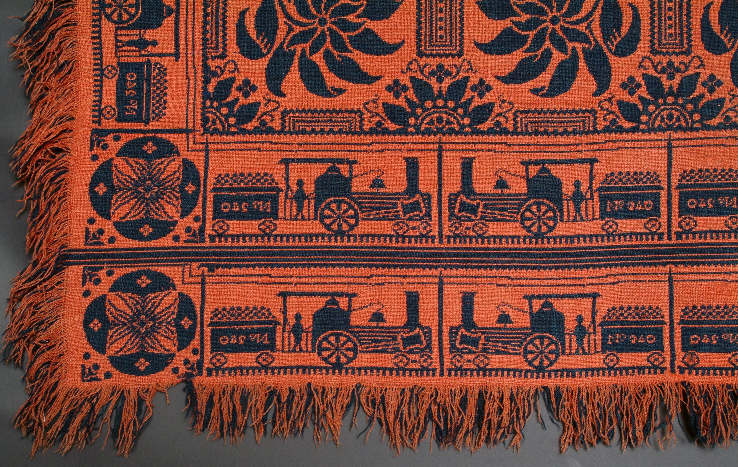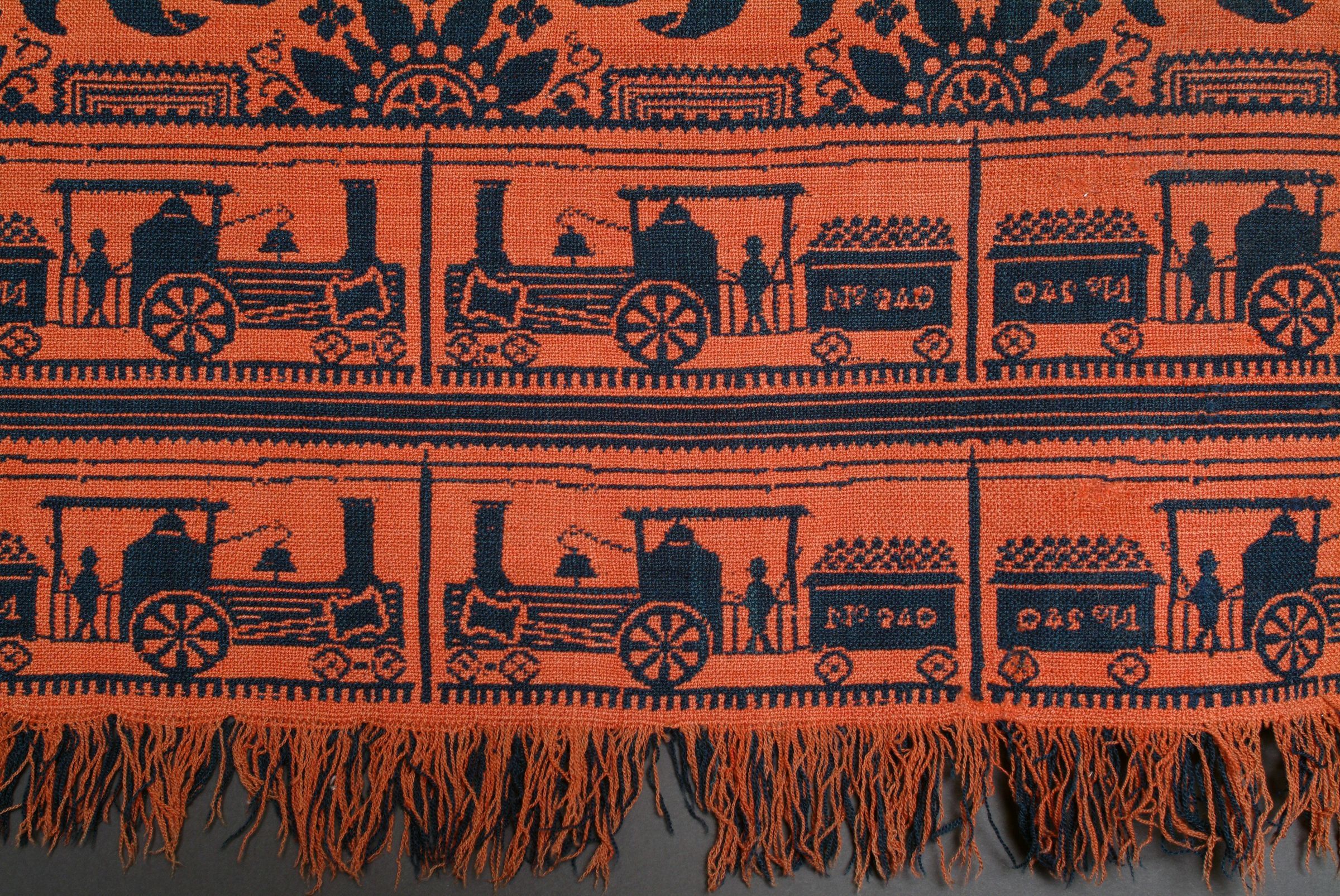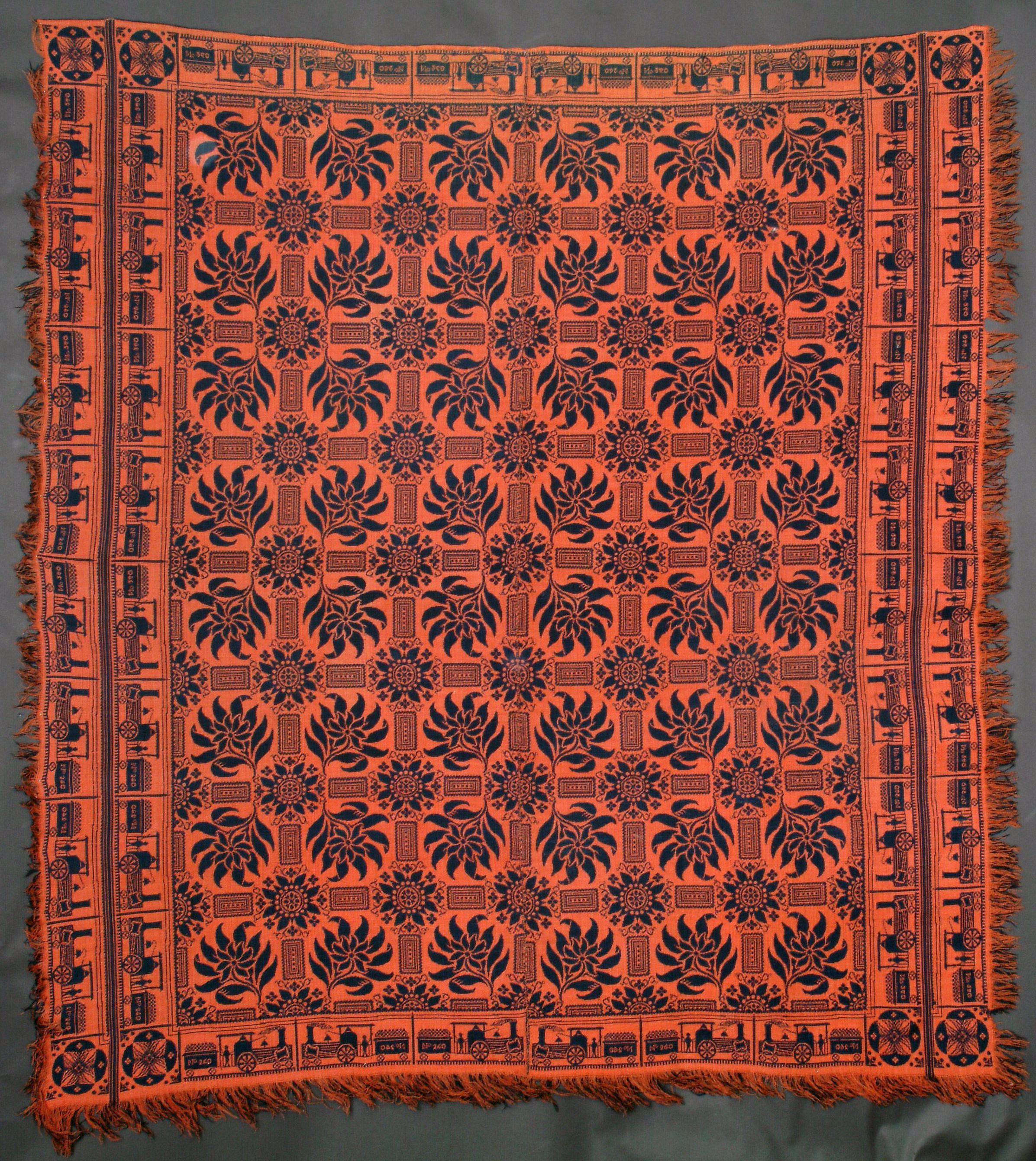 Double weave; orange, navy; two loom widths joined; fringe on 3 sides; 4 corner blocks, each with flower; double border of trains; floral pattern on centerfield with rectangular designCollection