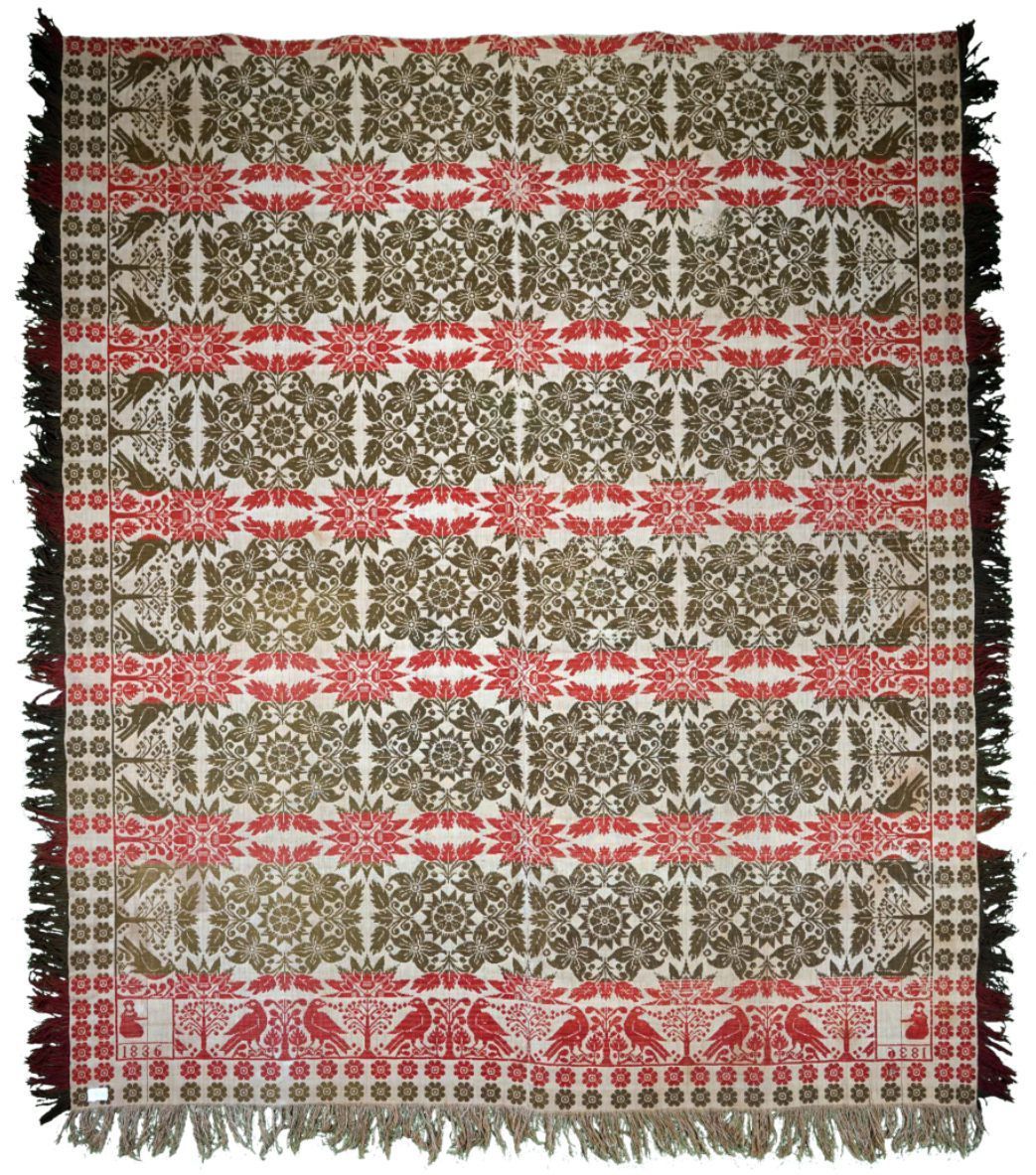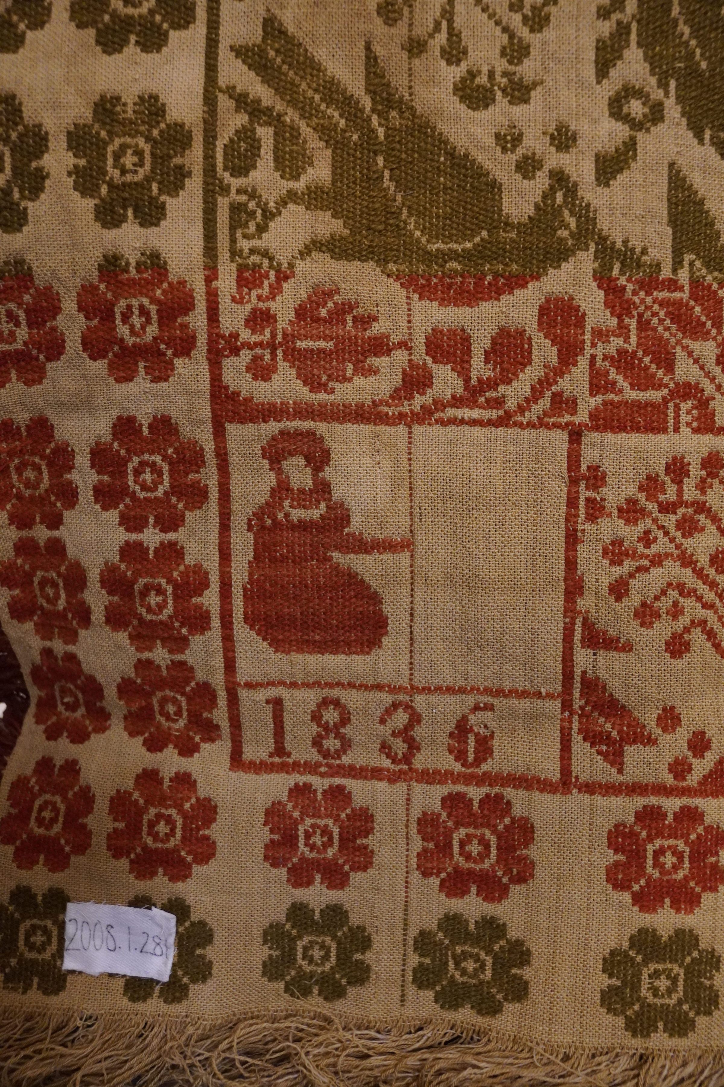 Beiderwand; olive, orange, natural; fringe on 3 sides; two loom widths joined; two corner blocks with date and figure of a woman; double border, outer border of 2 rows of flowers, inner border of distelfinks and trees; centerfield of rows of floral medallions and stars, strips of colorCollection