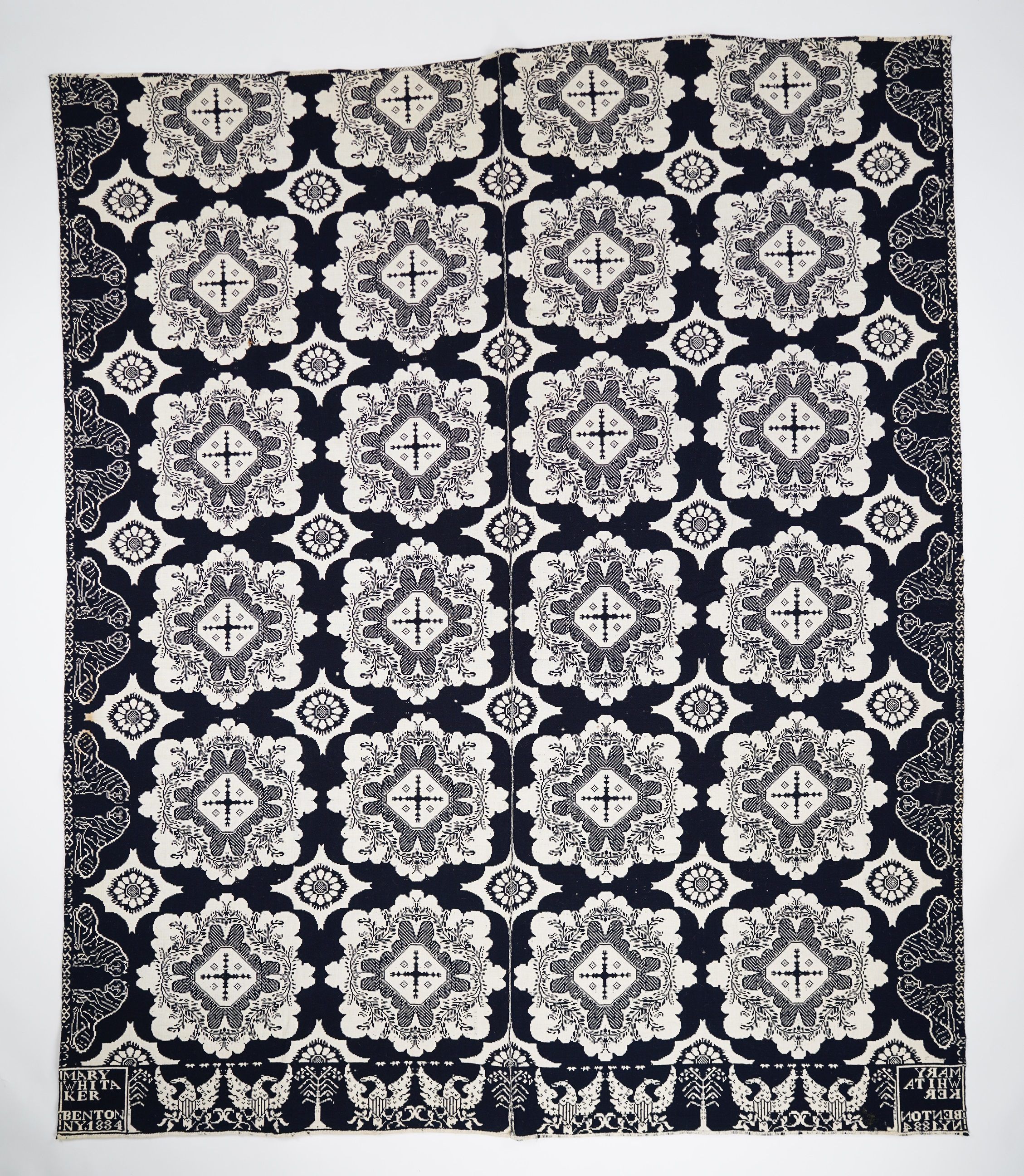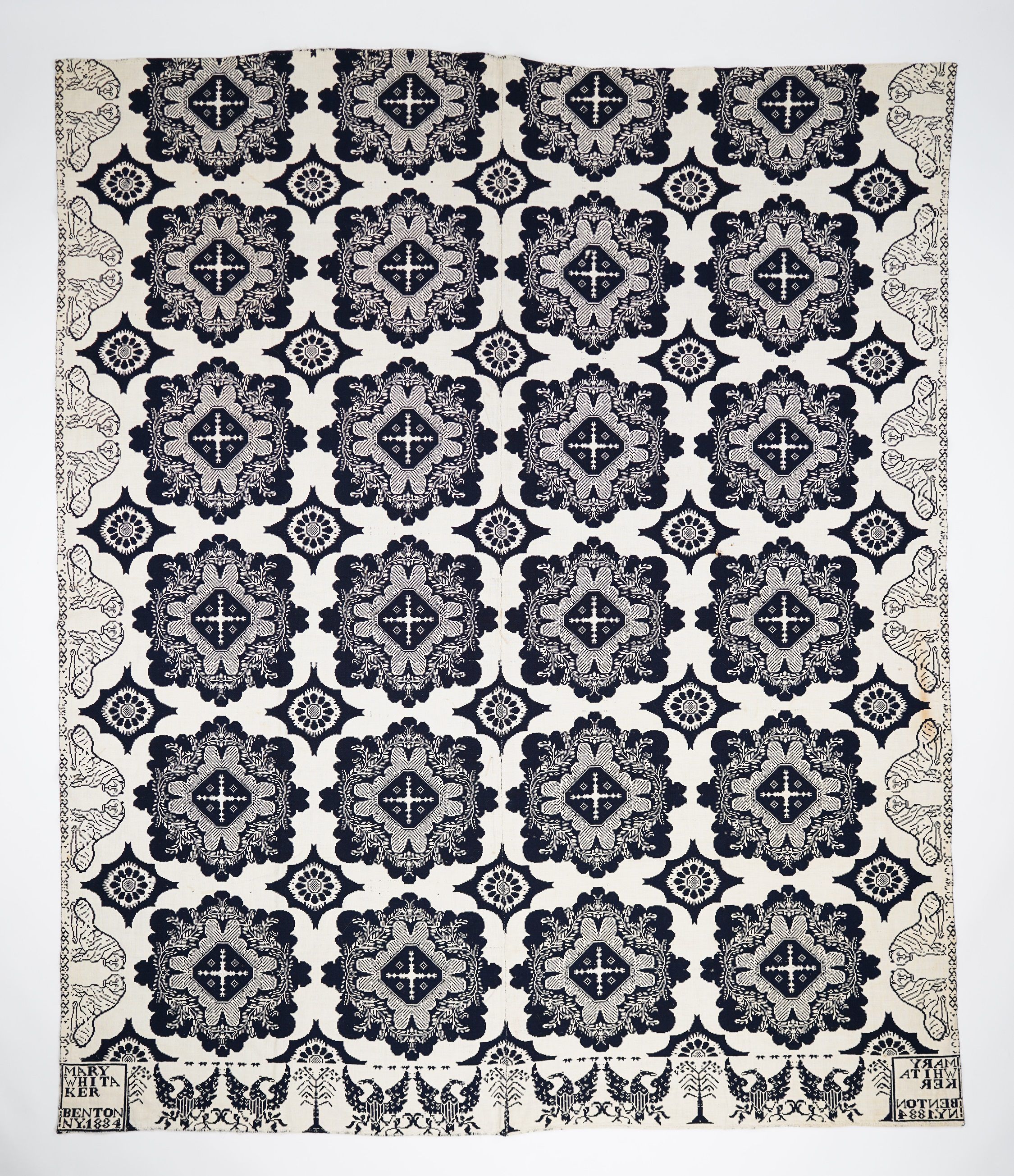 Navy and natural figured double weave coverlet; two panels joined by a center seam; no fringe; shielded eagle border on bottom; tiger border on sides; abstract medallion centerfield pattern.