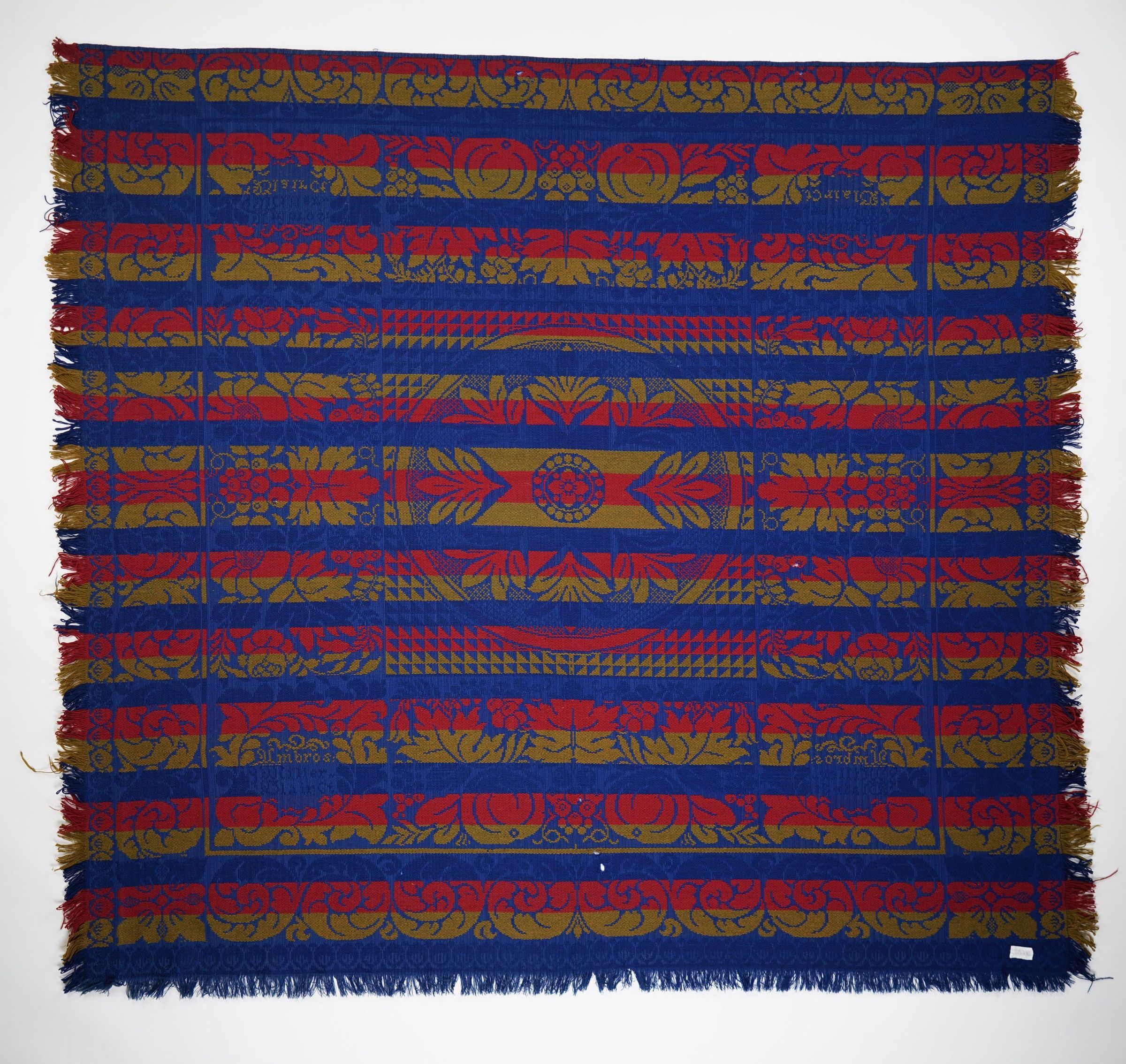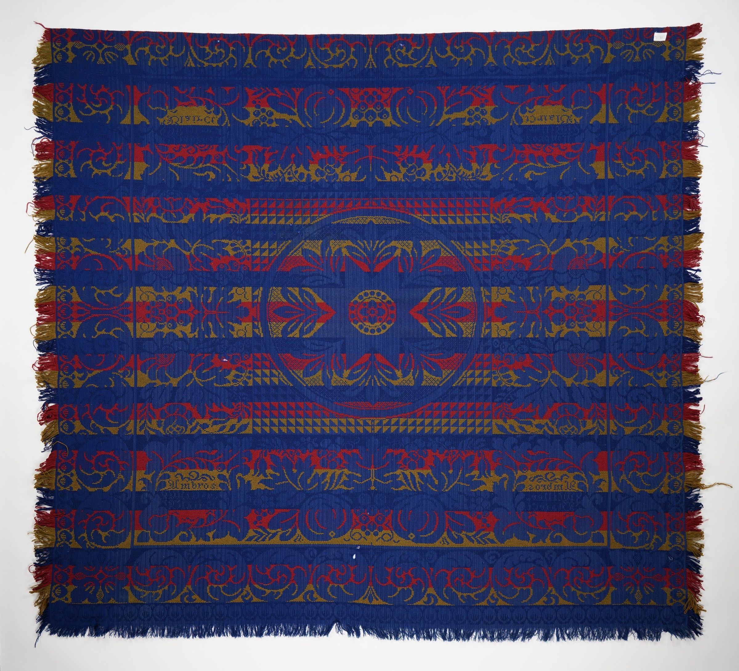 red, green, navy, blue; border on 4 sides; fringe on 3 sides; large swirls; center has large star medallions, grape vines, and inscription. Self-fringe on three sides. Seamless.Collection