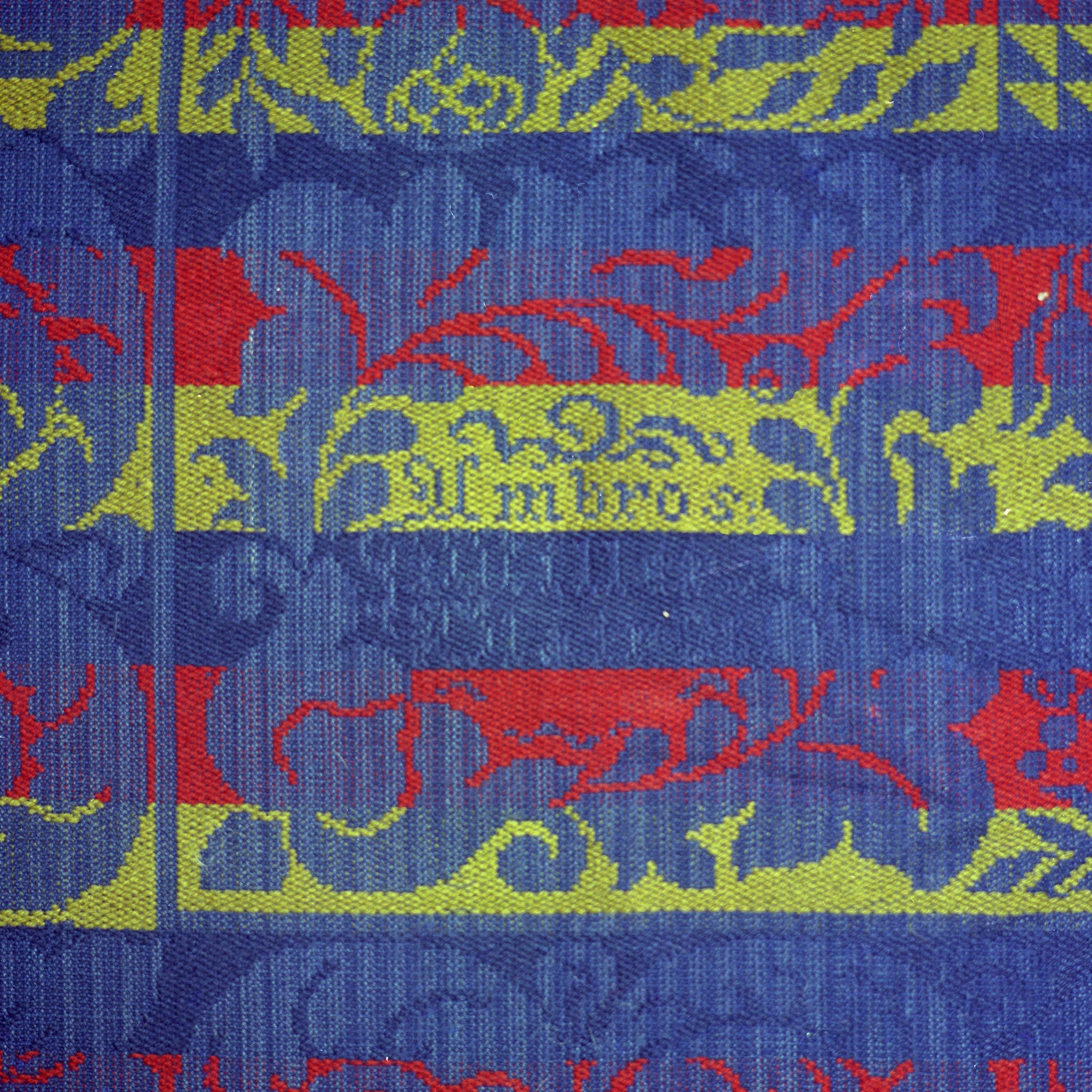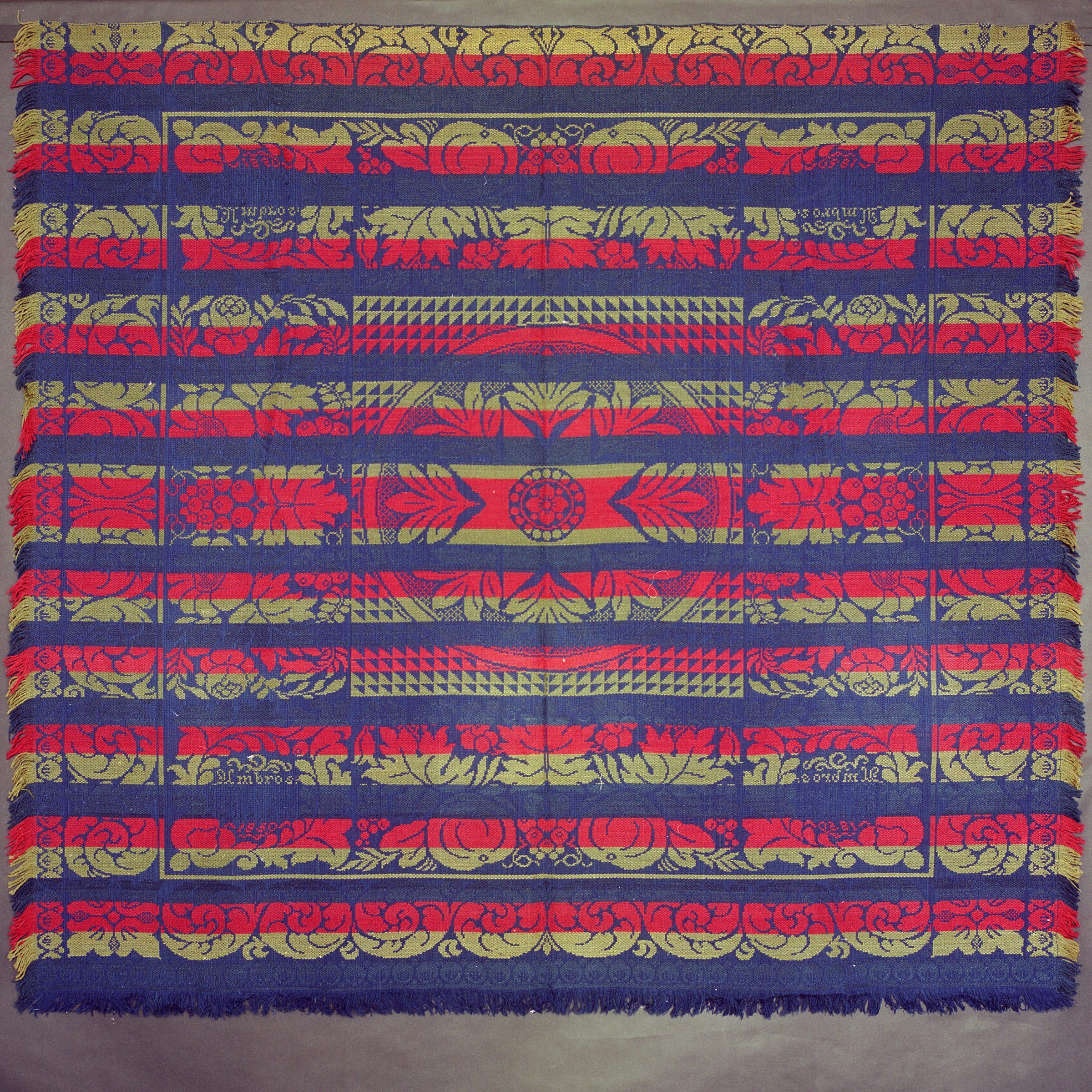Tied Beiderwand, red, green, navy; seamless; border on 4 sides; fringe on 3 sides; centerfield pattern of medallion stars, grapes, flowers, prominent blue stripesCollection
