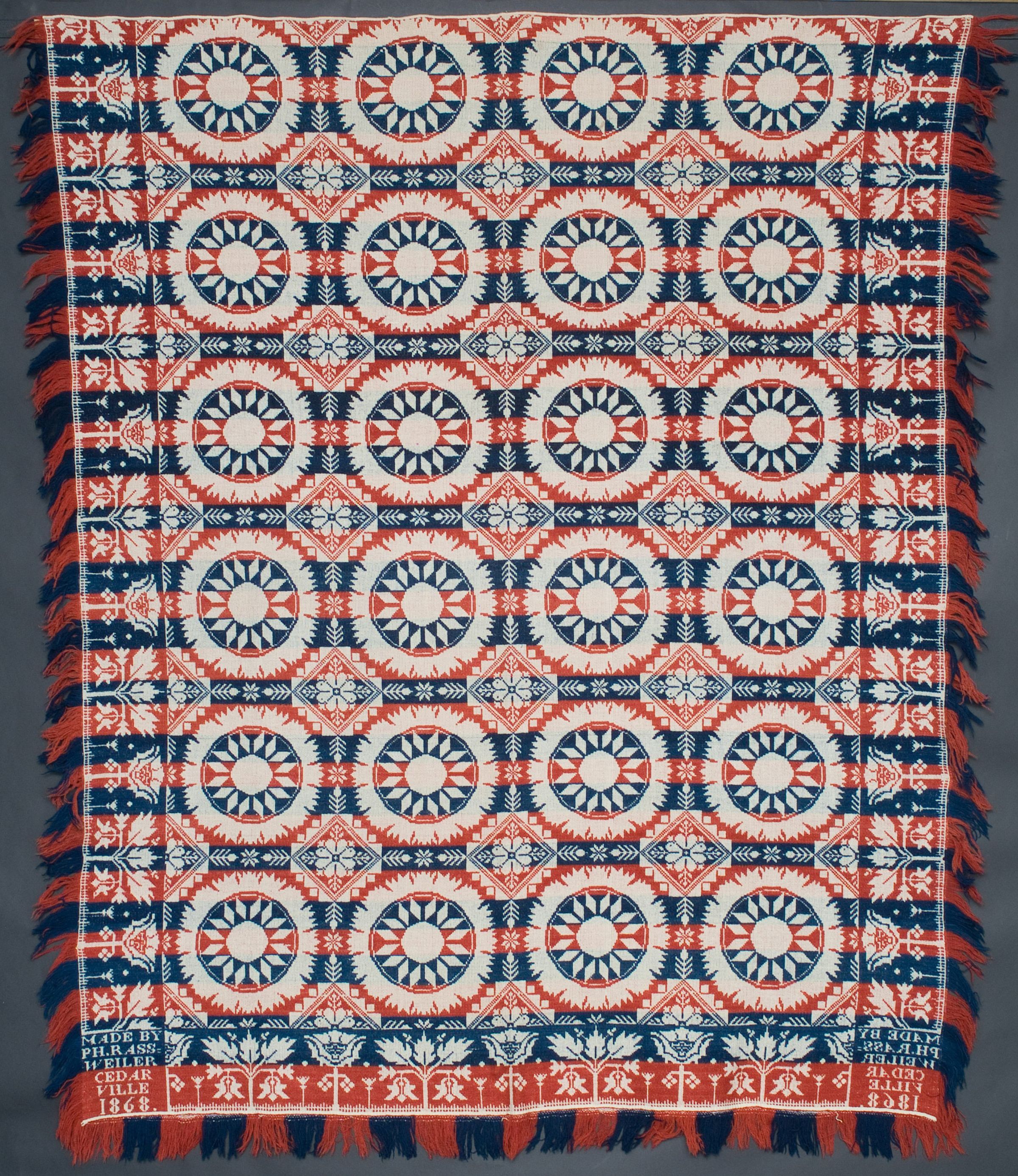 Beiderwand; blue, red, and natural; center medallion; floral and leaf motif; red and blue stripes; fringe on 3 sides; seamless; signature corner blocks on LL, LRCollection