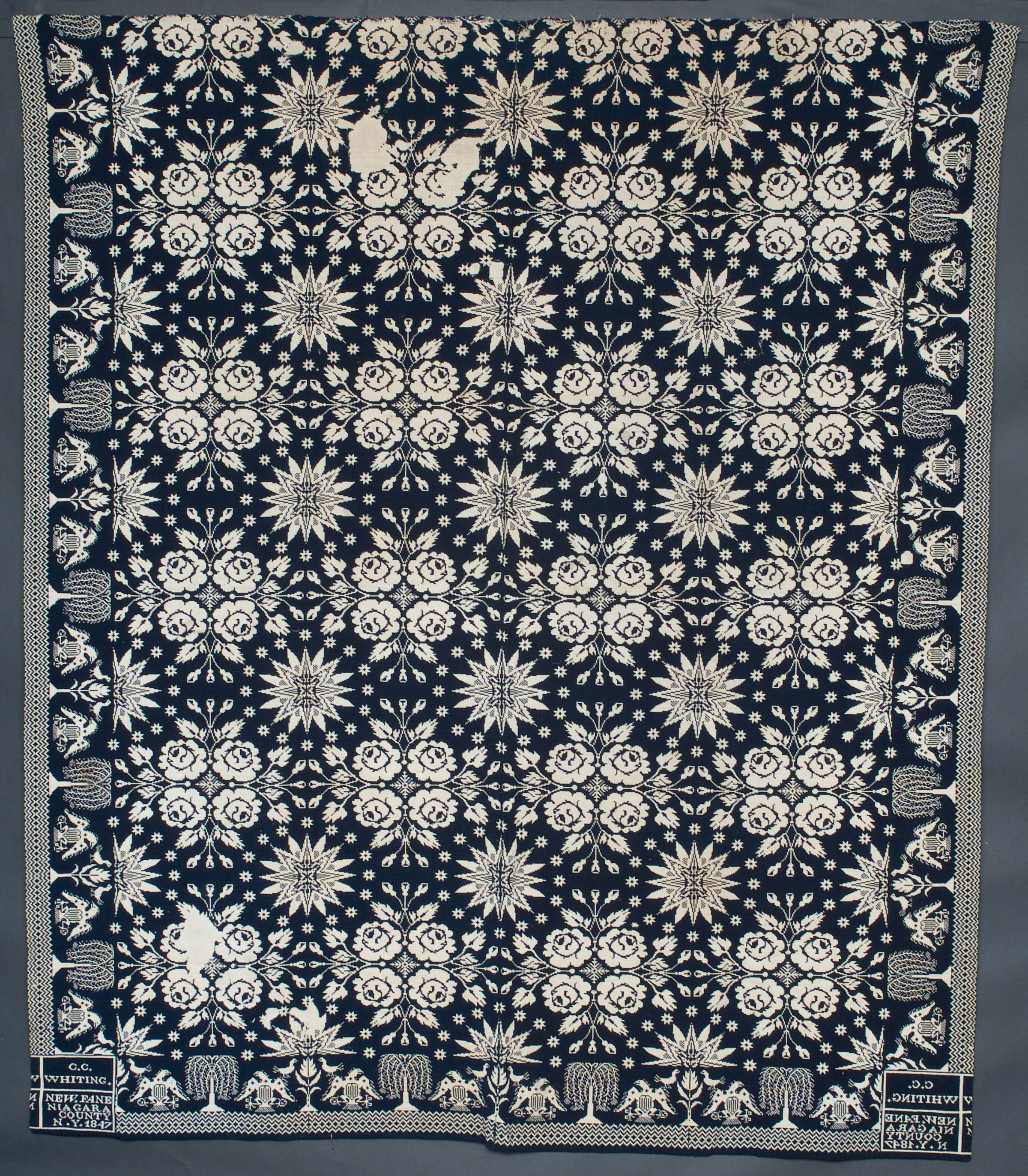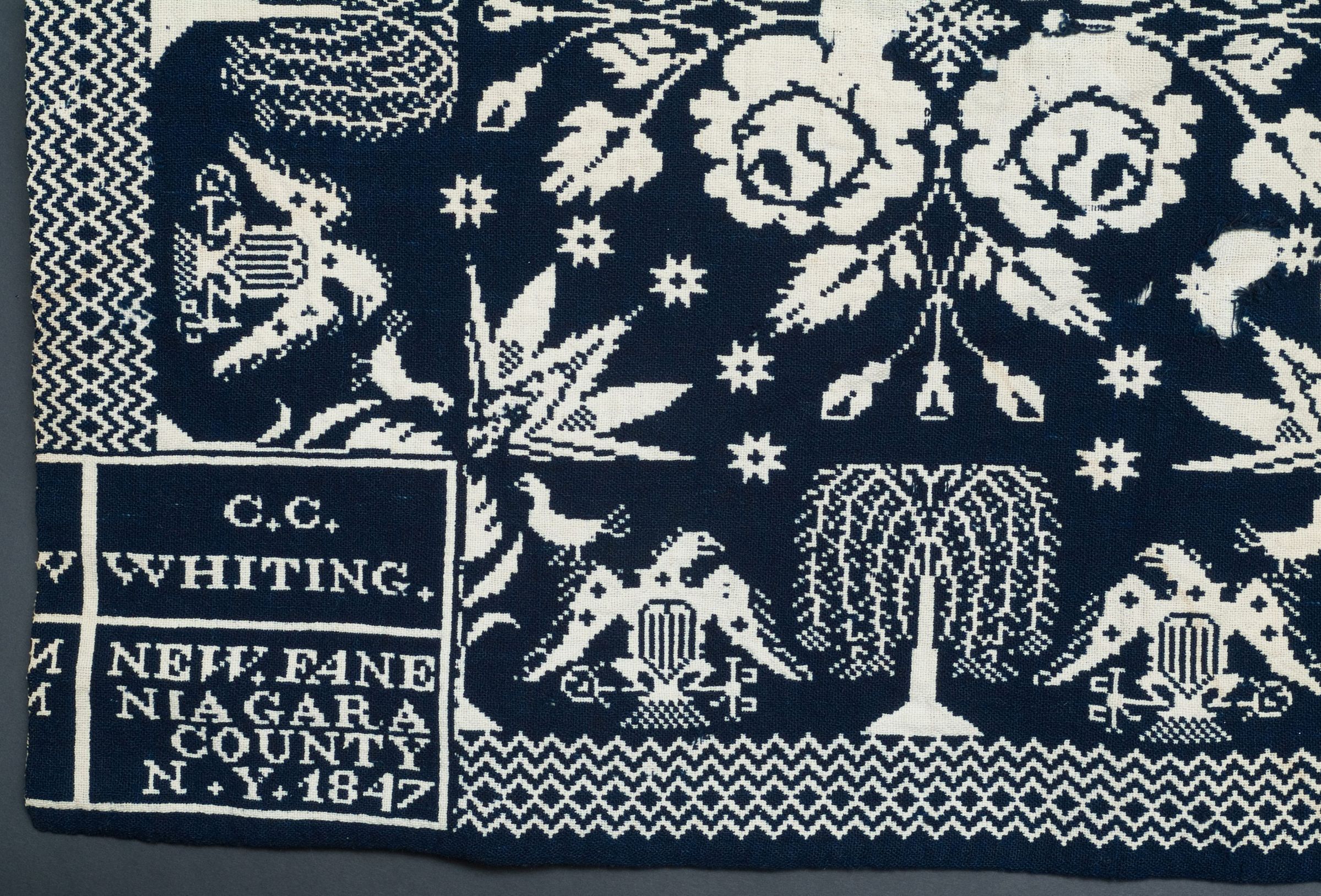 double weave; navy and natural; two loom widths joined; no fringe; repeating eagle and tree border; floral centerfield; signature corner blocks in LL LRCollection