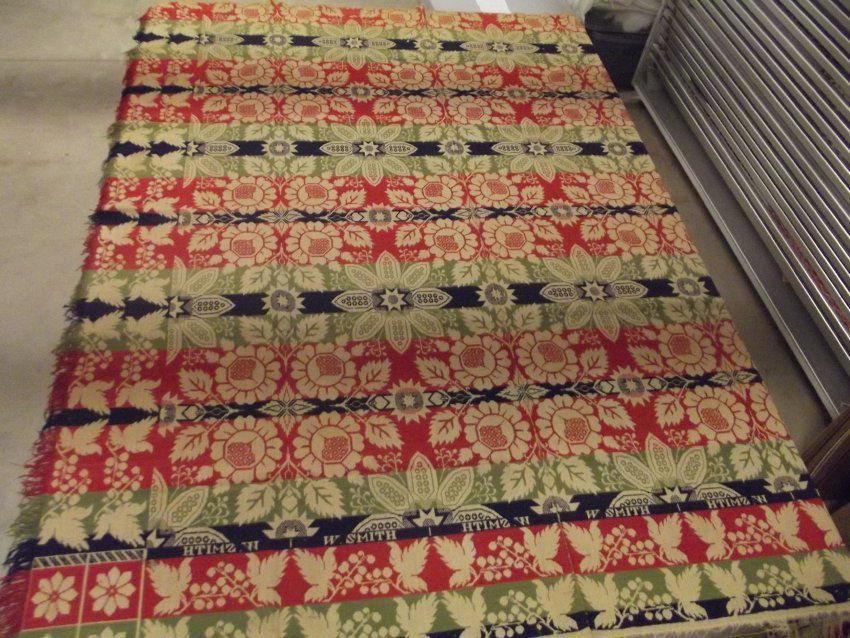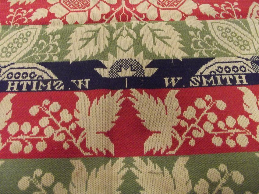 Tied beiderwand; No cornerblock; weaver's name is located about eight inches from the bottom; left and right sides have red, blue, and green fringe, bottom side has white fringe; grapevine double border, stylized four roses centerfieldAcquisition