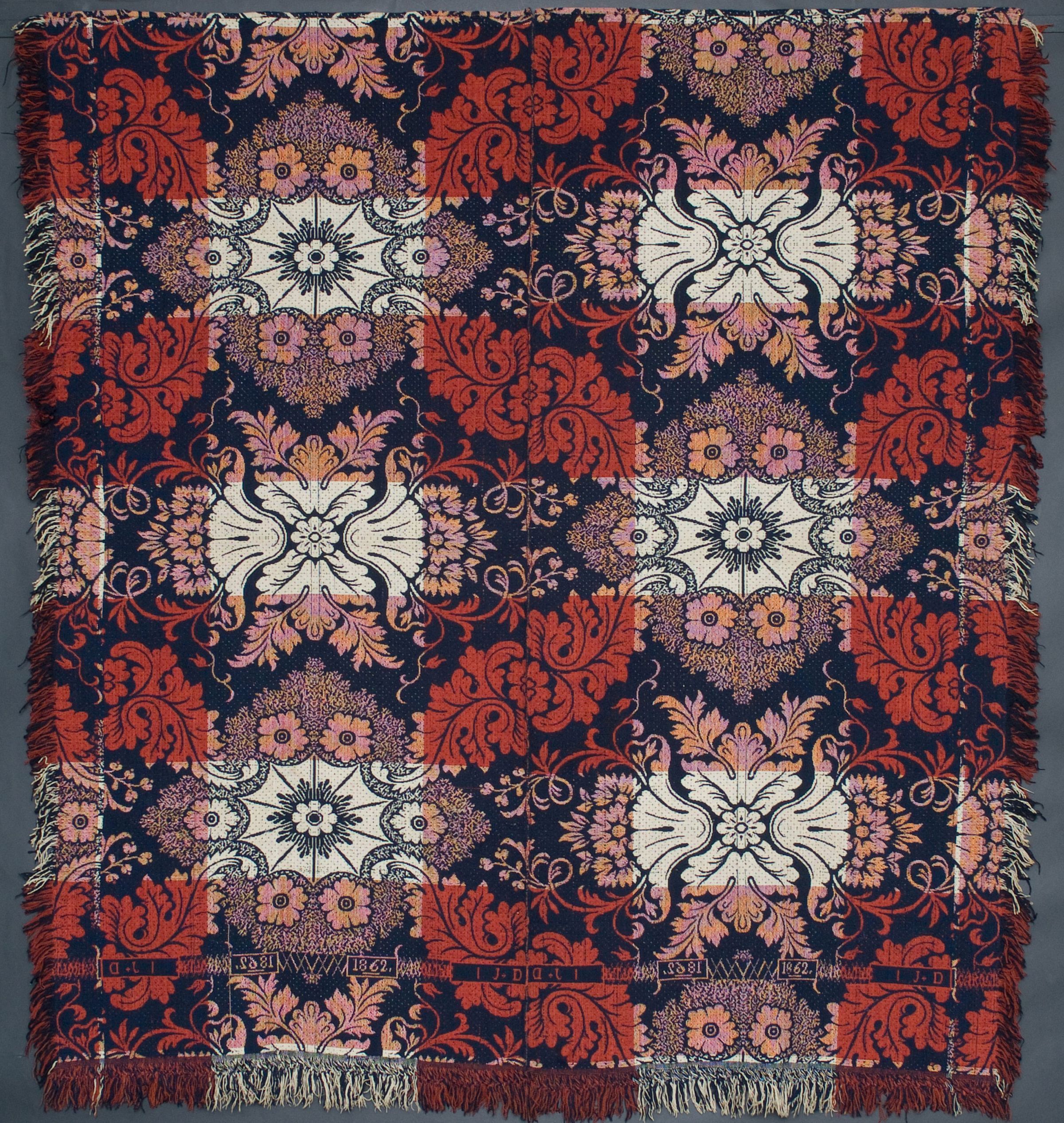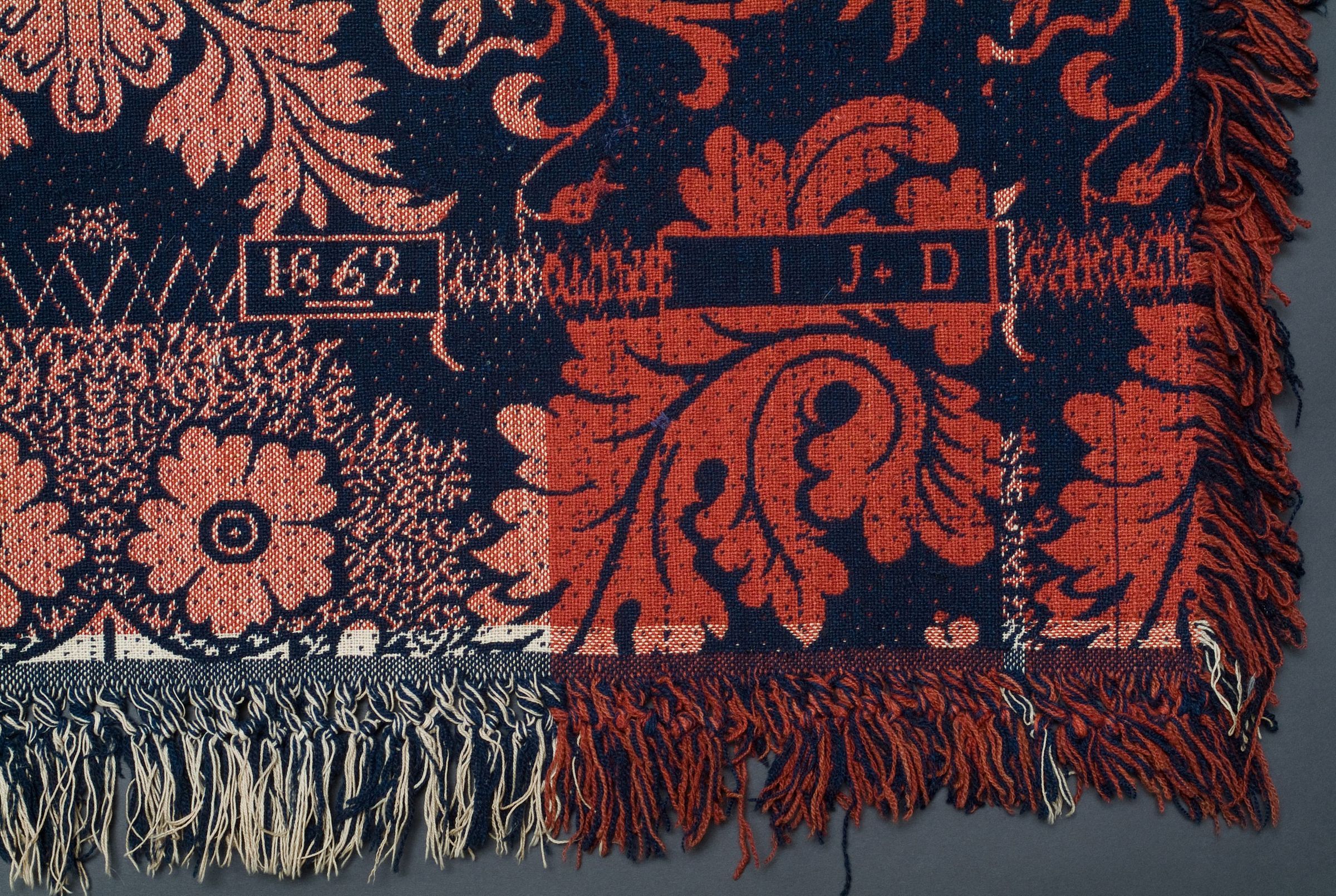 double weave; navy, natural, red; two loom widths joined; fringe on 3 sides; floral "block" motif throughoutCollection