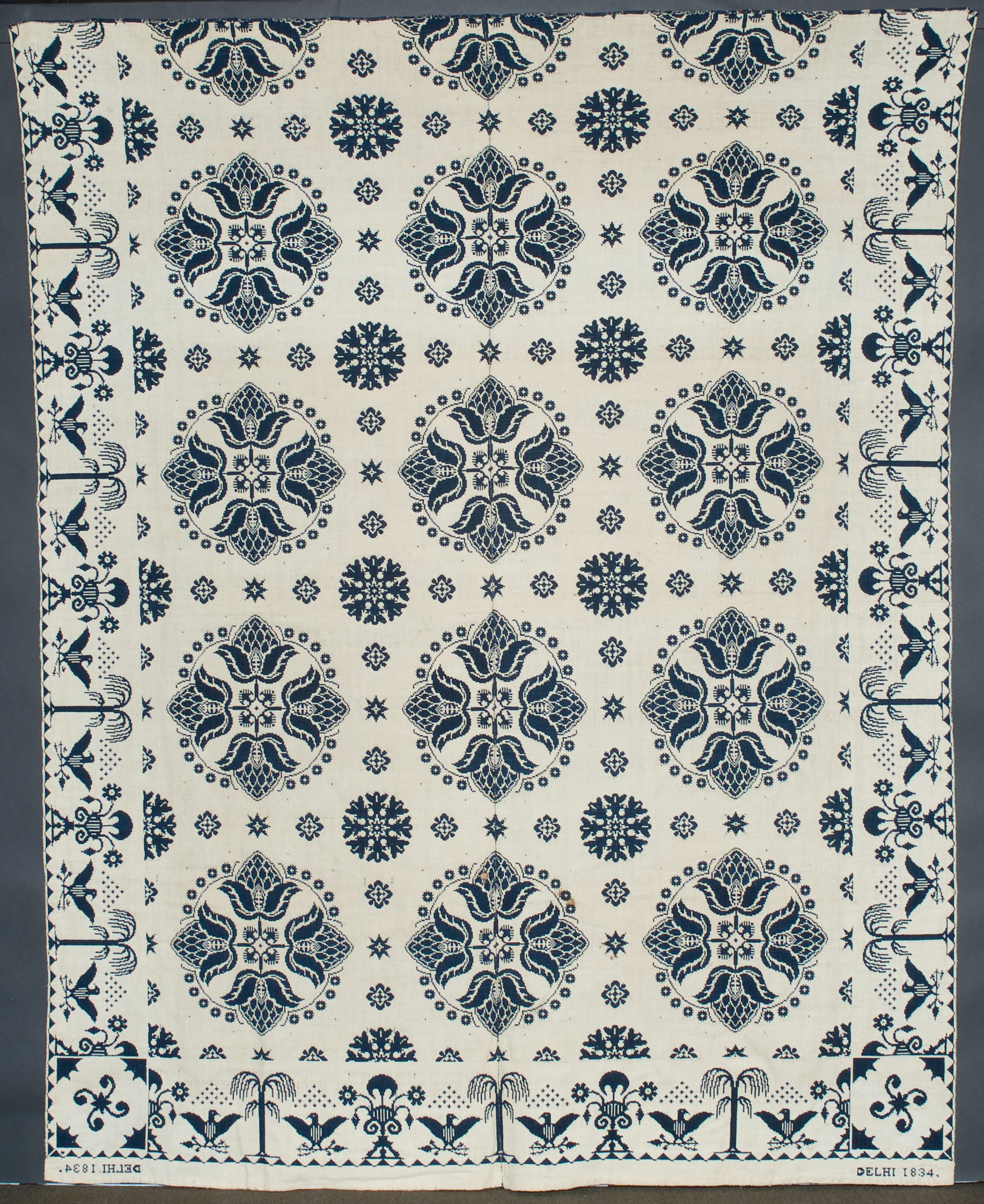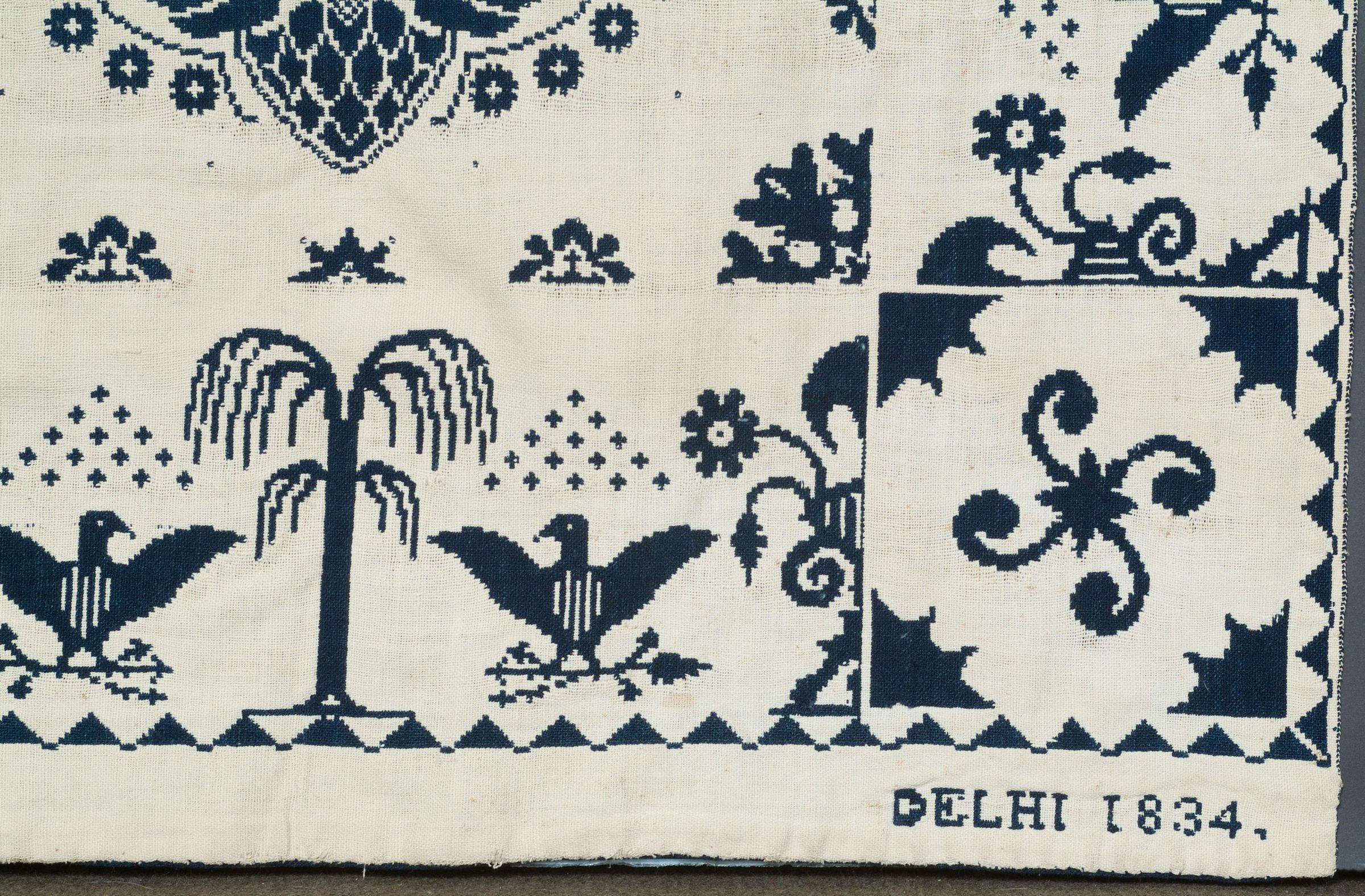 double weave; navy, natural; two loom widths joined; centerfield of quadratic floral clusters with tiny flowers and stars between; border on 3 sides; no fringe; willow trees, flowers in pots, and eagles and triangles with 15 stars above on border; corner blocks have swirly swastikasCollection