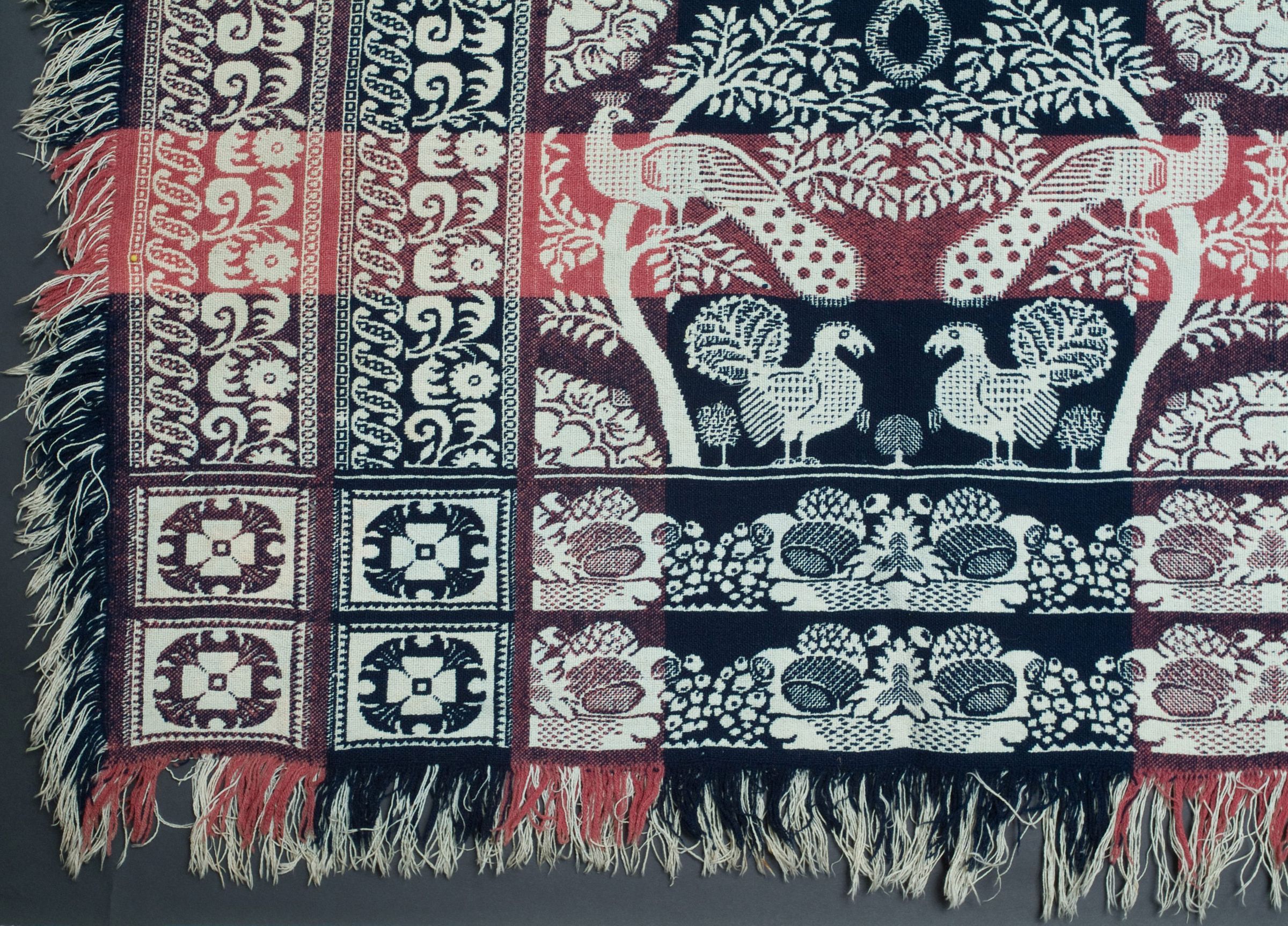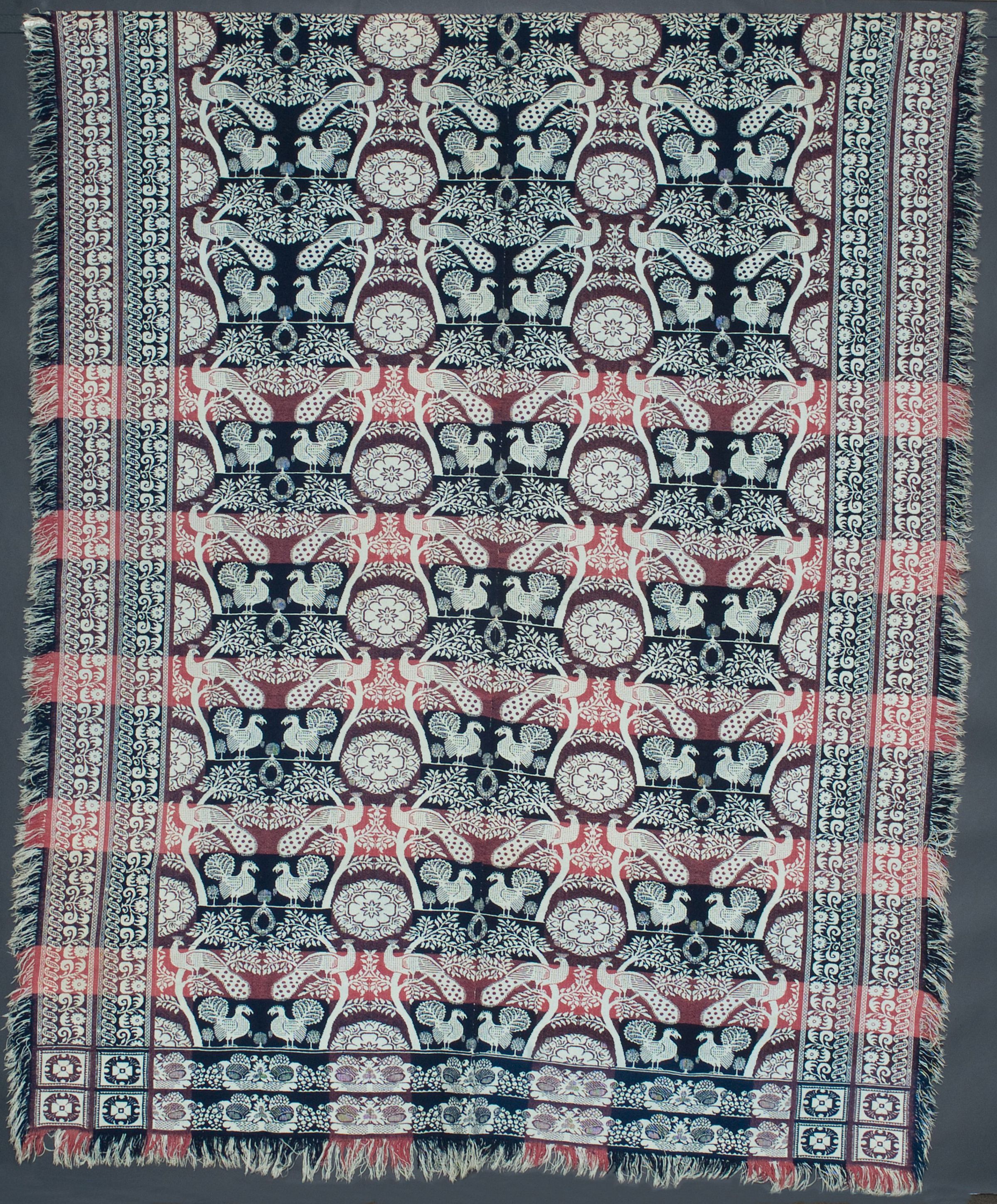 Double weave; salmon pink, navy , natural; two loom widths joined; fringe on 3 sides; double border on 3 sides, different on bottom; flowers on long sides; centerfield of trees, peacocks, and turkeysCollection