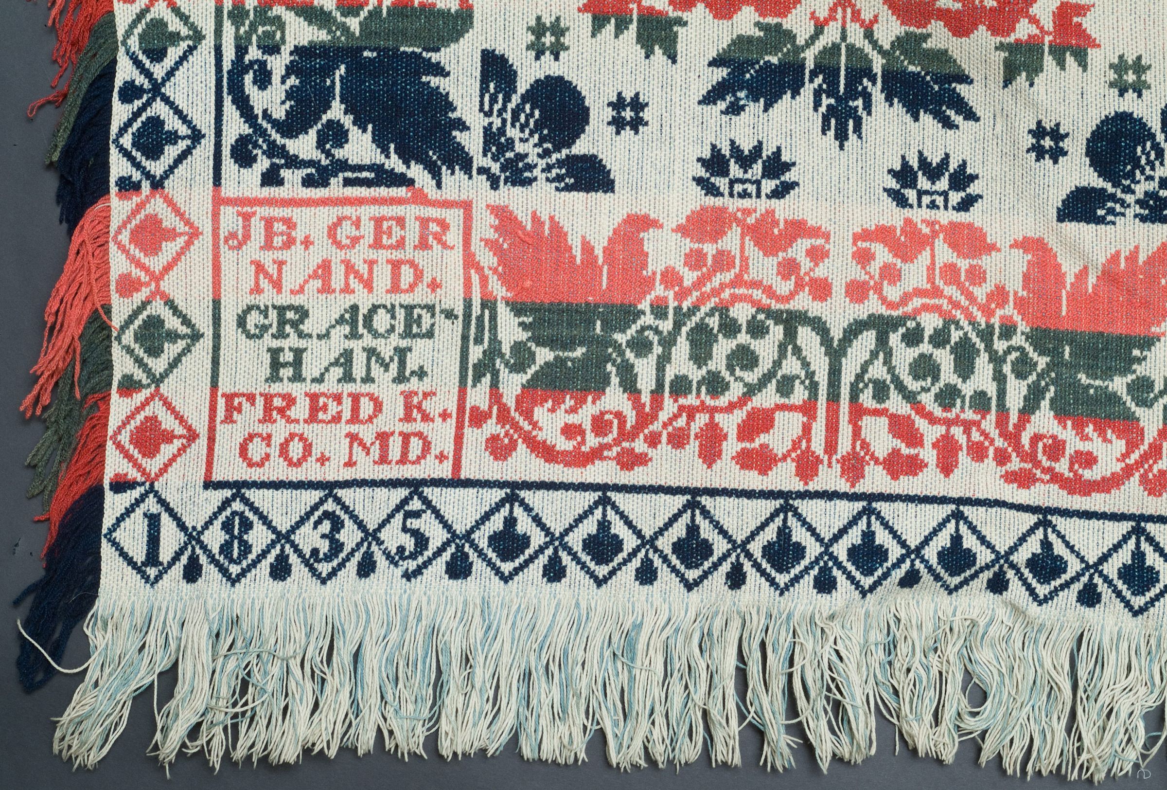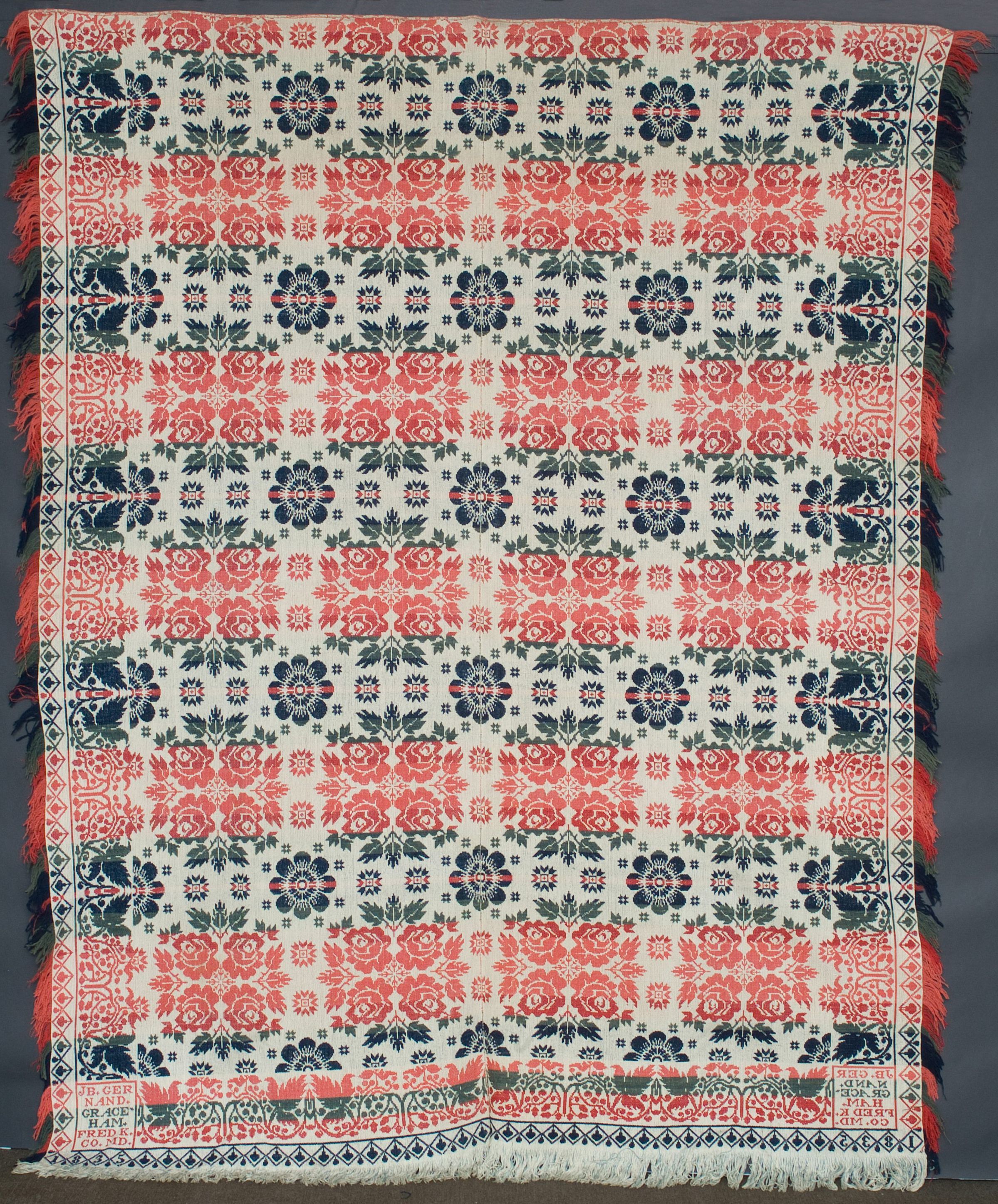 pink, red, green, navy, white; fringe on 3 sides; two loom widths; border on 3 sides of grapevine; two corner blocks; center rosette clusters with flowers betweenCollection
