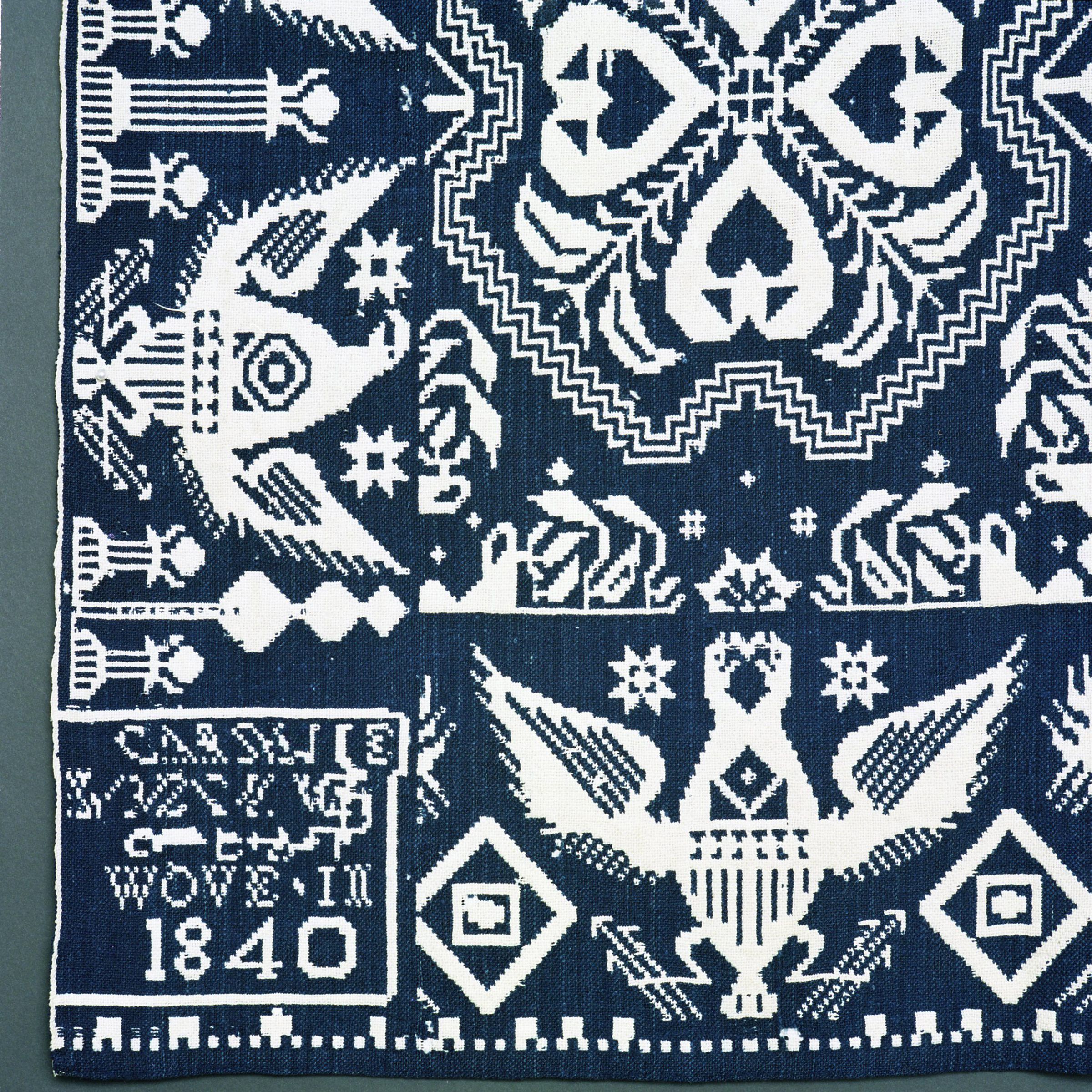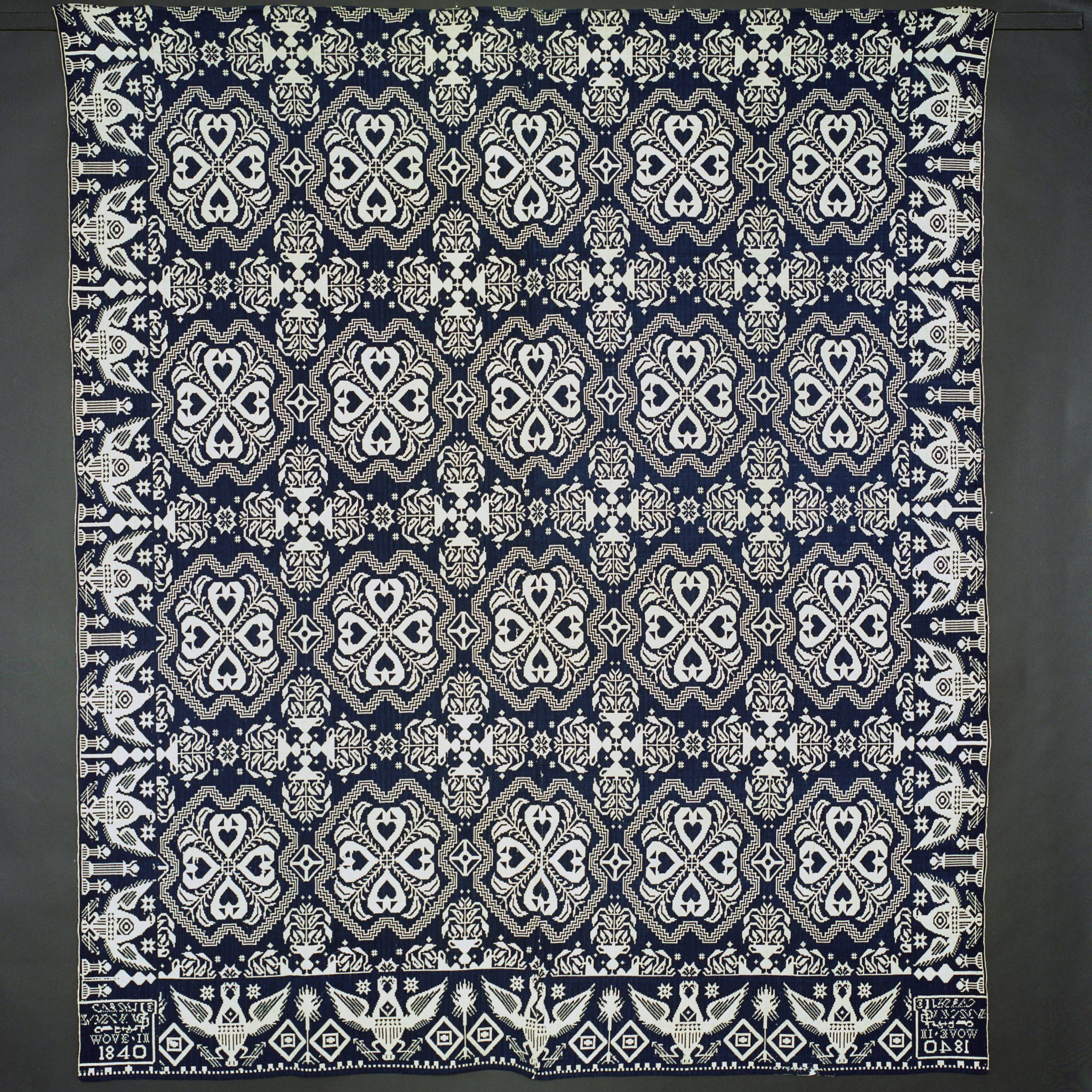 Double weave; navy (indigo according to book), white; two loom widths joined; no fringe; border on 3 sides; two long sides of spread eagles with shield body and target on chest, holding arrows and pillar between; bottom border of two headed eagle shield body, diamond on chest, masonic symbols in between; centerfield has clusters of four hearts joined at points; 2 corner blocksCollection
