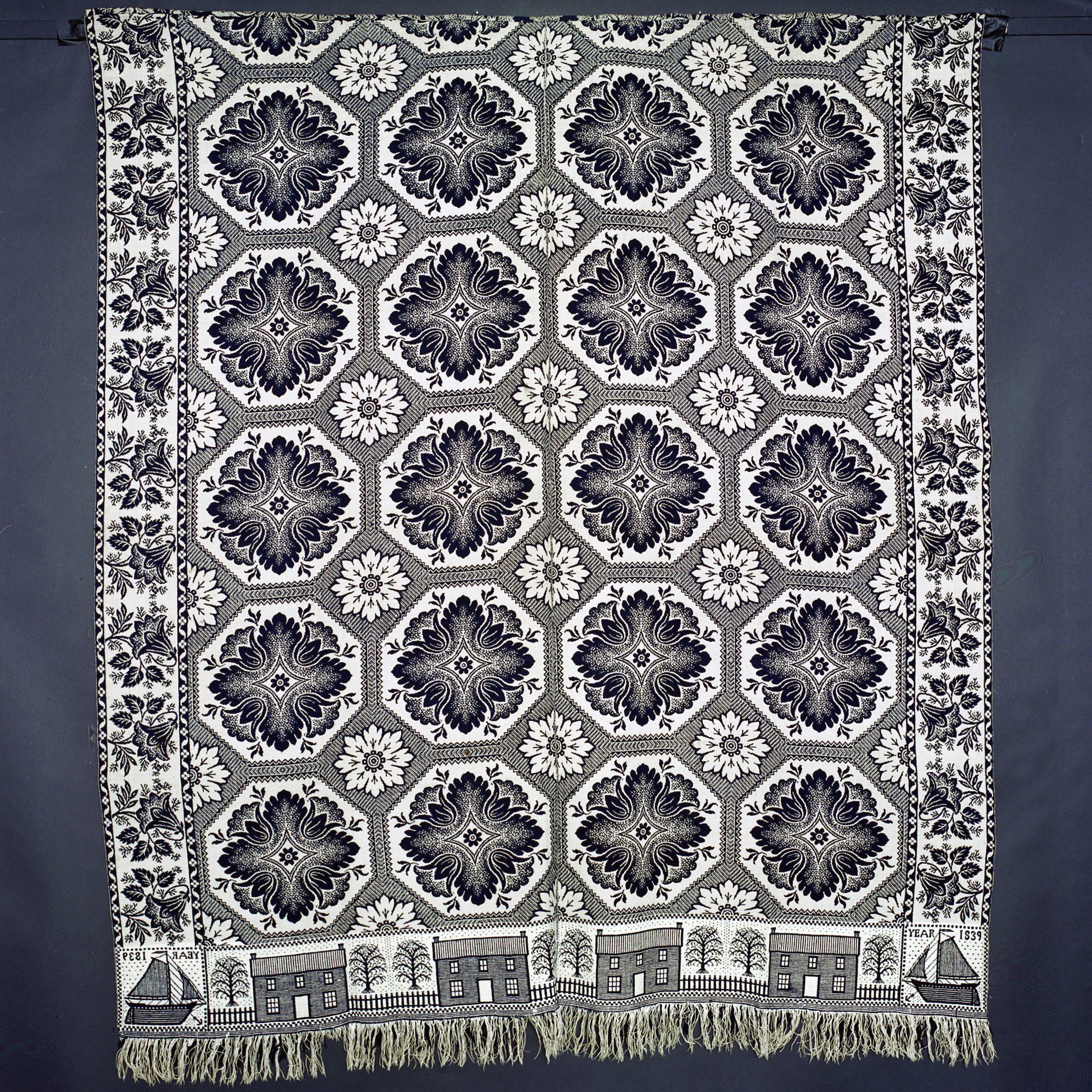 Double weave; navy, natural; two loom widths joined; fringe on one side; border on 3 sides; two long sides have lily like flower; bottom has houses with picket fence and tree in between; corner blocks have sailboat with anchor and inscription; centerfield of octagonal sections with large center of a flower inside; smaller flower between each sectionCollection