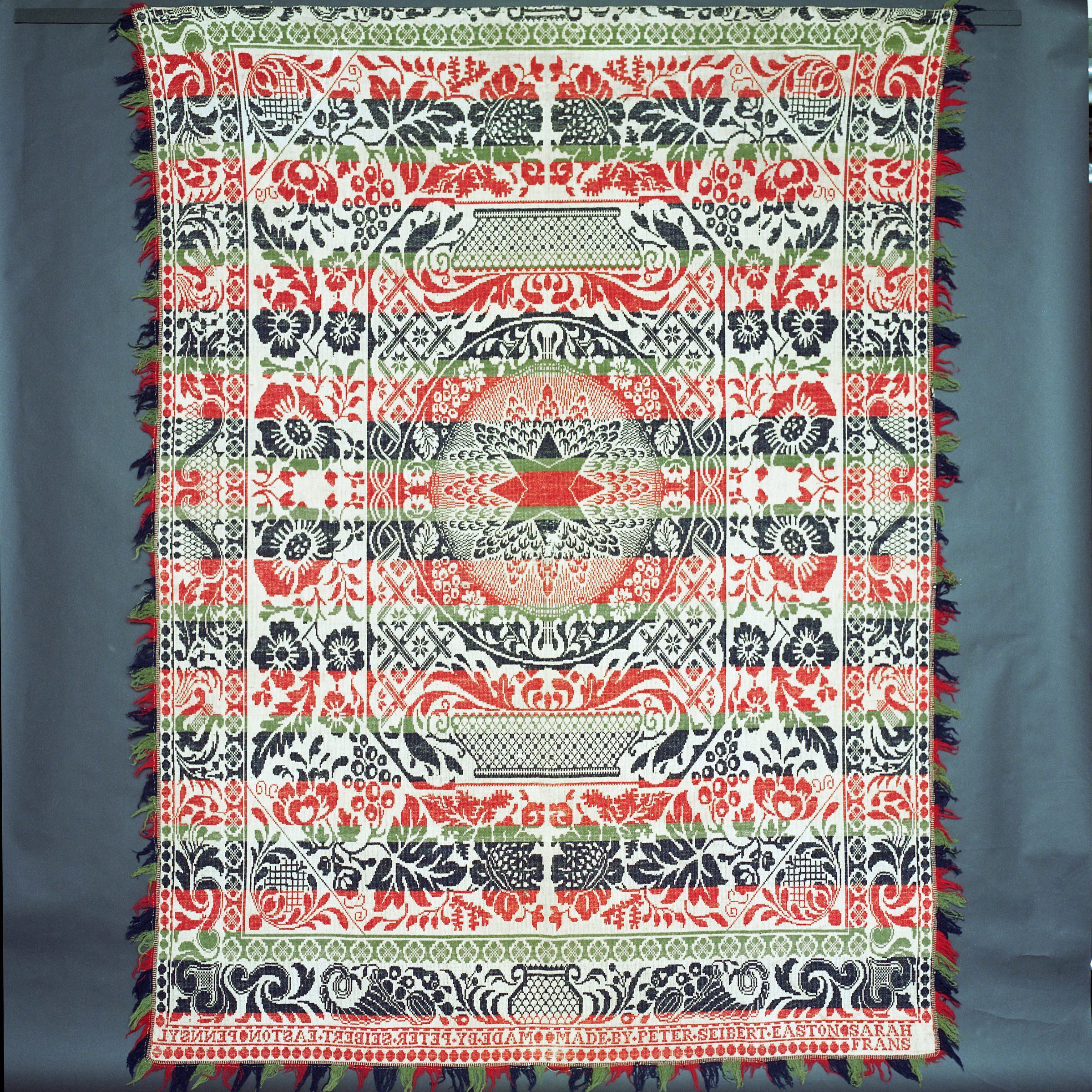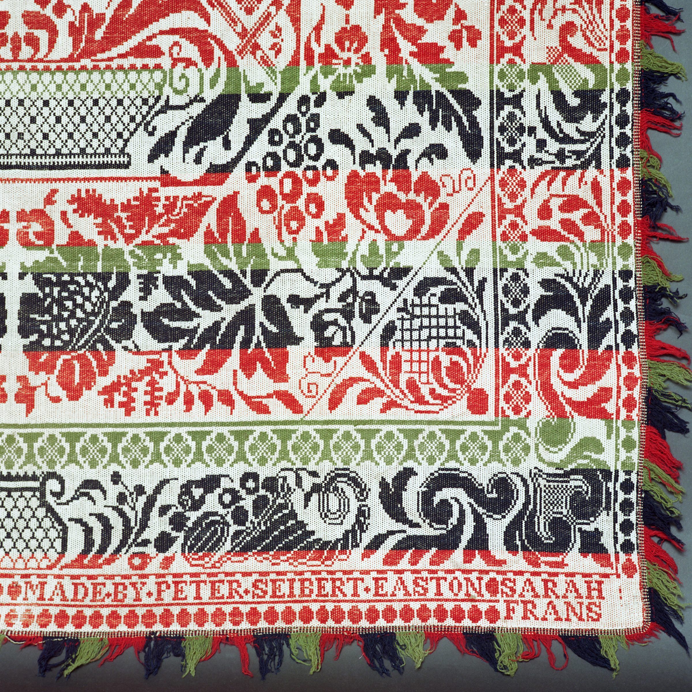 Beiderwand; red, navy, green, natural; seamless; fringe on 3 sides, border on 3 sides; lengths have scrolls and harps, bottom has central basket and cornucopias; center medallion of star in circle in octagon with large baskets above and below; bottom strip has inscriptionCollection