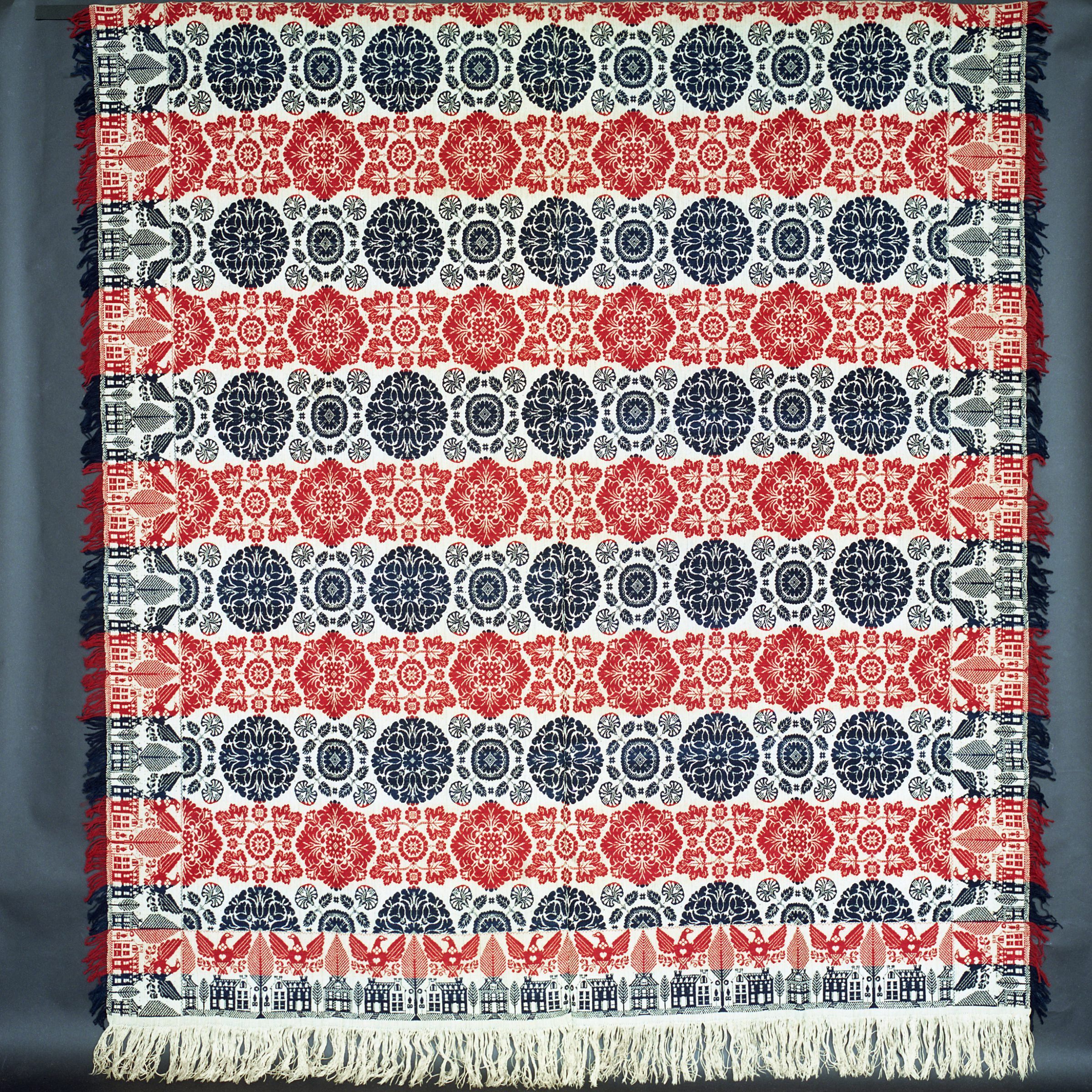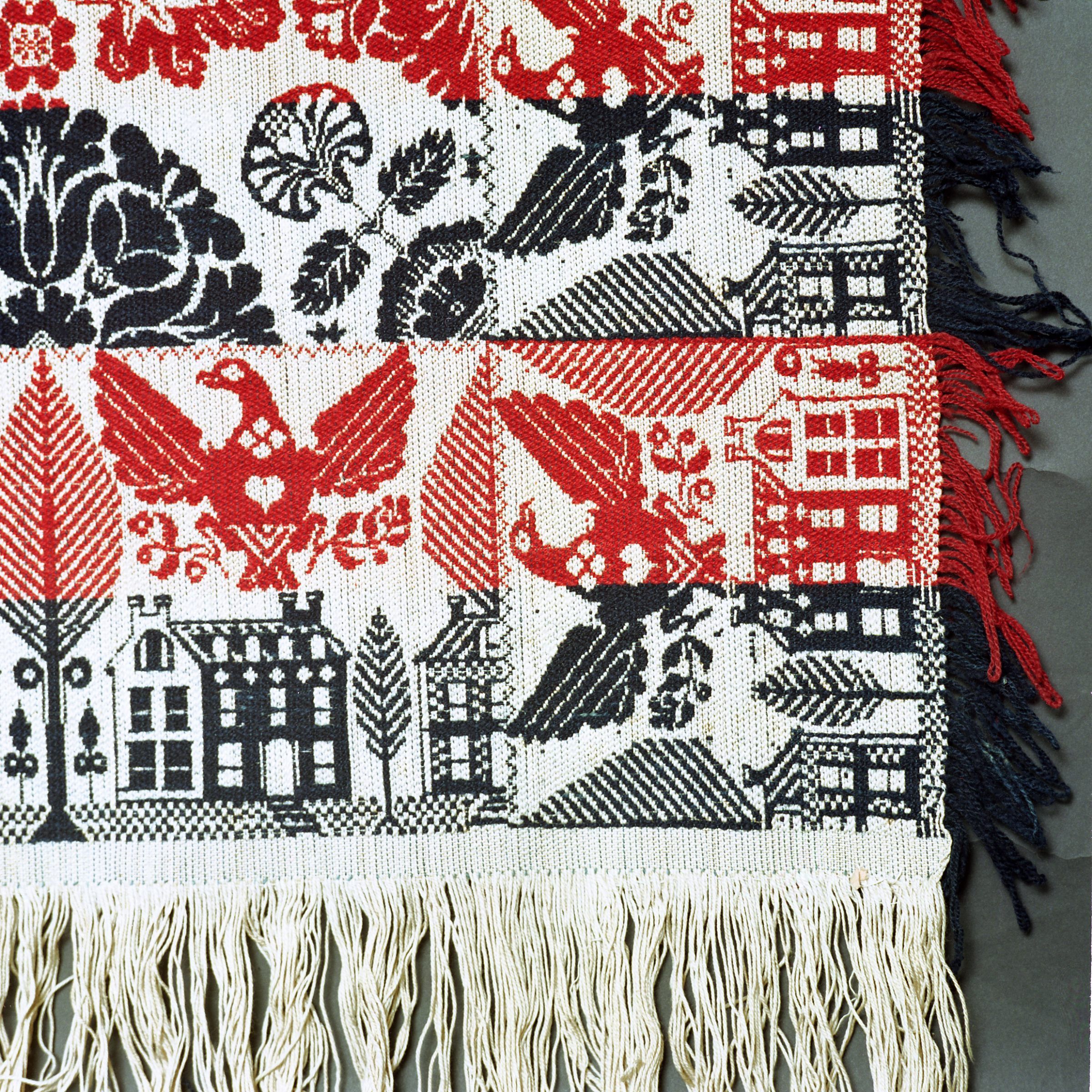 Beiderwand; navy, red, natural; two loom widths joined; fringe and border on 3 sides; border of two story buildings, eagles with hearts and trees that look like leaves, no corner blocks; centerfield of rows of floral medallions, strips of colorCollection