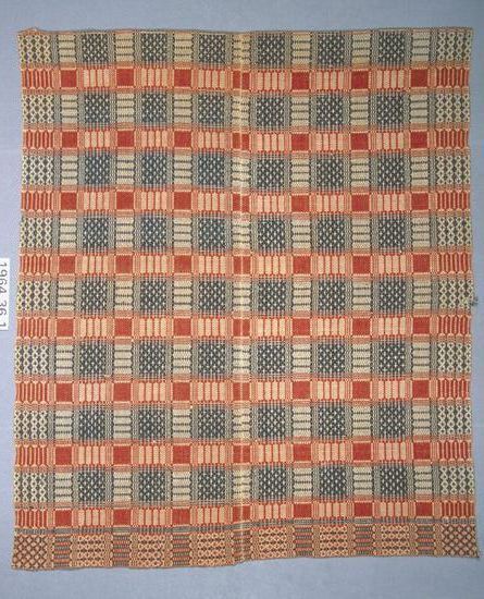 Overshot coverlet; undyed cotton and red and blue wool. Coverlet consists of two panels joined with a butted seam; the stitching and matching thread suggests that the seam is original. The edge finishes consist of two selvedges and two narroqw turned back hems on the warp ends. The main design motif is a 6 inch blue and white block which alternates with a smaller red table; the overall effect is one of red stripes alternating with a stripe of blue and white. There is a 6 inch boreder on three sides.Collection