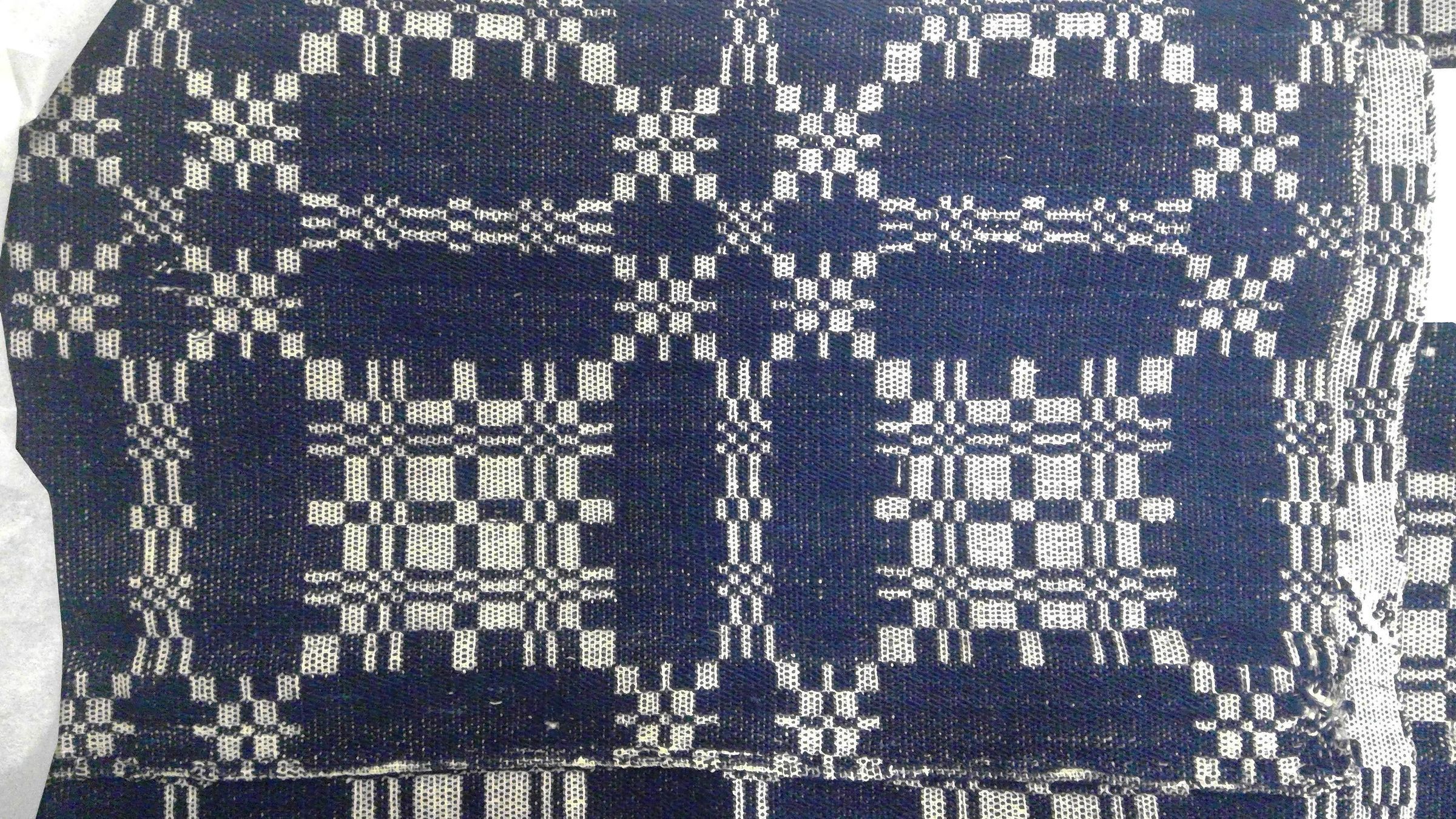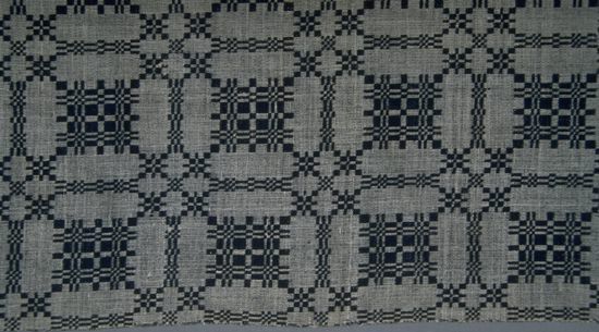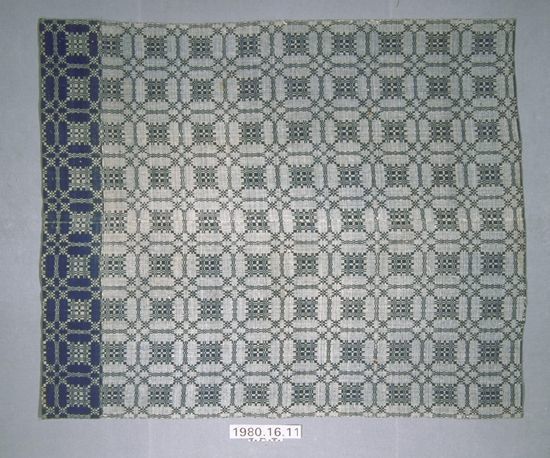 Summer and winter coverlet; undyed cotton and blue wool. Center seam joins two panels. Selvedges on either side; top and bottom hemmed. One edge has a deep hem made by the addition of a piece of the same pattern, possibly cut off the coverlet at one time. Central motif consists of a table surrounded by a ring and roses that form a cross.Collection