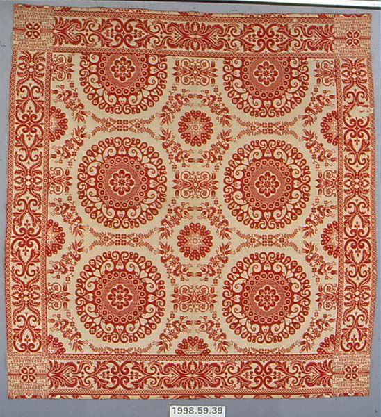 Figured coverlet; undyed cotton and red wool, double cloth. Selvedges on either side; hemmed top and bottom. Central motif consists of large medallions with an open petal flower in the center surrounded by a scrolling wreath design. Between the medallions are star with hearts in between the points. The stars are encircled by a floral motif. Border on all sides contain a foliage and scroll design.Collection