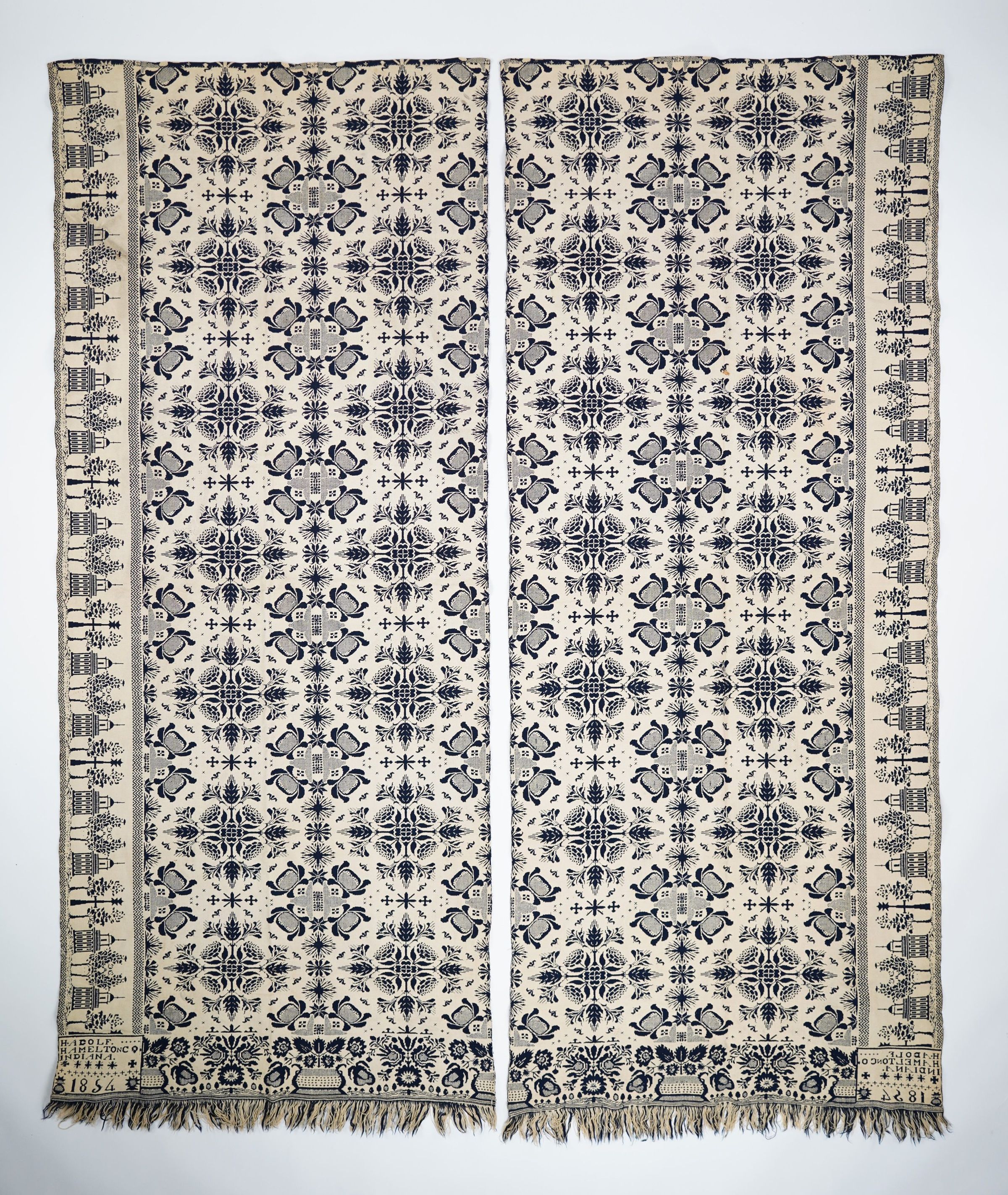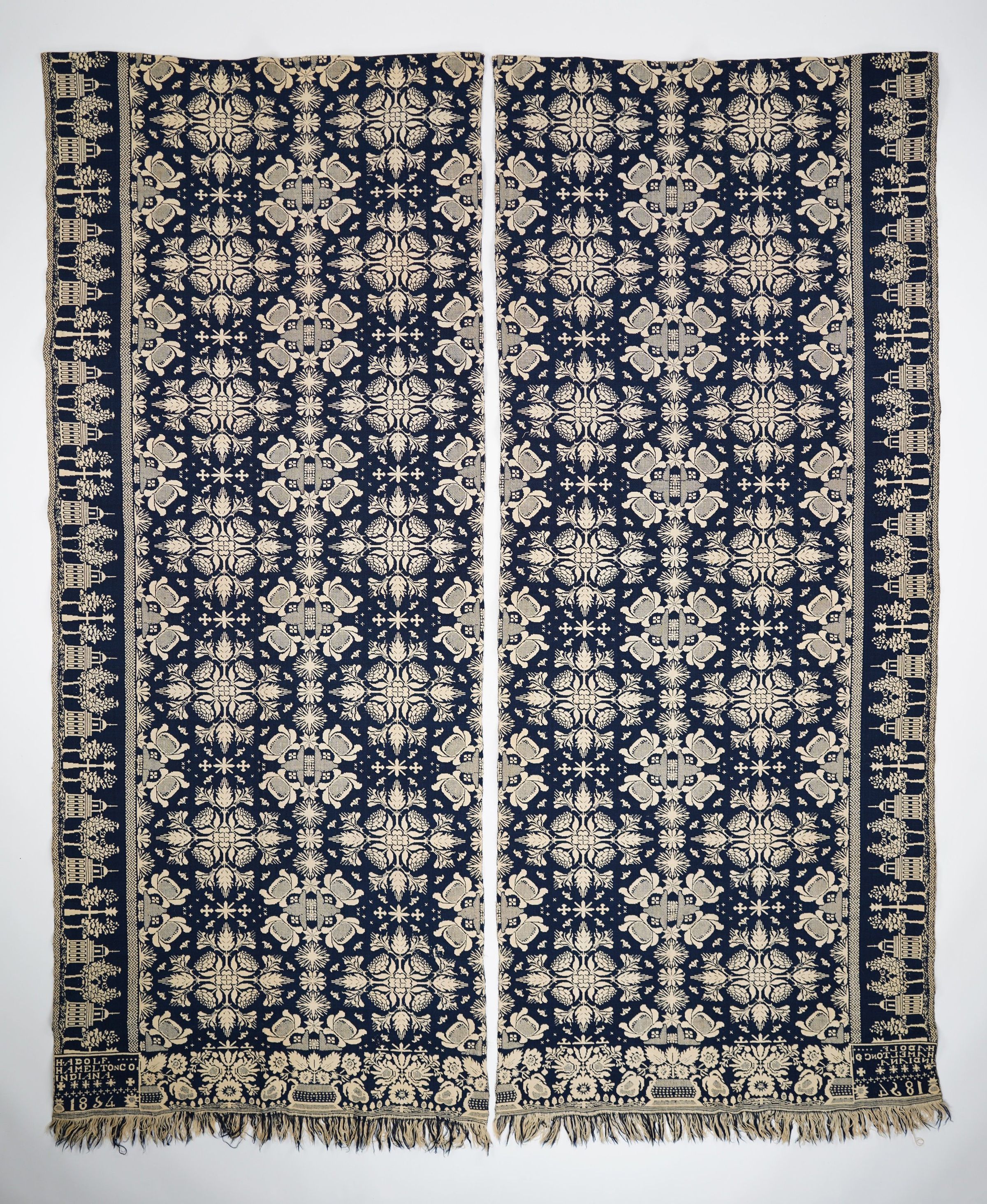 Navy and natural figured double weave coverlet; two separate panels not joined by a center seam; architectural border on sides; floral border on bottom; floral medallion centerfield pattern.Collection