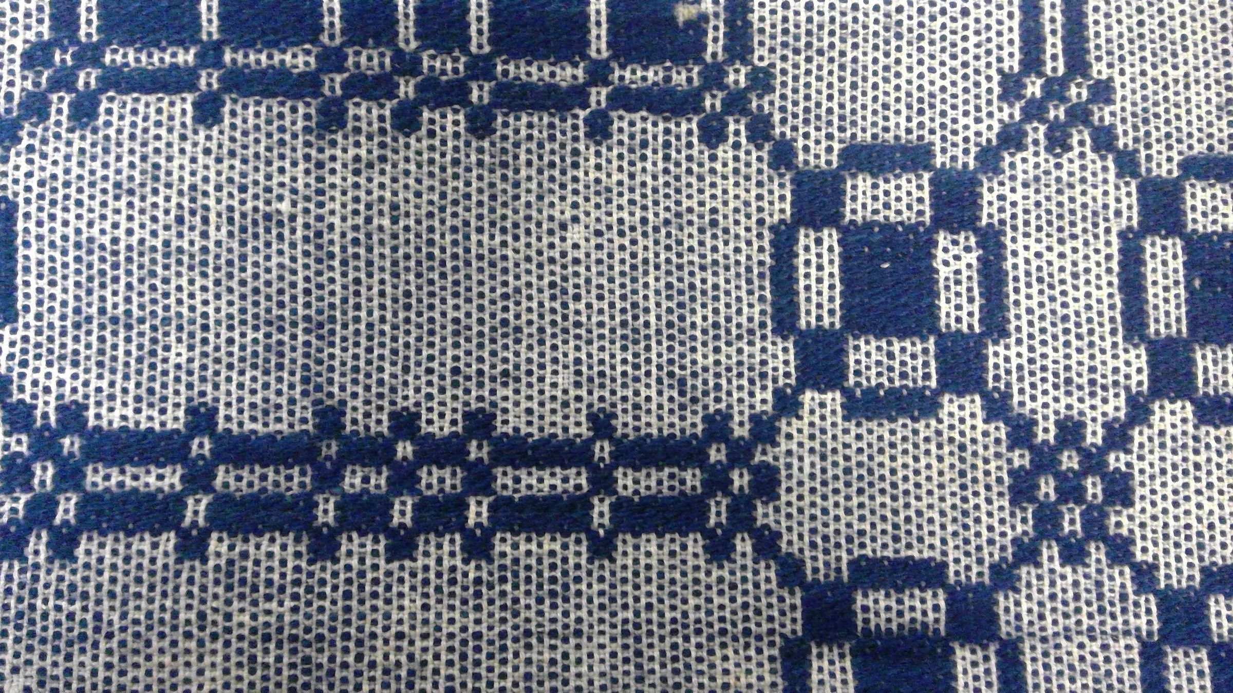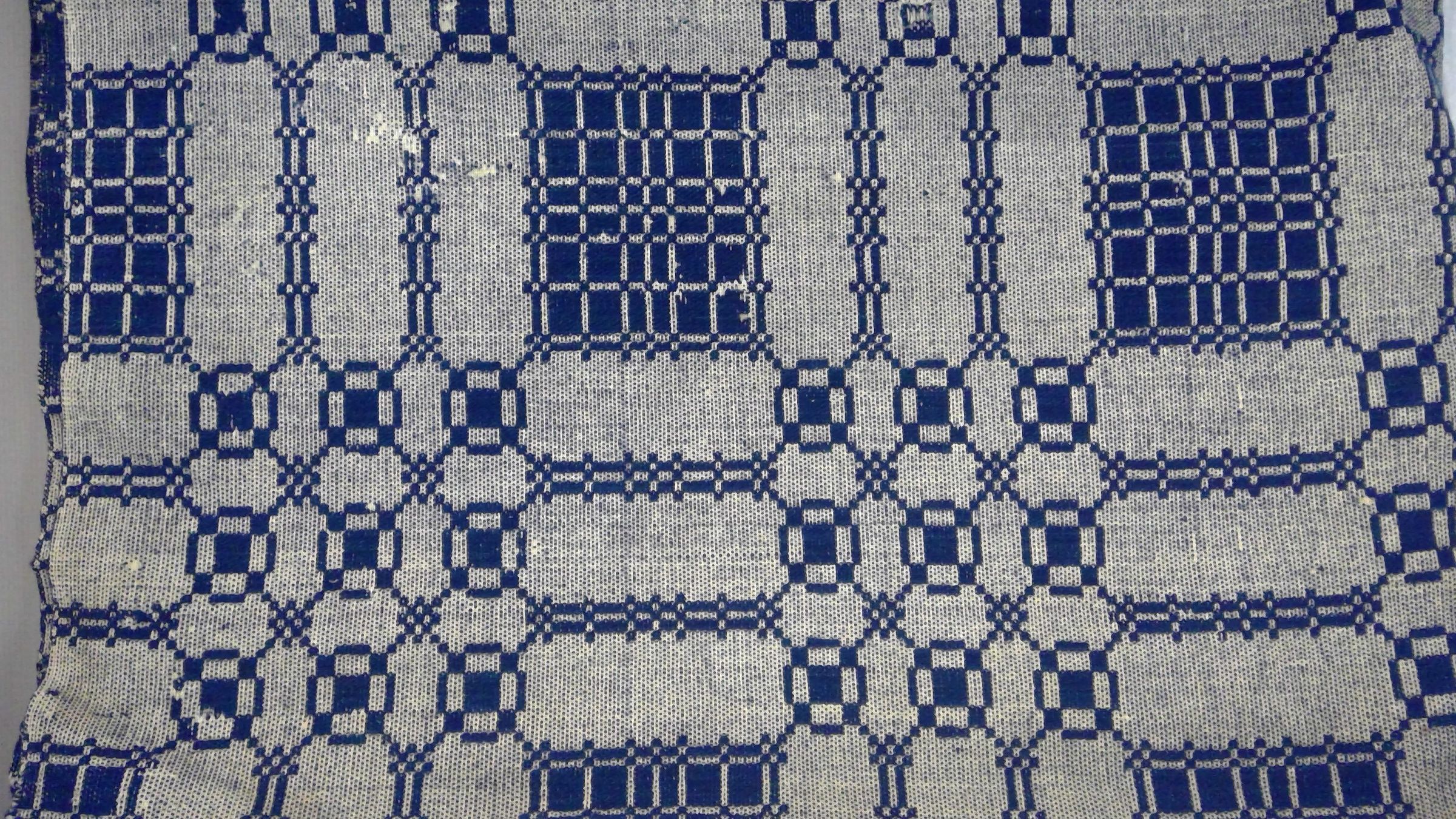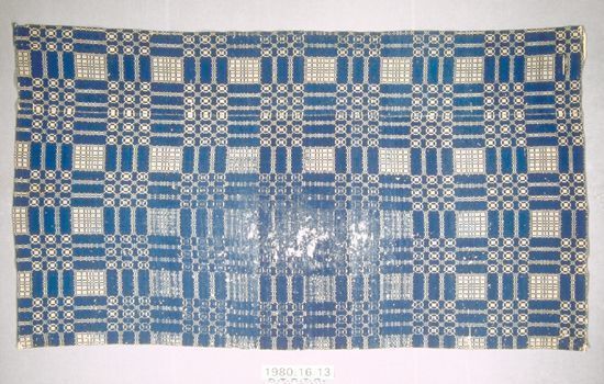 Summer and winter coverlet; undyed cotton and blue wool. Seam joins two panels, however seam is not in the center. Selvedges on one side; hemmed on three sides. Central motif consists of three bands of horizontal rectangles and a white table alternating with bands of three vertical rectangles and groupings of nine circles with squares in the center.Collection