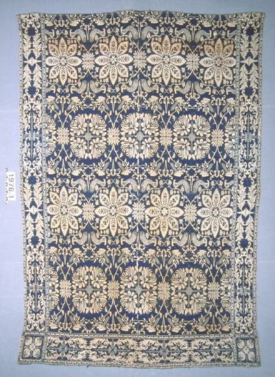 Figured Coverlet; undyed cotton and dark blue wool, tied double cloth (Beiderwand). Selvedges on either side; top and bottom edges are hemmed. The central motif has two different medallions arranged in rows; each row alternates two types of medallions. One medallion is a stylized floral motif with an encircling vine and birds; the other emdallion is a different stylized floral motif with a different encircling vine and birds; the large central medallions are seperated from one another by a 16 pt star. The side borders combine geometric forms with scrolling leafage; the bottom border is different from the sides but also combines geometric forms of scrolling leafage. The borders on all three sides are bounded by narrow inner and outer bands. The corner blocks in the bottom left and righthand corners show four stylized cotton blossoms centered around a single stylized floral motif.Collection